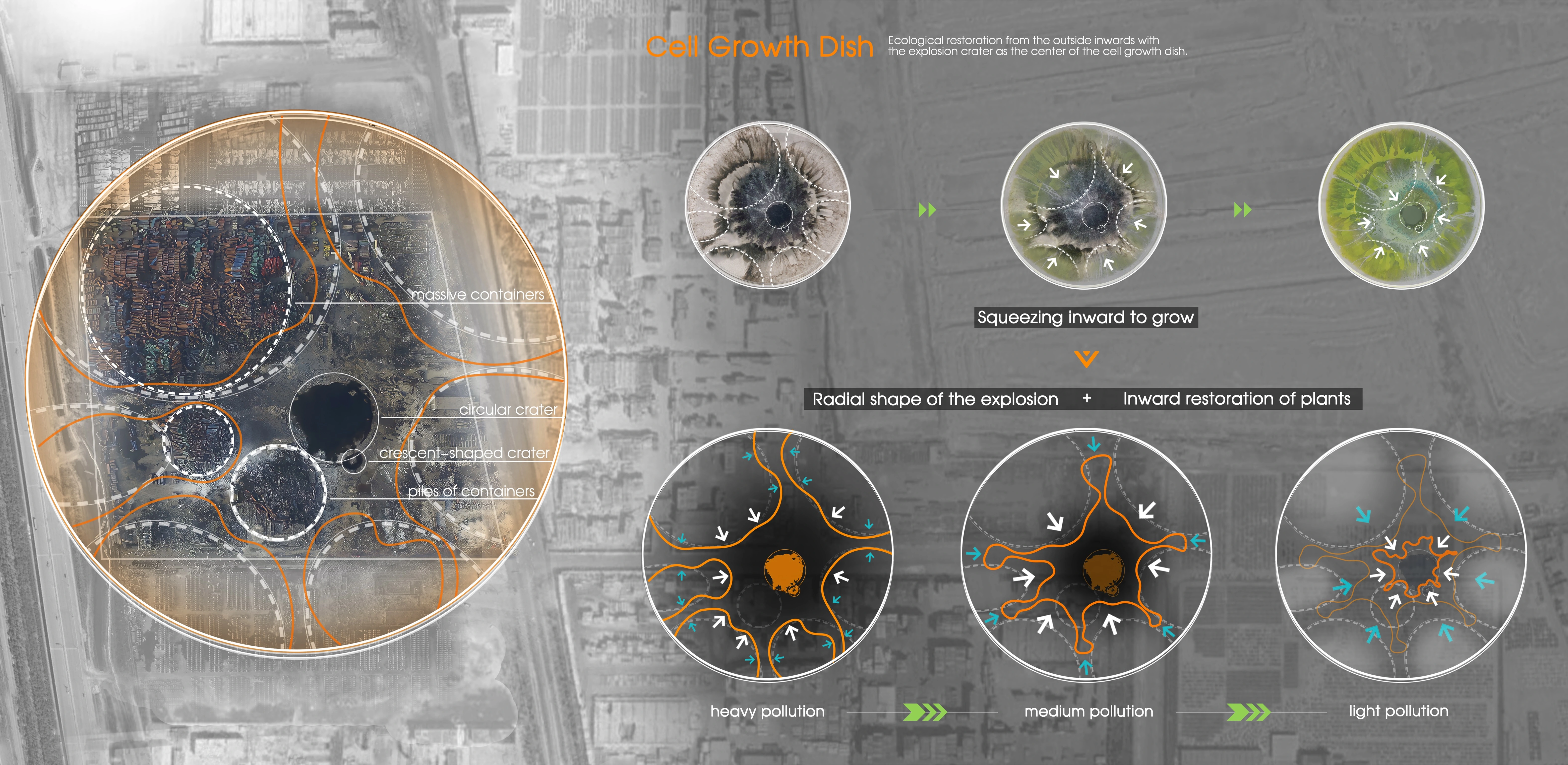 The remains of the container at the site served as the skeleton of a cell culture dish. The center of the explosion scattered strong blast traces to the periphery, leaving behind white-gray dust in a radial pattern. Combined with the topography, hydrology and vegetation of the site, the surface structure of the site after the explosion was analyzed to decompose the more complete ground area, the container accumulation area, the area of water accumulation in the explosion crater, and the rest of the crumbling hardened pavement area. Combined with the aerial view of the site, the traces of the explosion are traced and its inward extrusion is deconstructed and used as the main landscape design technique and concept.