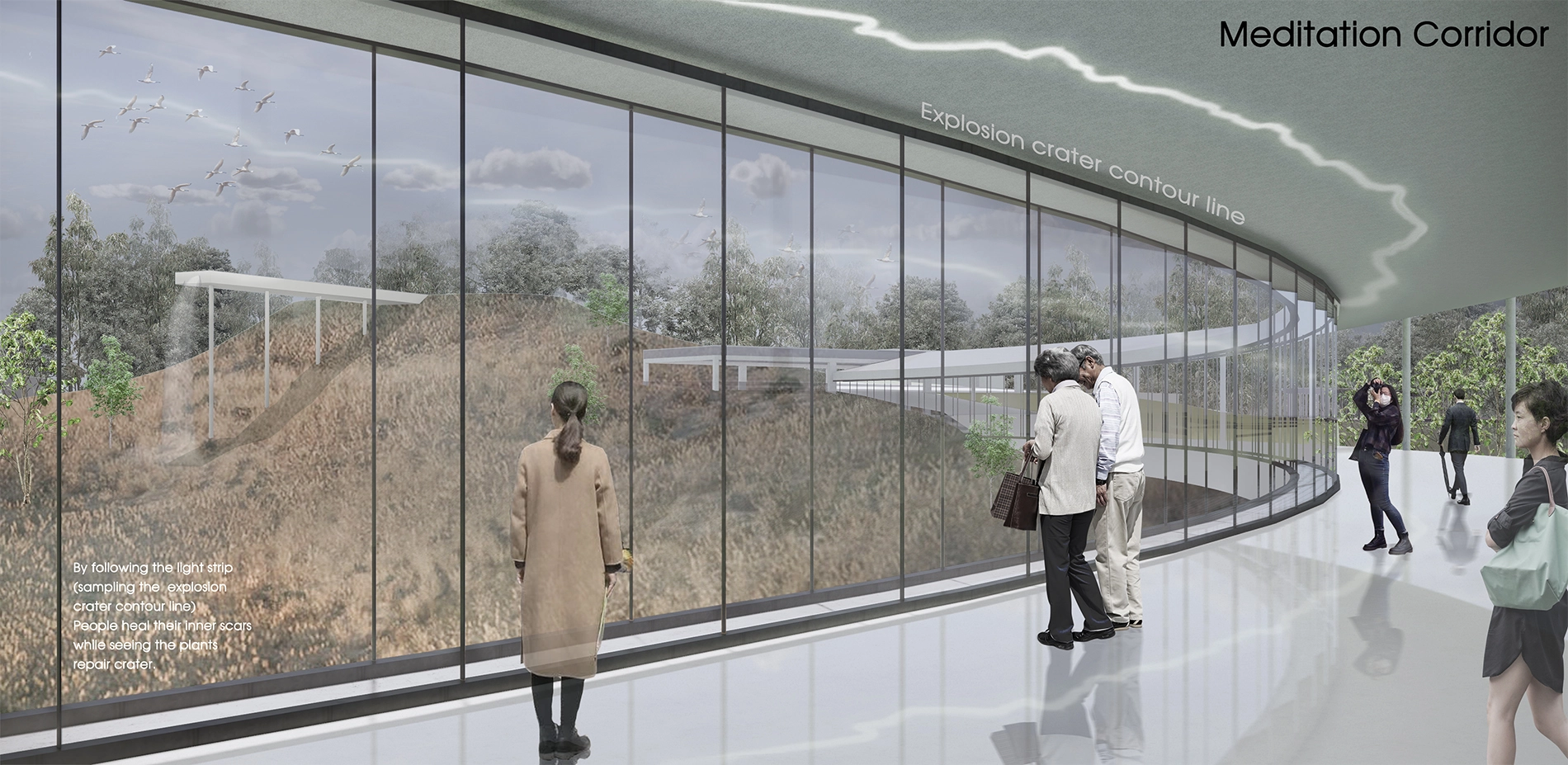 The inward extrusion and growth of the landscape in a hierarchy of circles also caters to the main theme of ecological restoration of the post-blast landscape. From the tree planting area in the outer circle, to the shrub planting area in the middle circle, and finally to the herb planting area in the inner circle centered on the explosion crater. Following the growth of the landscape and echoing the topography of the site, a basin-shaped ecological green island is created with the outer circle high and lowered inward.