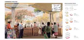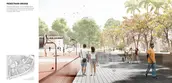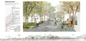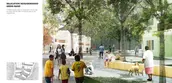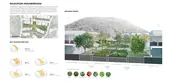 Second, a pedestrian spine with bike lanes runs across the expressway, while linking its different components: a) Sport, leisure, and community service areas, b) A relocation housing neighborhood, and c) A town center with denser mixed-use developments, commercial facilities, a market, a manufacturing/training center, serving the broader Candelaria district, and accessible by public transportation.