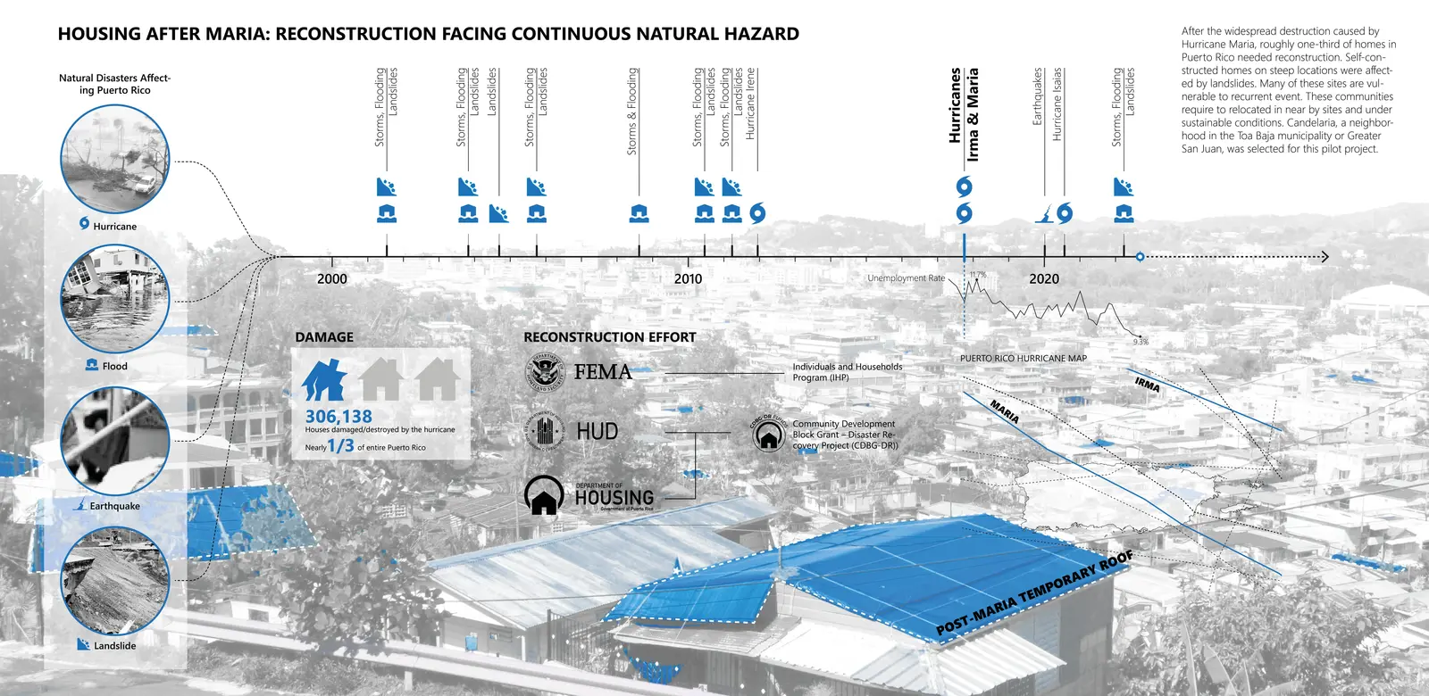 In 2017, Hurricane Maria brought enormous damage and losses to most urban areas of Puerto Rico. Houses in the Candelaria, neighborhoods of Toa Baja, and part of the San Juan Metropolitan Area, were heavily affected by landslides. The lowest income and self-constructed dwellings located on steep terrain became extremely vulnerable to future natural disasters since then, most of which lack maintenance after emergent repairs. Candelaria is currently facing inefficient industrial single land use, as well as a lack of community services and public spaces, which has finally exacerbated social instability.