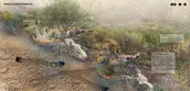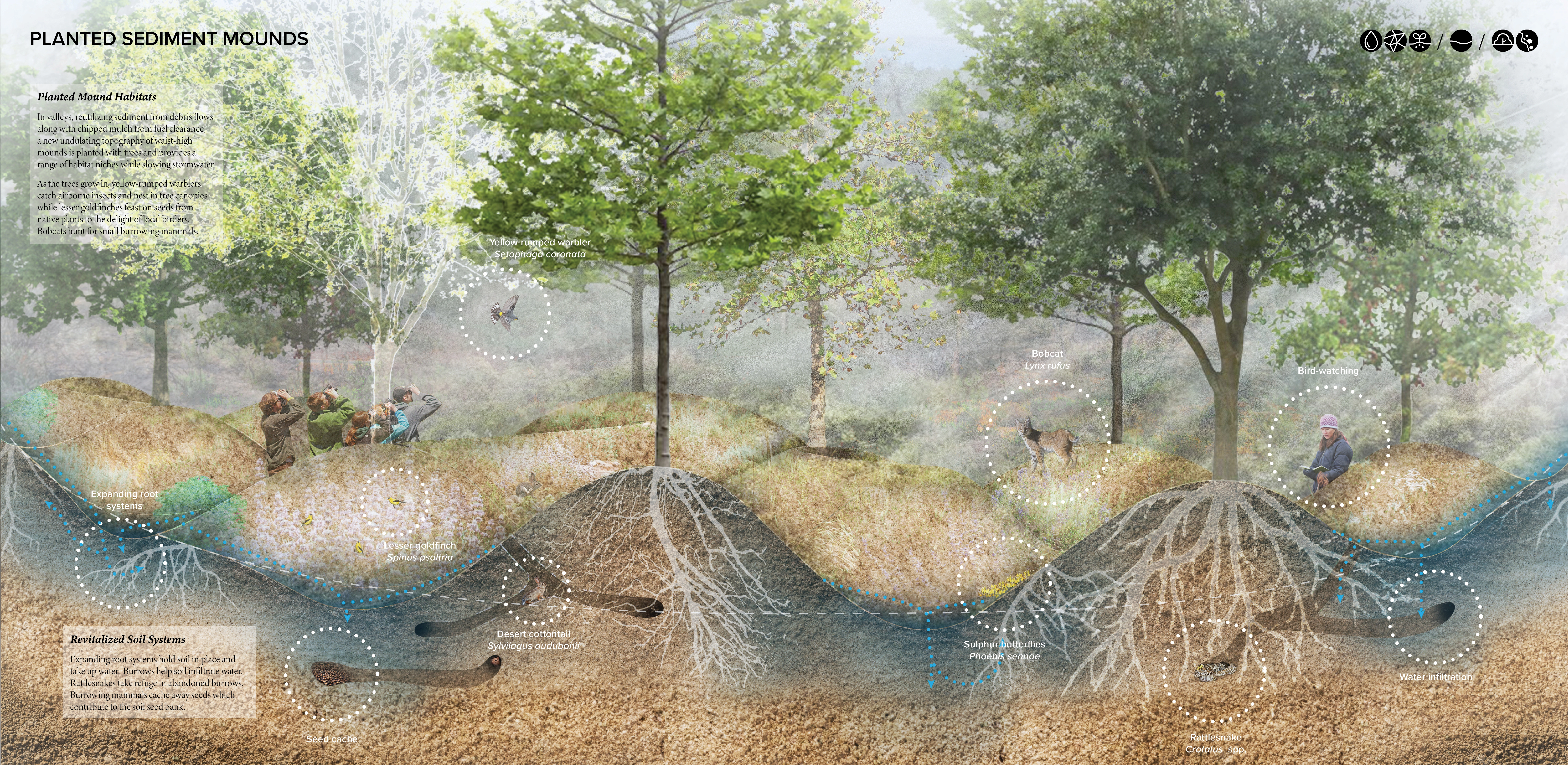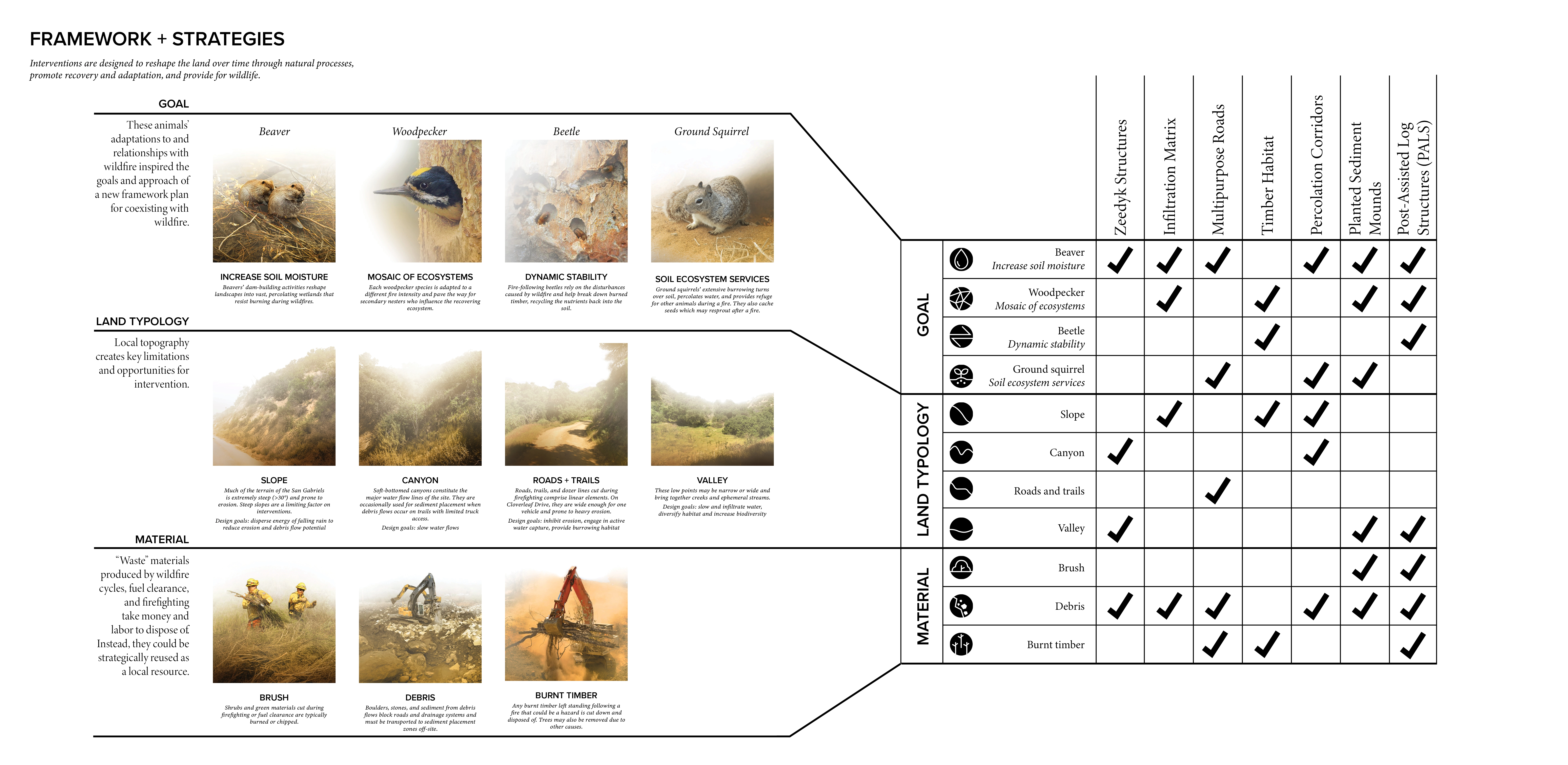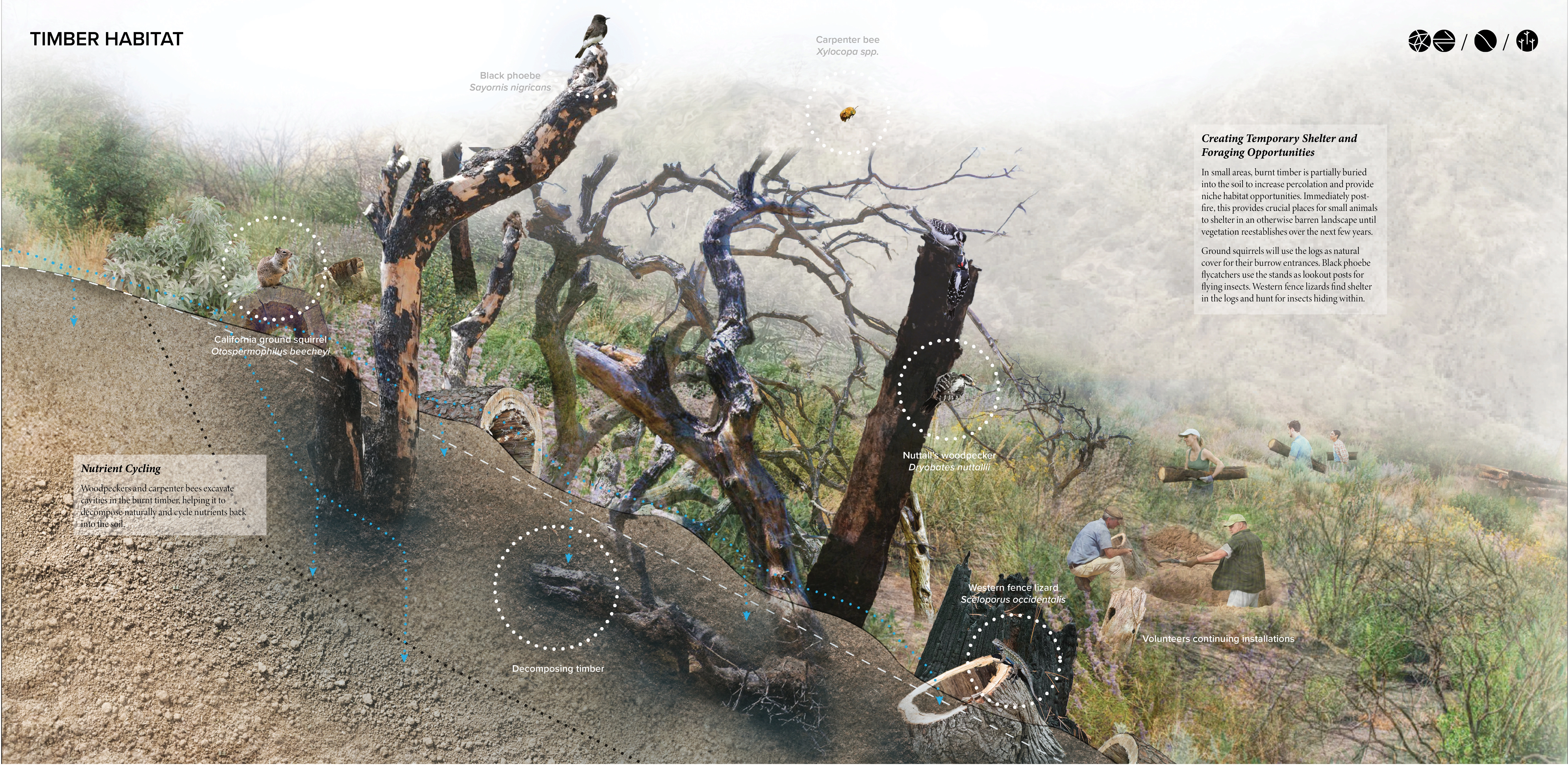 These animals’ adaptations to and relationships with wildfire inspired the goals of a new framework for coexisting with wildfire by catalyzing regeneration of habitats niches to support ecological resilience. Framework goals include increasing soil moisture (BEAVER), developing a mosaic of ecosystems (WOODPECKER), promoting dynamic stability (BEETLE), and supporting soil ecosystem services (GROUND SQUIRREL). We then developed interventions that reshape the land over time through natural processes, promote recovery and adaptation, and provide for wildlife. These interventions respond to local topography while strategically reusing "waste" materials produced by wildfire cycles and management.