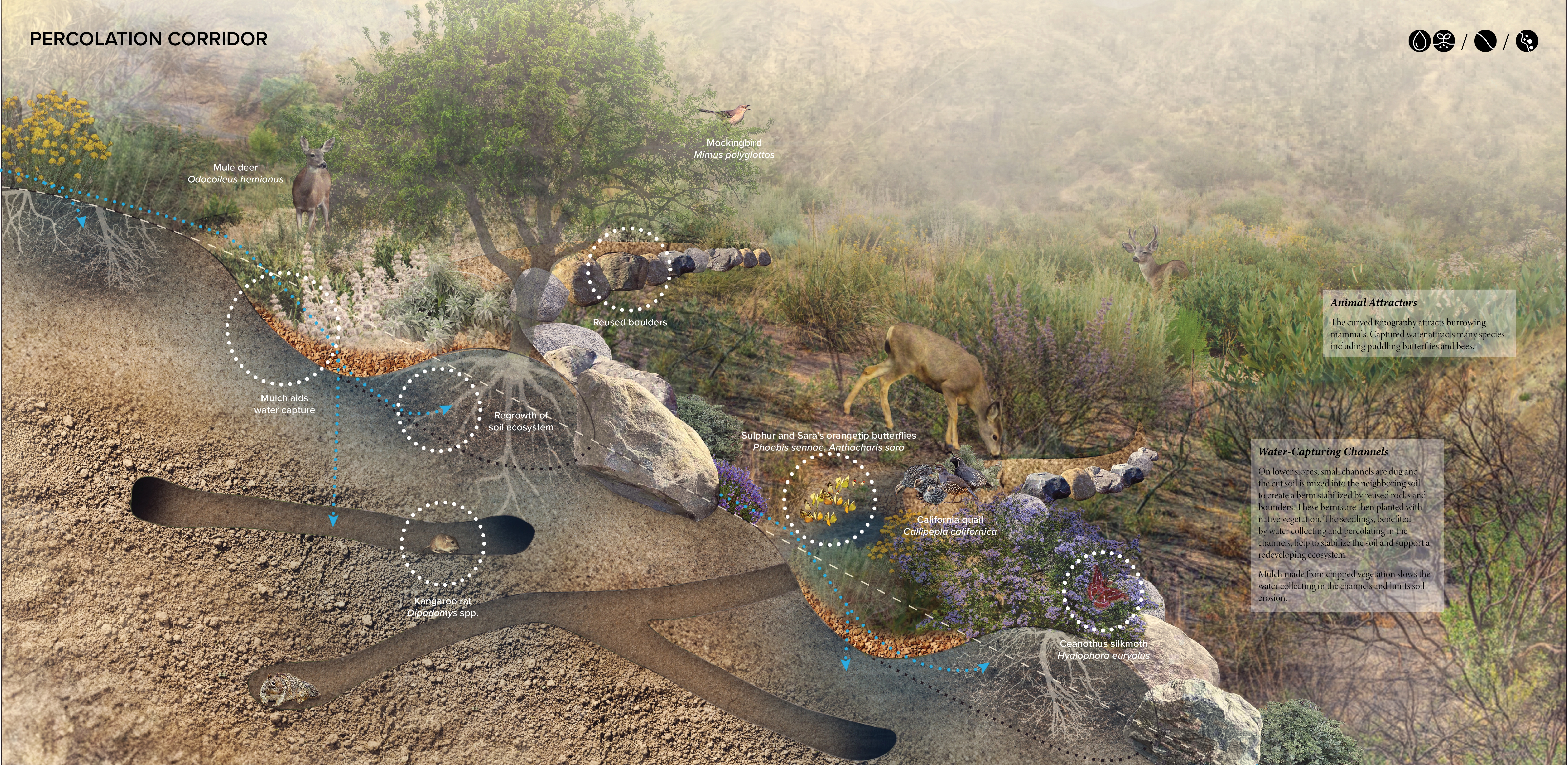 Along steeper slopes and narrow canyons, zeedyk structures and boulder infiltration matrices slow water, reduce erosion, and help catch seeds that germinate and initiate regrowth of native flora. Multipurpose roads and trails are lined by bioswales that capture and infiltrate runoff into a percolating road typology. Steep slopes are braced by reused timber terracing to disperse the water runoff while creating nesting habitat. Berms enhance user safety while attracting burrowing animals whose tunnels increase percolation.