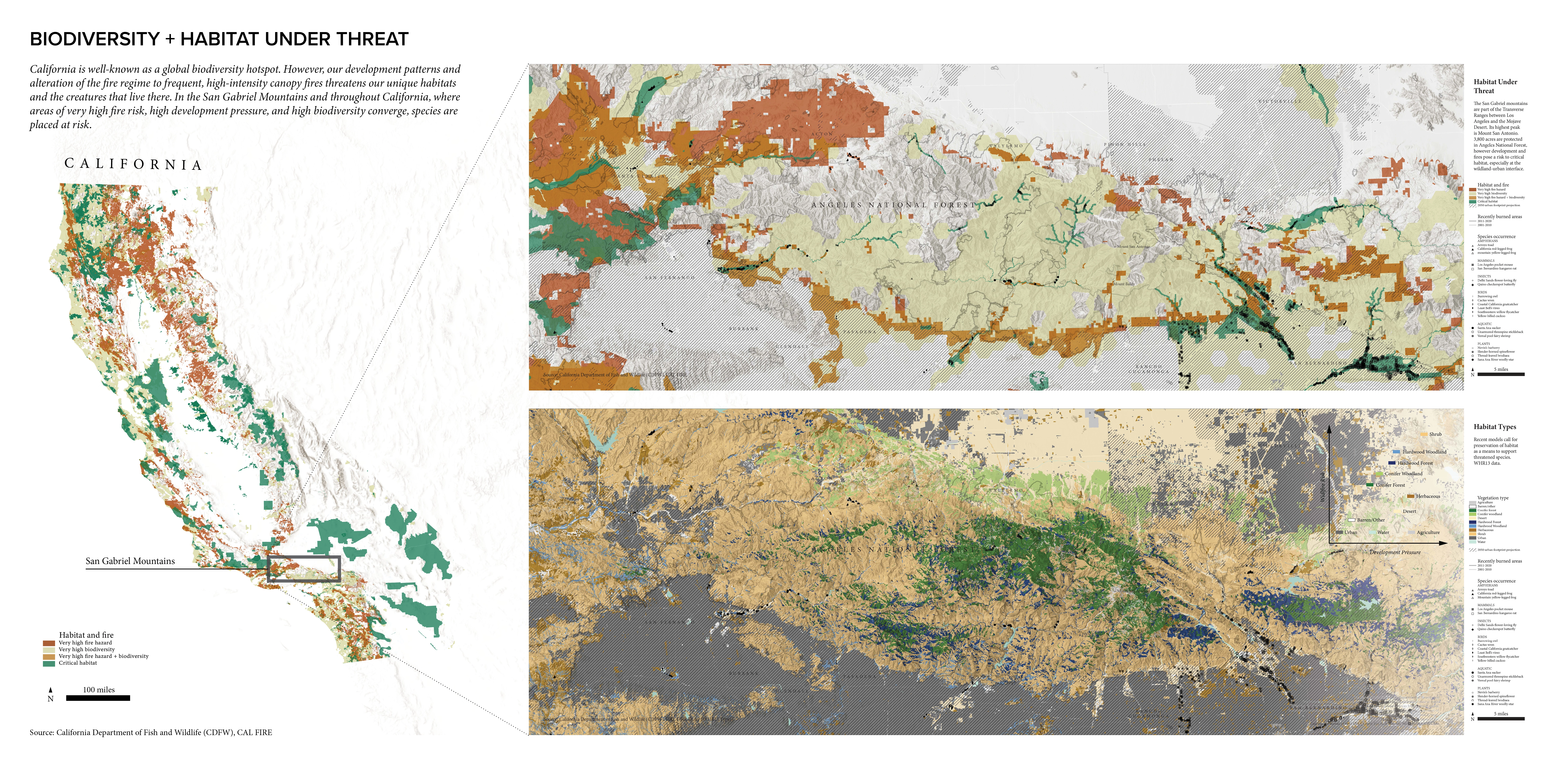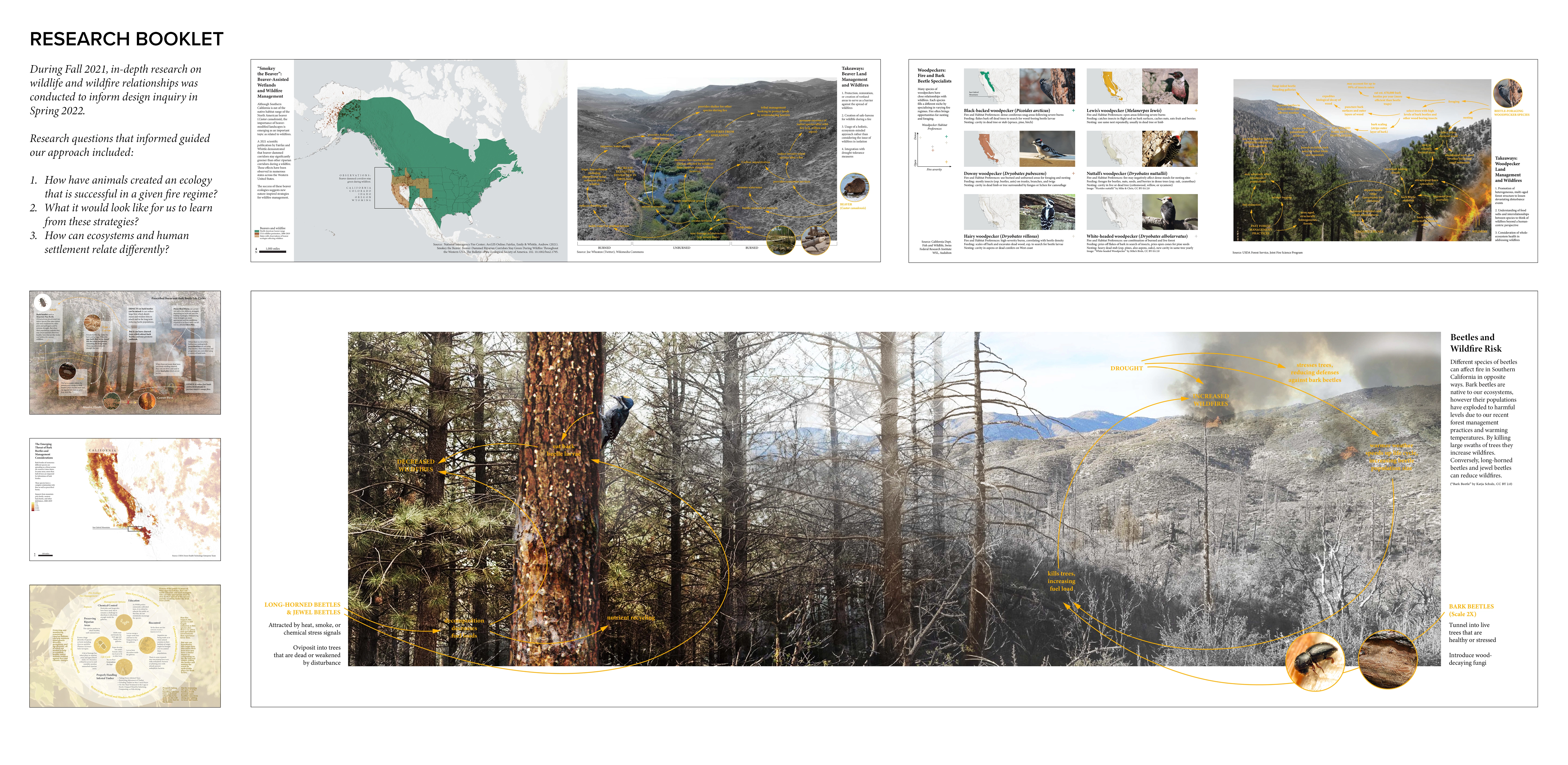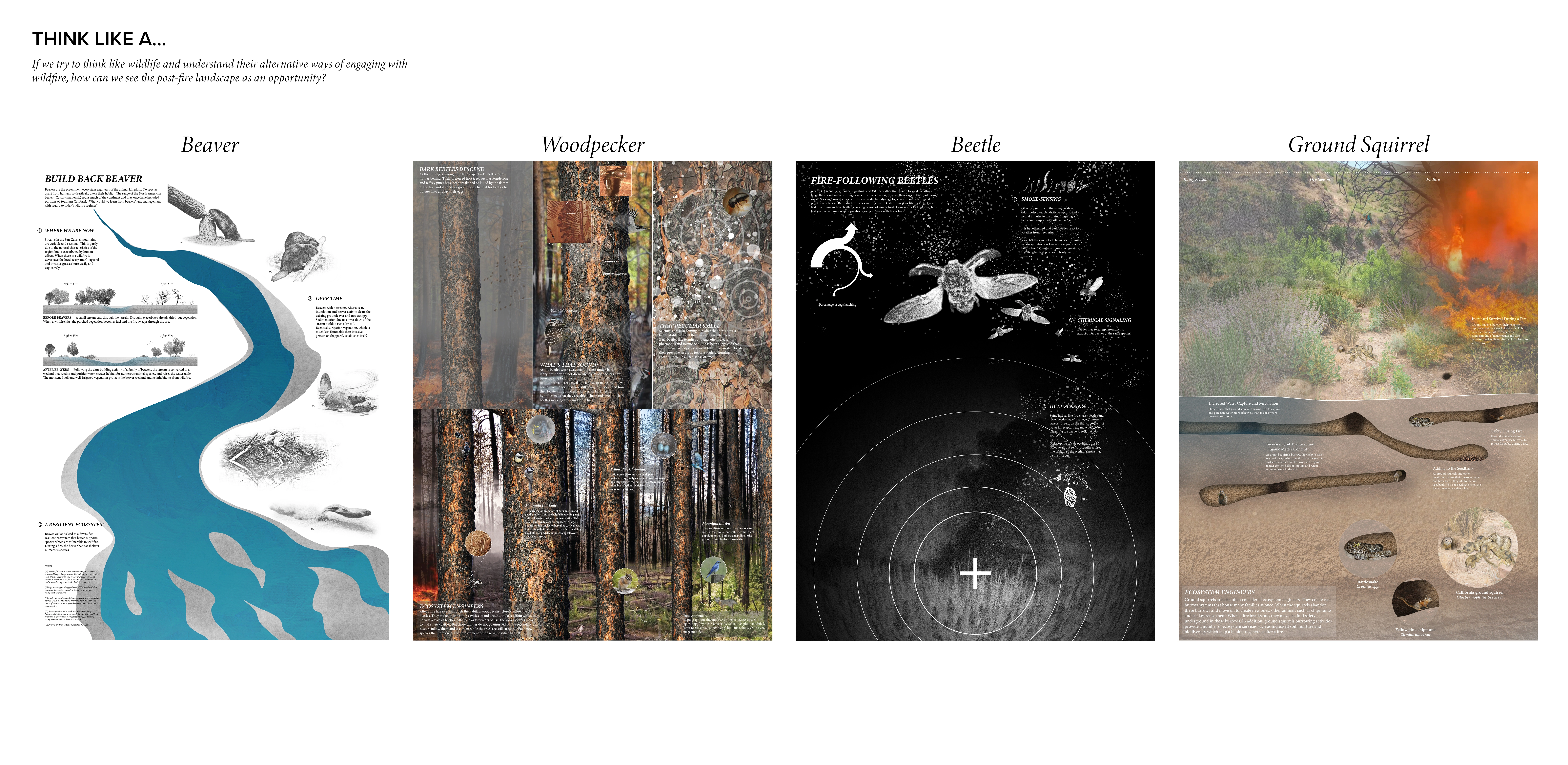 As wildfires in the San Gabriel Mountains become more frequent and severe, we need to expand our suite of management tools beyond firefighting and fuel clearance by seeking new inspiration. Around the world, wildlife have complex relationships and strategies for coexisting with wildfire. In this research project, animal adaptations to wildfire inform a land management framework designed to catalyze regeneration of habitat niches in post-fire landscapes to support ecological resilience. Framework goals include increasing soil moisture (BEAVER), developing a mosaic of ecosystems (WOODPECKER), promoting dynamic stability (BEETLE), and supporting soil ecosystem services (GROUND SQUIRREL). Interventions respond to local topography, strategically reuse materials produced by wildfire cycles and management, and engage forest management, residents, and volunteers in land care. The post-fire landscape is re-imagined as an opportunity to reshape the land over time through natural processes, promote recovery and adaptation, and provide for wildlife.