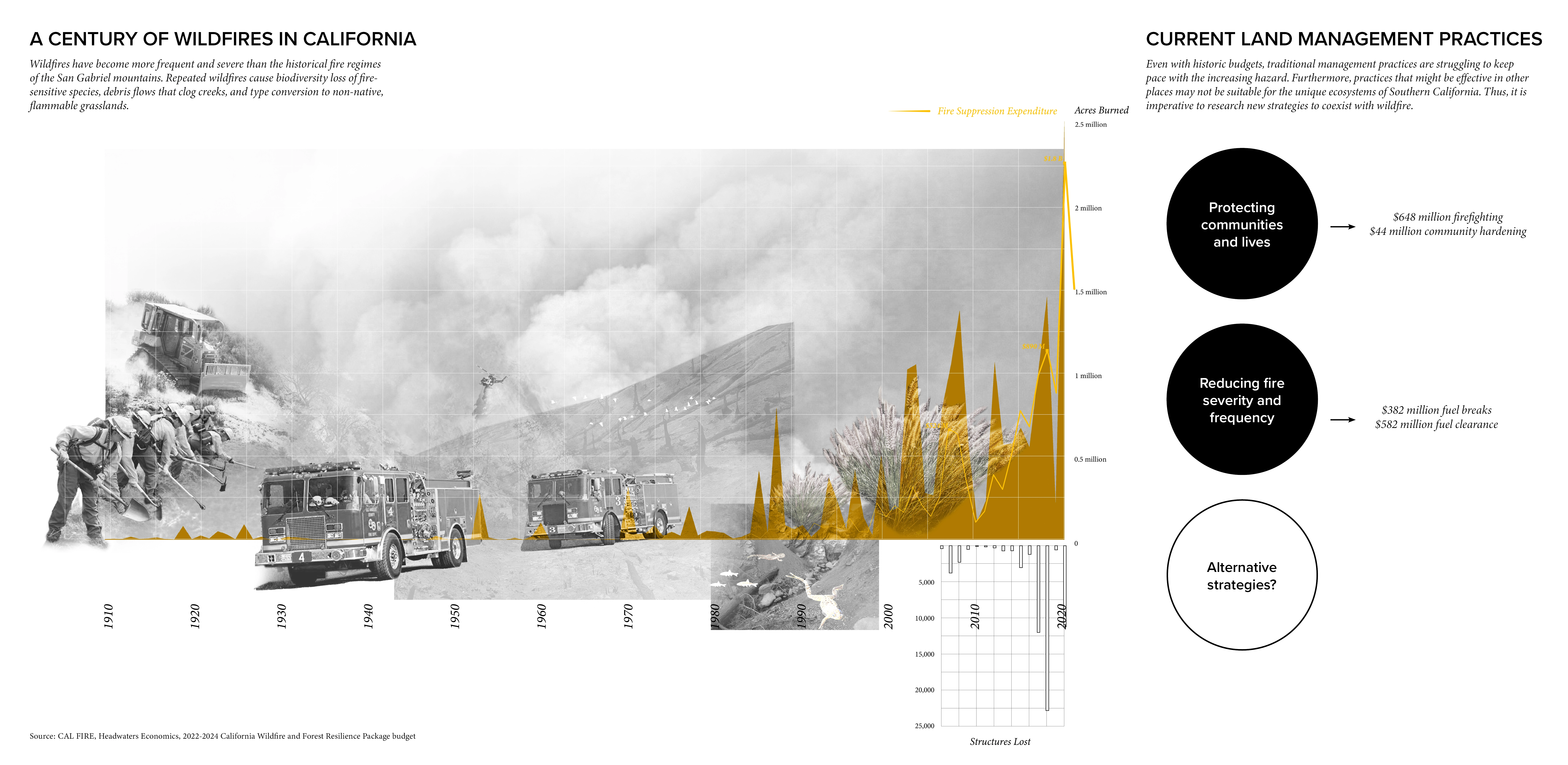 Over the past century, wildfires have become more frequent and severe than the historical fire regimes of the San Gabriel mountains. Repeated fires cause biodiversity loss of fire-sensitive species, debris flows that clog creeks, and type conversion to non-native, flammable grasslands–leading to a supercharged fire cycle that will only worsen as climate change progresses. Currently, the main goals for managing wildfire are protecting communities and lives and reducing fire severity and frequency through firefighting, community hardening, fuel breaks, and fuel clearance. However, even with historic budgets, traditional management practices are struggling to keep pace with the increasing hazard. Furthermore, practices like prescribed burning that might be effective in other places may not be suitable for the unique ecosystems, notably chaparral, of Southern California. Therefore, it is imperative we seek new strategies to meet these environmental challenges.