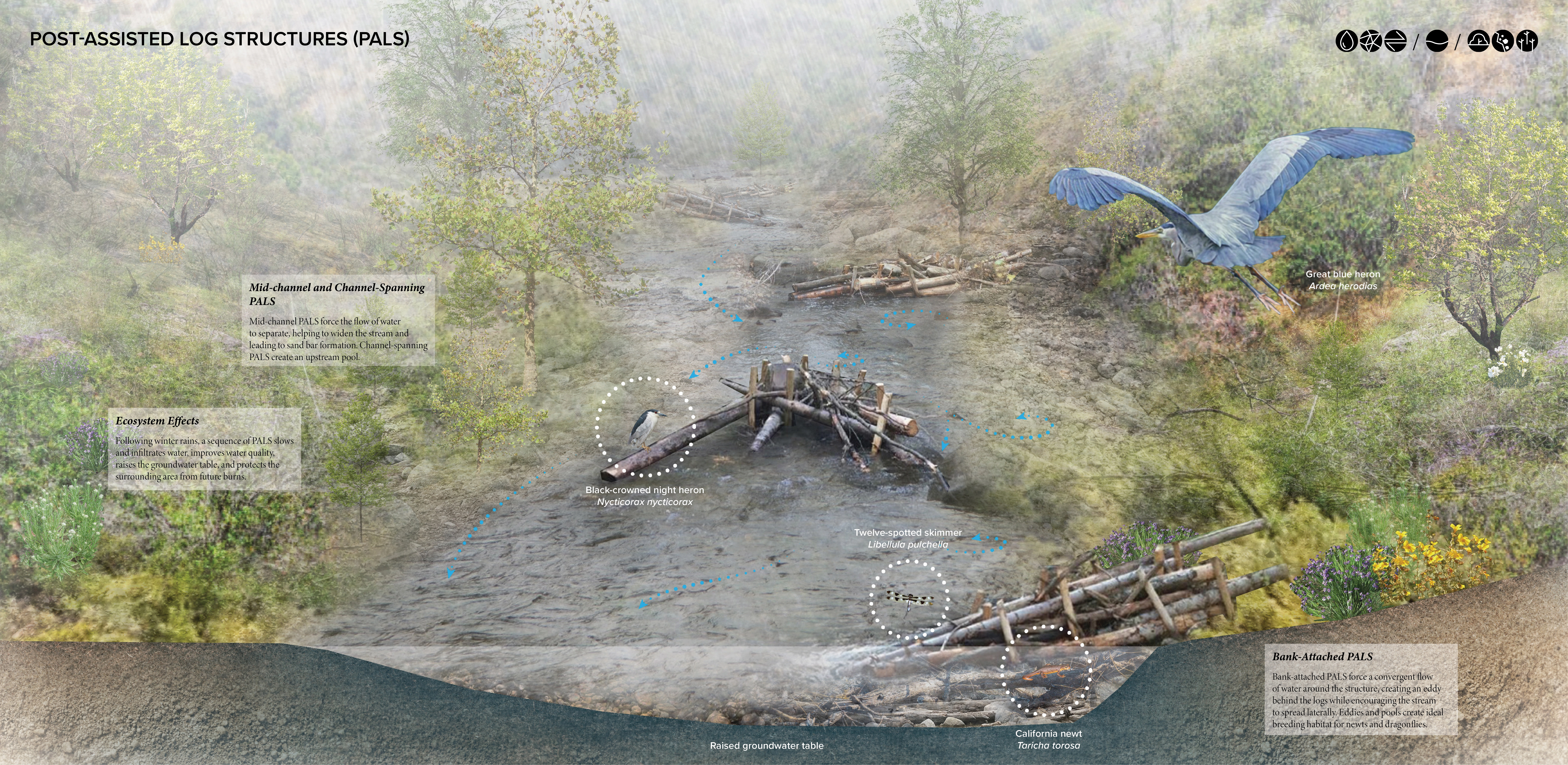 In the valleys, the huge amounts of soil and debris from debris flows could be reused to create winding, planted mounds that would slow and disperse fast-moving stormwater. As the plants grow, they will attract more wildlife while their roots stabilize the soil and absorb additional water. Also in the valleys, a sequence of post-assisted log structures could slow and infiltrate water during winter storms, raising the groundwater table and protecting the area from future burns. The widened stream enhances habitat for waterfowl while eddies and pools formed around the log structures create breeding habitat for animals like dragonflies and newts.