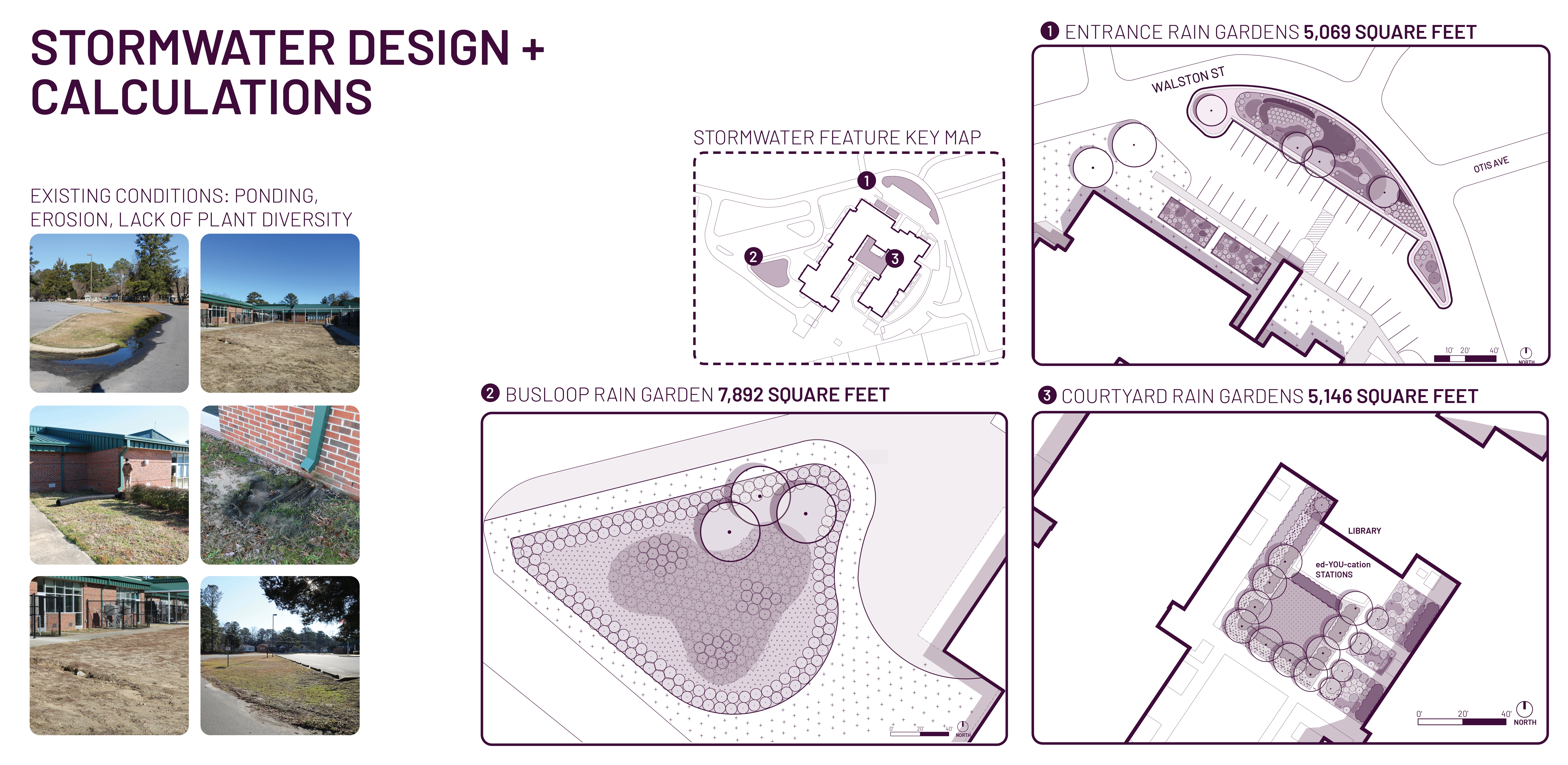 The designs of the rain gardens were informed by research and engineering considerations. Stormwater calculations were completed to ensure the total runoff volume of a 1” rain event will be captured. Additional research was conducted into plant materials to: i) ensure suitable plants for the different microclimates and hydro-zones and ii) prioritize native and pollinator-friendly plants, both of which connect to and enrich the school's existing STEAM curriculum.