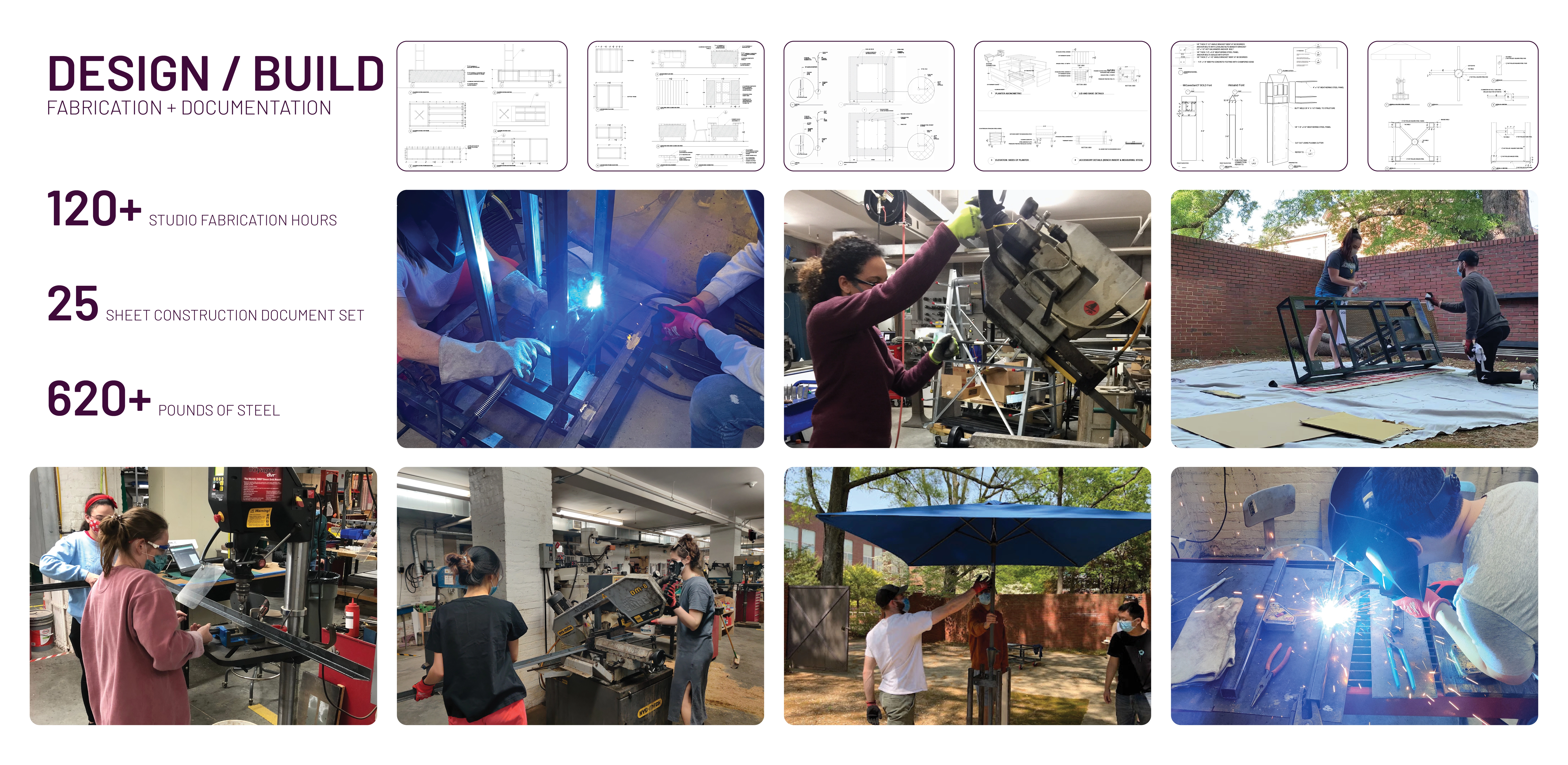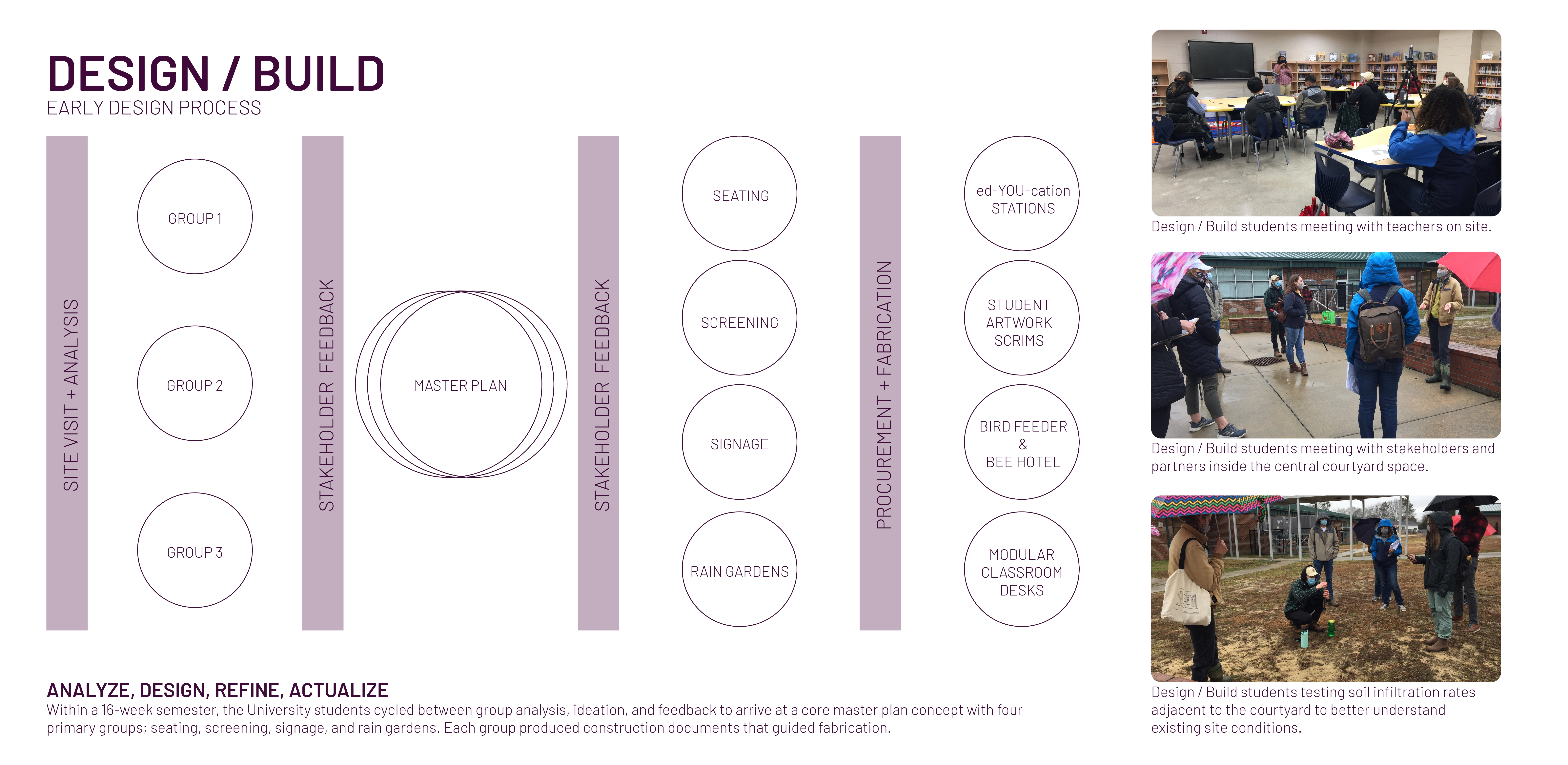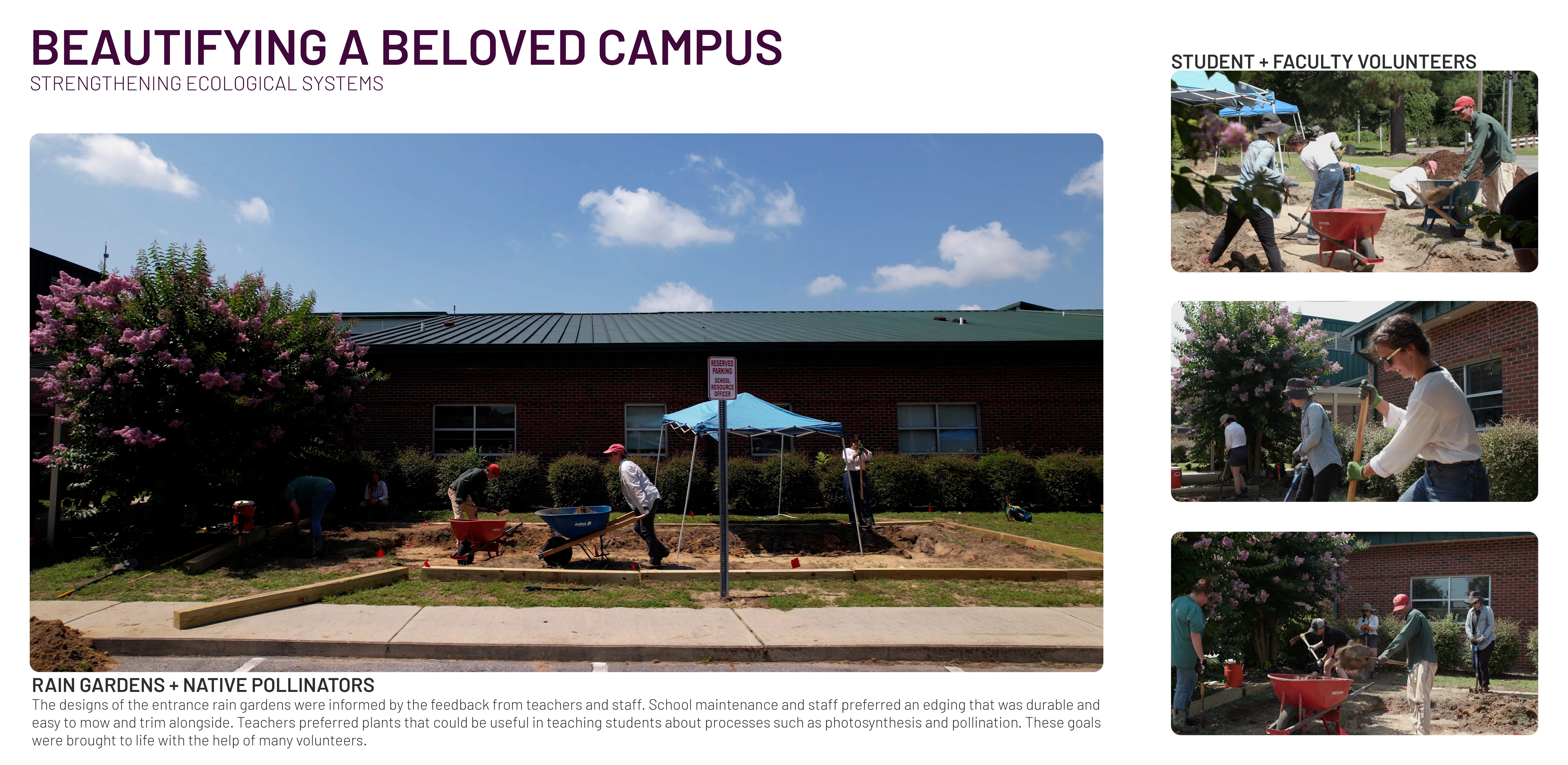 This multi-part project was the result of a comprehensive and integrated scope of work. Each element of the project consisted of research, engagement, design, engineering, fabrication, installation, maintenance guidance, and post-occupancy evaluations. Graduate researchers conducted community engagement activities and teacher surveys; created educational materials; researched stormwater designs; completed stormwater calculations; procured plant and construction materials; and created a curriculum and management guide to aid teachers in using rain gardens and tactile, outdoor learning as extensions of their classrooms. The design/build course conducted engagement with teachers and staff, researched educational design and materials, engineered and fabricated outdoor furnishings, crafted a maintenance guide for furnishings, and is conducting ongoing post-occupancy evaluations. Additionally, volunteers from the landscape architecture program played a significant role in the completion of this project. Over the course of numerous, intensive workdays and follow-up maintenance days, departmental student volunteers assisted in excavating and shaping the rain gardens and installing, mulching, weeding, and watering hundreds of plants and trees.