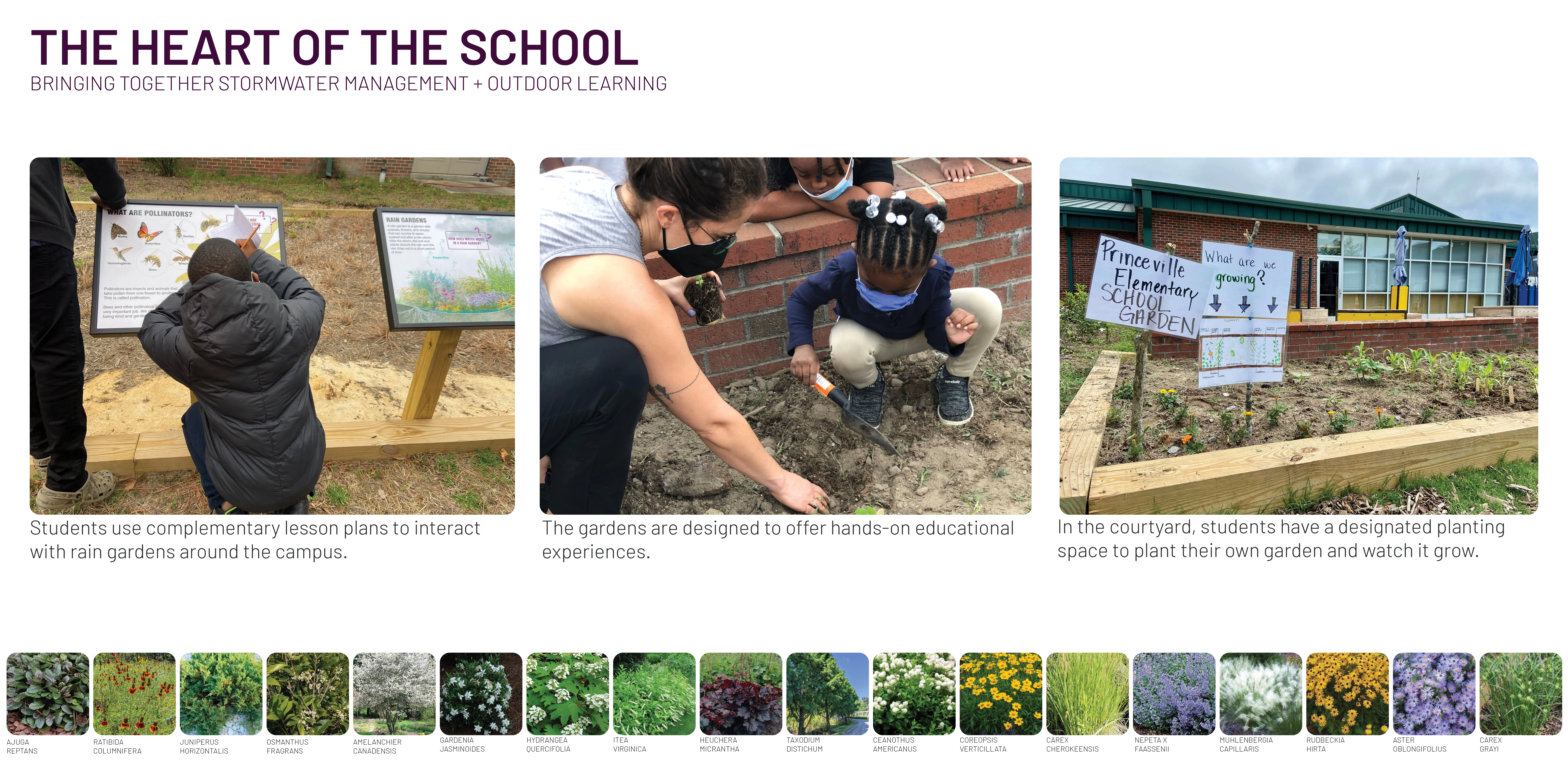 The rain gardens were designed with an emphasis on native plants and pollinators. These areas connect to the STEAM curriculum that enhances learning outcomes tied to natural processes such as photosynthesis, the water cycle, and pollination, while adding a beautiful plant palette to their beloved campus. Educational signs with guiding questions are strategically placed alongside the rain gardens and along the new Princeville Heritage Trail to both inform and engage students and community members about the ecological benefits of the environments around them.
