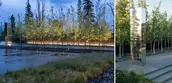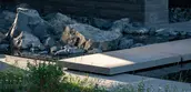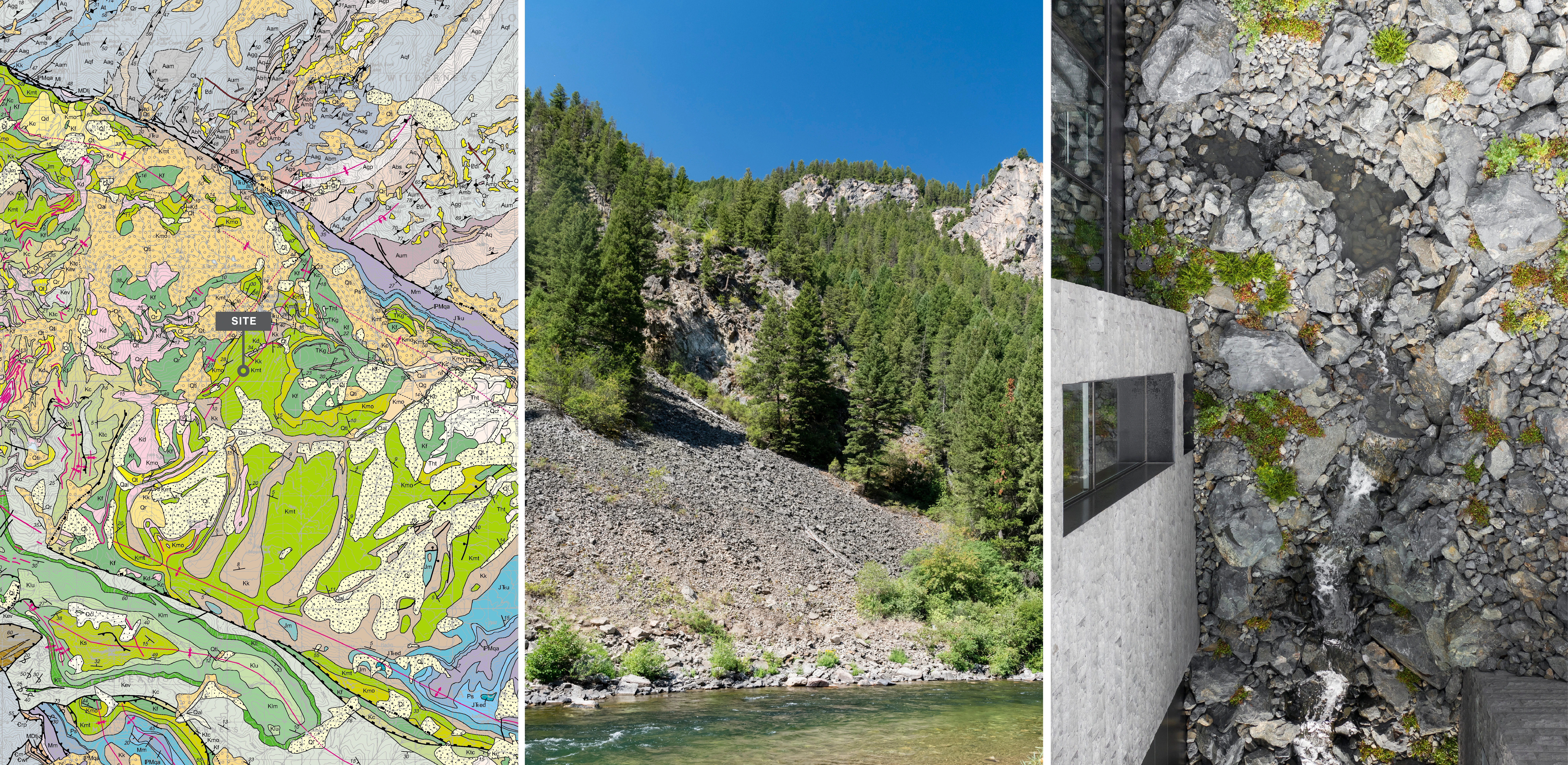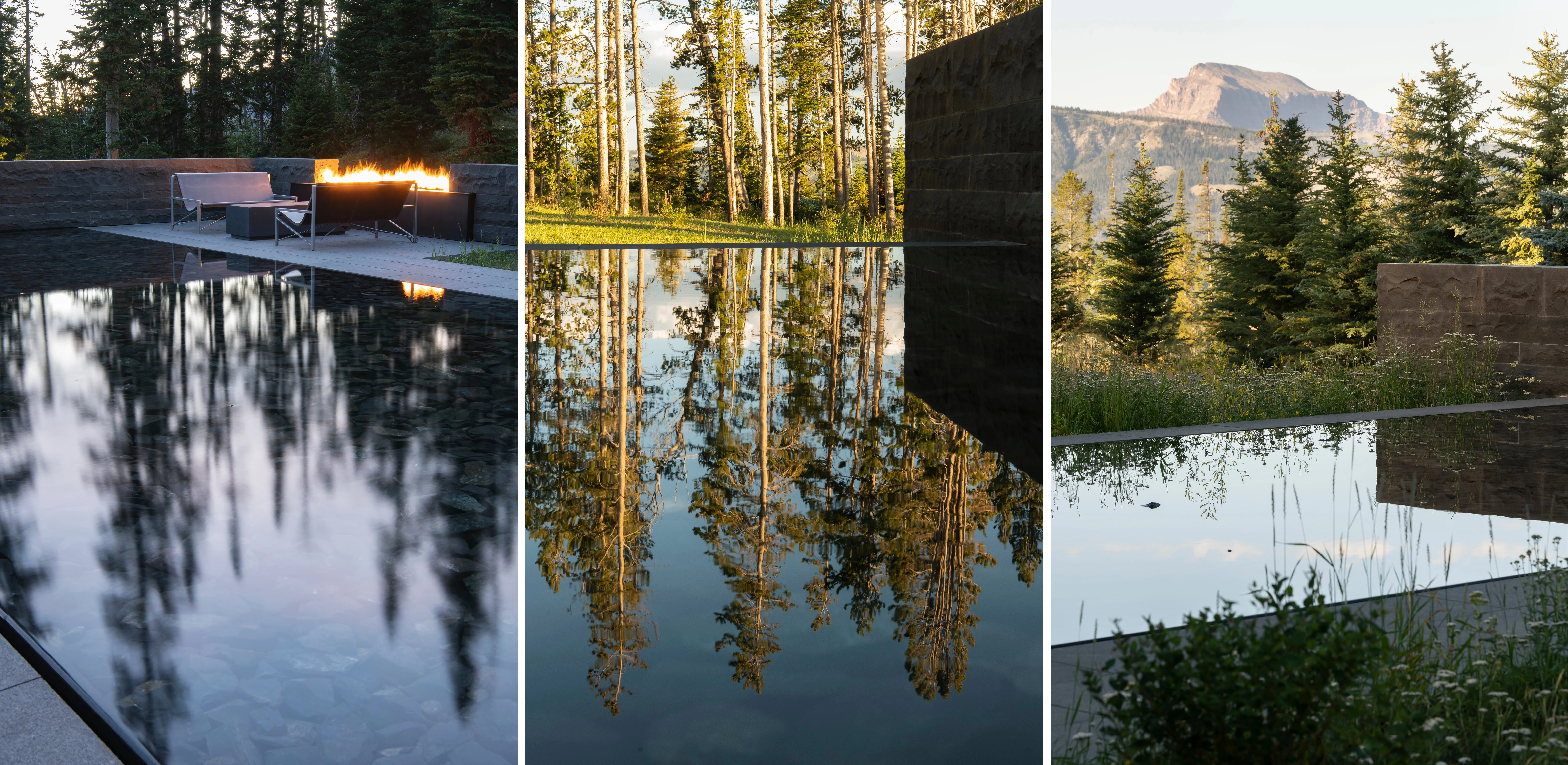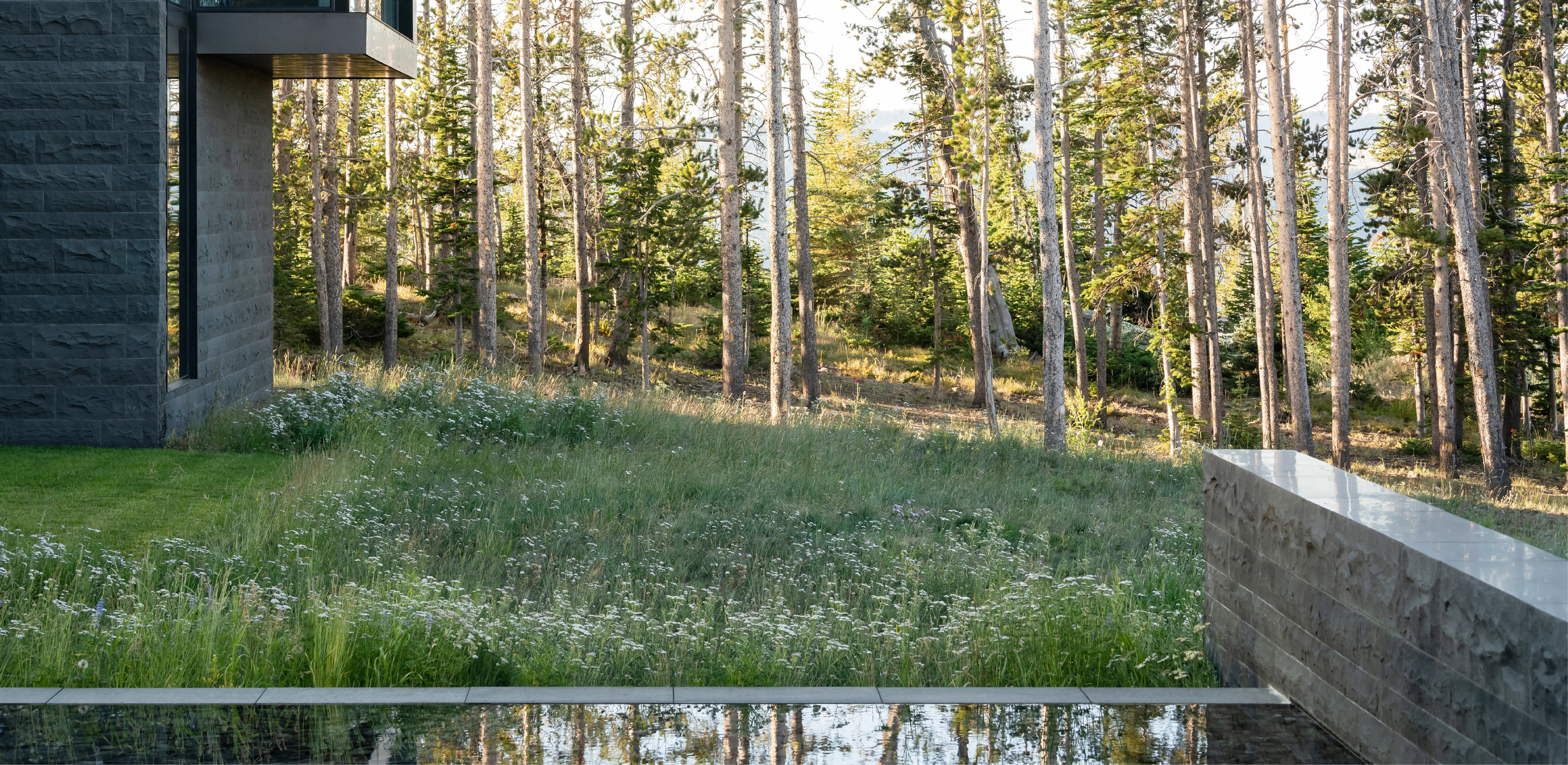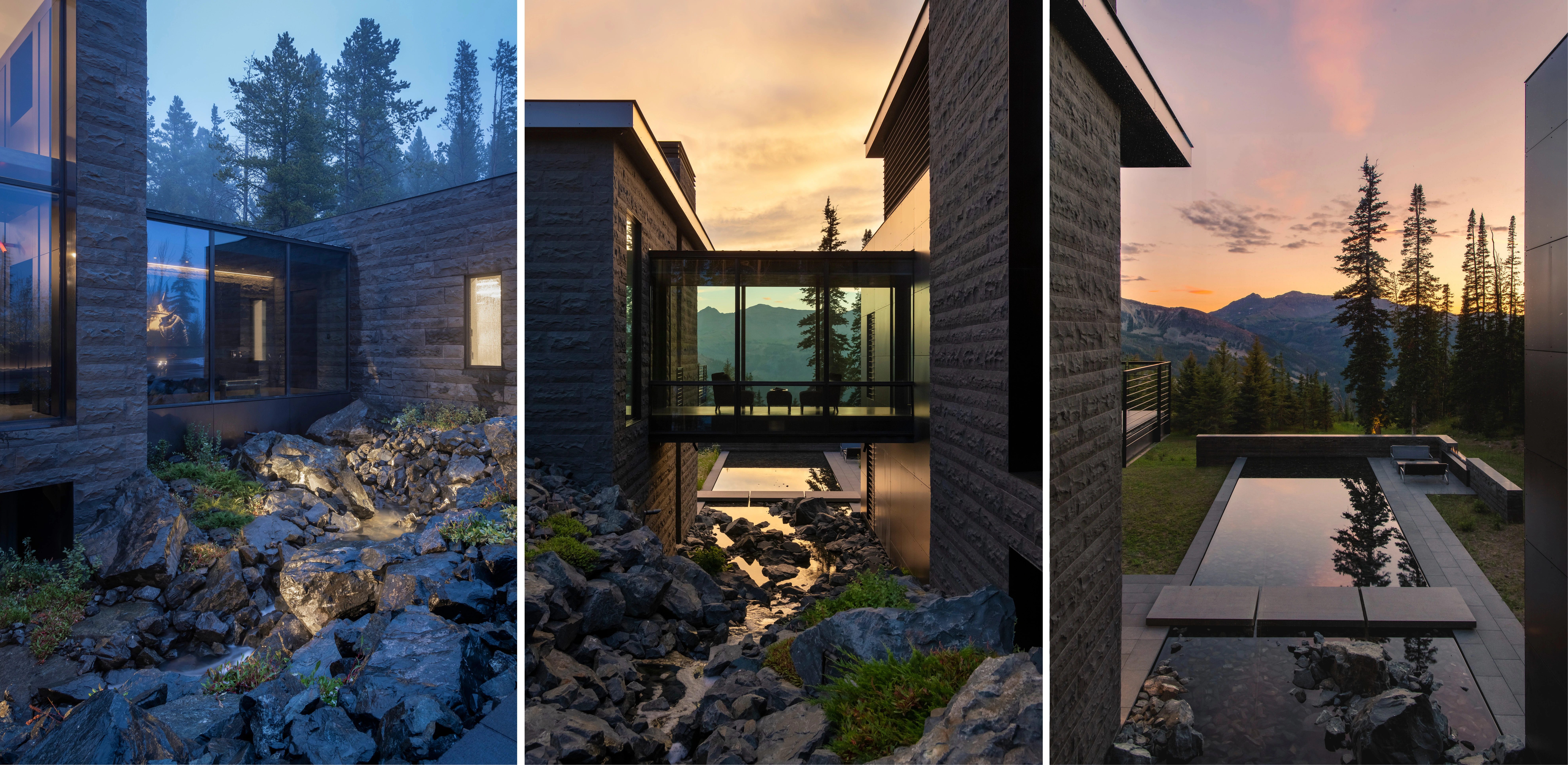 GEOMORPHOLOGY AS STORYTELLING Set on a sparse promontory overlooking Montana’s Madison Range, the 3.5-acre forested site rests within a dramatic landscape shaped by wind, fire, water, and ice. Evidence of such extreme natural forces are discoverable in the backcountry, where rock glaciers—piles of broken and weathered scree rock—scour mountainsides, piling debris in stream beds and alpine lakes. This unique phenomenon offers inspiration for Andesite Ridge, challenging the notion of contemporary landscape design in a rugged environment. INSPIRED BY PLACE Interested in protecting and enhancing the site’s vistas, night skies and wildlife habitat, the owners designed a contemporary mountain home, crisply executed with a nocturnal material palette that purposefully retreats into the coniferous forest. In response, landscape expressions are disciplined, limited to a narrative that extend the visual and functional relationship of the home into the landscape, connecting its inhabitants to the story of this place. PRESERVING THE INTEGRITY OF THE LAND The entry drive gracefully embraces the dramatic contours of the site, its artful maneuvering around mature pines and lichen-covered escarpments slowly revealing filtered views of the rugged mountains and home beyond. Upon arrival, a linear walk – composed of cut pavers and loosely placed native rock – extends from the home’s entry, sheltered by a tightly-spaced grove of quaking aspens that cast an ever-changing play of light and shadow upon the shou sugi ban walls of the home. TRANSCENDING ART AND FUNCTION Traversing beneath a glassy bridge linking public and private areas of the home, a stream—the central garden element that metaphorically abstracts and celebrates the ephemeral nature of snow-fed creeks and lakes as a performative art installation—accommodates onsite water harvesting, stormwater management and fire suppression needs. Emerging as a small spring, water spirits its way through broken rock fragments, creating an audible spectacle that permeates interior spaces. Craggy boulders, softened with pockets of creeping groundcover, appear intermittently, their organic jagged forms set in poetic contrast to architectural stone walls. Below, water diffuses across a rugged delta and into a plane of still water, reflecting adjacent meadowlands and theatrical skies. Recycled water, collected from spring meltwater and rainwater runoff, is stored in a series of underground, fire protection cisterns, and allowed to periodically recirculate – transforming a dry talus bed into a glassy surface in 30-minute intervals, and then drained to reduce evaporation. ENCOURAGING NATURAL PROCESSES The design realizes a commitment to protecting and enhancing the natural beauty of the site while addressing critical environmental issues facing the Northern Rockies, including forestry and wildfire management, water conservation and ecological disturbance. While avoiding impact to keystone species that offer high nutritional value as migratory habitats, aggressive clearing of deadfall introduces light and moisture to foster regeneration. Reconstructing 27,000 square feet requires irrigation only until establishment and mimics existing conditions with native grasses and wildflowers that complement the modern lines and tones of the architecture. Since construction, indigenous wildlife has returned with a robustness that belies the fragility of its alpine environment.