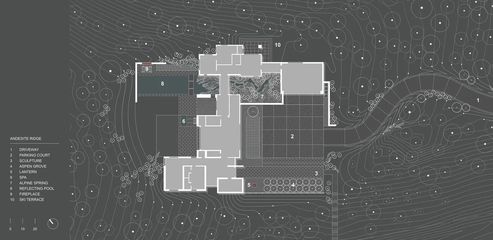 Set within a landscape shaped by wind, fire, water and ice, Andesite Ridge exposes a dramatic and ecologically rich environment, challenging the notion of contemporary design in a rugged context. A modernist interpretation of mountain living melds a design ethos of simplicity, volume, and natural materials with an artful synthesis of engineering and technology to holistically address its contextual suitability. This approach, when synthesized with strategic site planning decisions, effectively dissolves the barrier between designed space and natural environment while actively addressing urgent regional issues including forestry and wildfire management, water conservation, ecological impact, and wildlife habitat restoration.