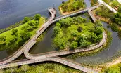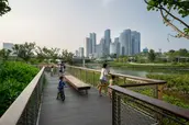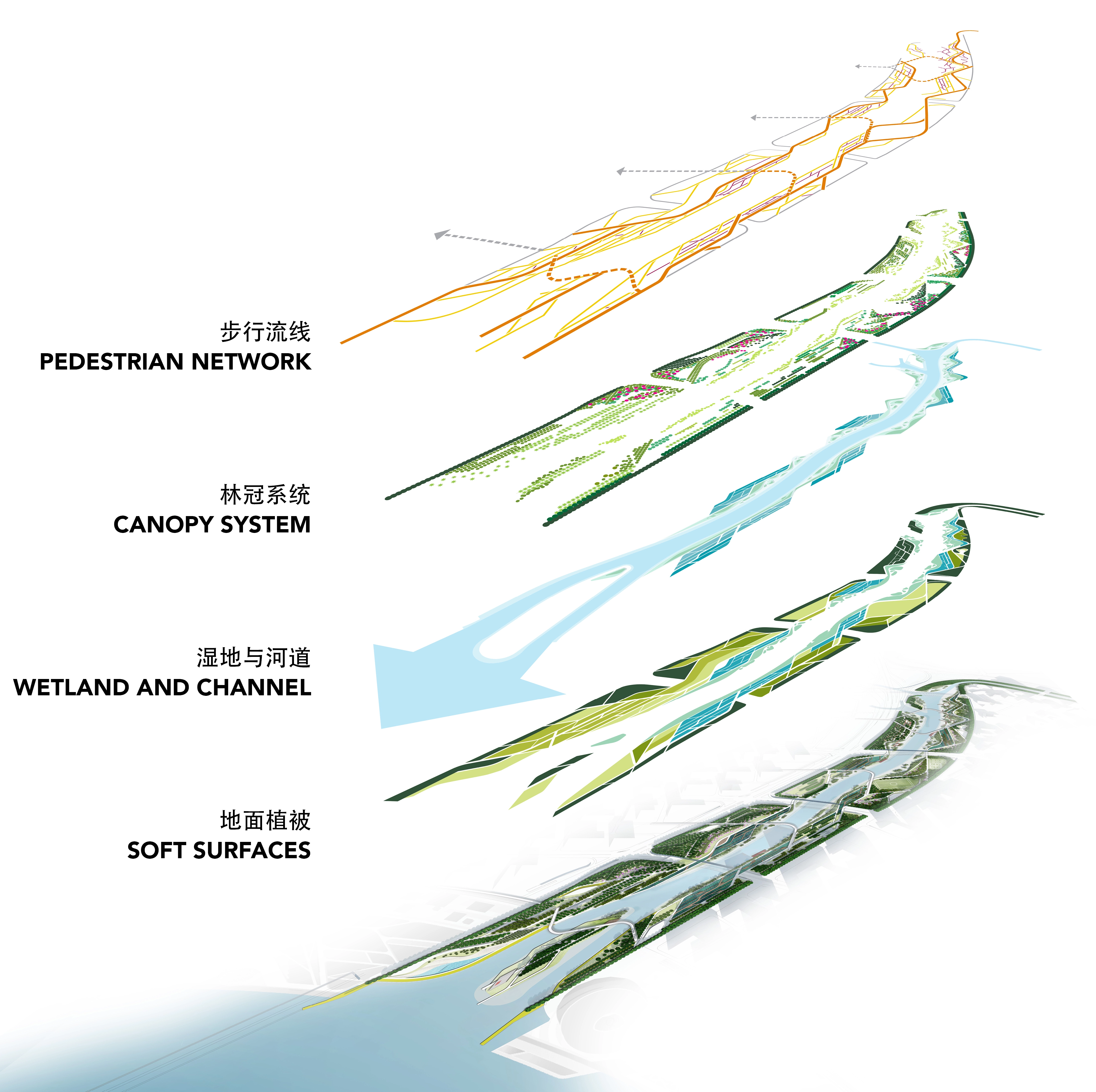 Qianhai Water City Qianhai Water City creates a new identity for a coastal city with five development districts defined by large green “water fingers” between neighborhoods. This framework outlines a strategy for a more resilient, ecological city. Guiwan Park is the first of five “water fingers” to be built in Qianhai. The park provides a one-of-a-kind amenity by integrating blue-green infrastructure with active and passive recreation, ecology, habitat and cultural programs, centered around a tidal channel that protects the city and inland area from flooding and improves water quality. As a central park, this large-scale open space is critical to the city’s needs as it develops. The 2.2-kilometer-long, 45-hectare park incorporates programming that caters to an urban context in the west and transitions as it becomes more residential in the east. By synchronizing a pedestrian network, canopy system, wetlands, the canal, and soft surfaces, Guiwan Park cultivates interaction between them, fostering an integrated ecosystem. Ecological Performance Guiwan Park’s three terraces—woodland, freshwater wetland, and saltwater wetland—accommodate a steep elevation change between the park’s main road, which sits at 6 meters above sea level, and the central channel water level, which varies from -1 to 2.0 meters. As part of China’s “sponge cities,” the park and its terraces absorb and treat rainwater, including water from the surrounding roads, capturing 90% of annual rainfall and reducing nonpoint source pollution by 72%. Guiwan Park utilizes low-impact development strategies for stormwater management, including grass and gravel swales along main pathways, rain gardens with a sunken greenbelt, and underground tanks for a rainwater filtration and reuse system. Biodiversity & Habitat Recovery Guiwan Park features a coastal and continuous topography that incorporates native subtropical plantings, including 51,000 sqm of mangroves that have expanded from 3 to 17 species. The park’s diverse living ground includes forests, bosques, lawns, freshwater wetlands, and saltwater wetlands that increase biodiversity and create new and unique habitat conditions. There has been a resulting re-emergence of many species native to the area, including herons, egrets, curlew, mudskippers, and crabs. Within the first year, the new wetlands have attracted 21 species of macrobenthos, contributing to a healthy marine ecosystem. Smart Park Guiwan Park incorporates technology that monitors soil, irrigation, insects, water levels, and tree conditions. This data is used by maintenance staff to support operations and monitor as the park’s species develop and mature. The same data has been used in partnerships with local institutions to better understand ecological restoration within urban environments, using Guiwan Park as a case study. In addition, an app for visitors allows them to navigate the park with a digital fly-through and learn more about its ecological benefits. Impact Guiwan Park sets a new benchmark, creating a vibrant park that blends design with ecological performance and social interaction. As coastal cities face the effects of climate change, Guiwan Park serves as an example of ecological rehabilitation on a damaged and reclaimed site, leading the way for a more resilient city that harnesses the impact of large-scale blue-green infrastructure while creating restorative open spaces.