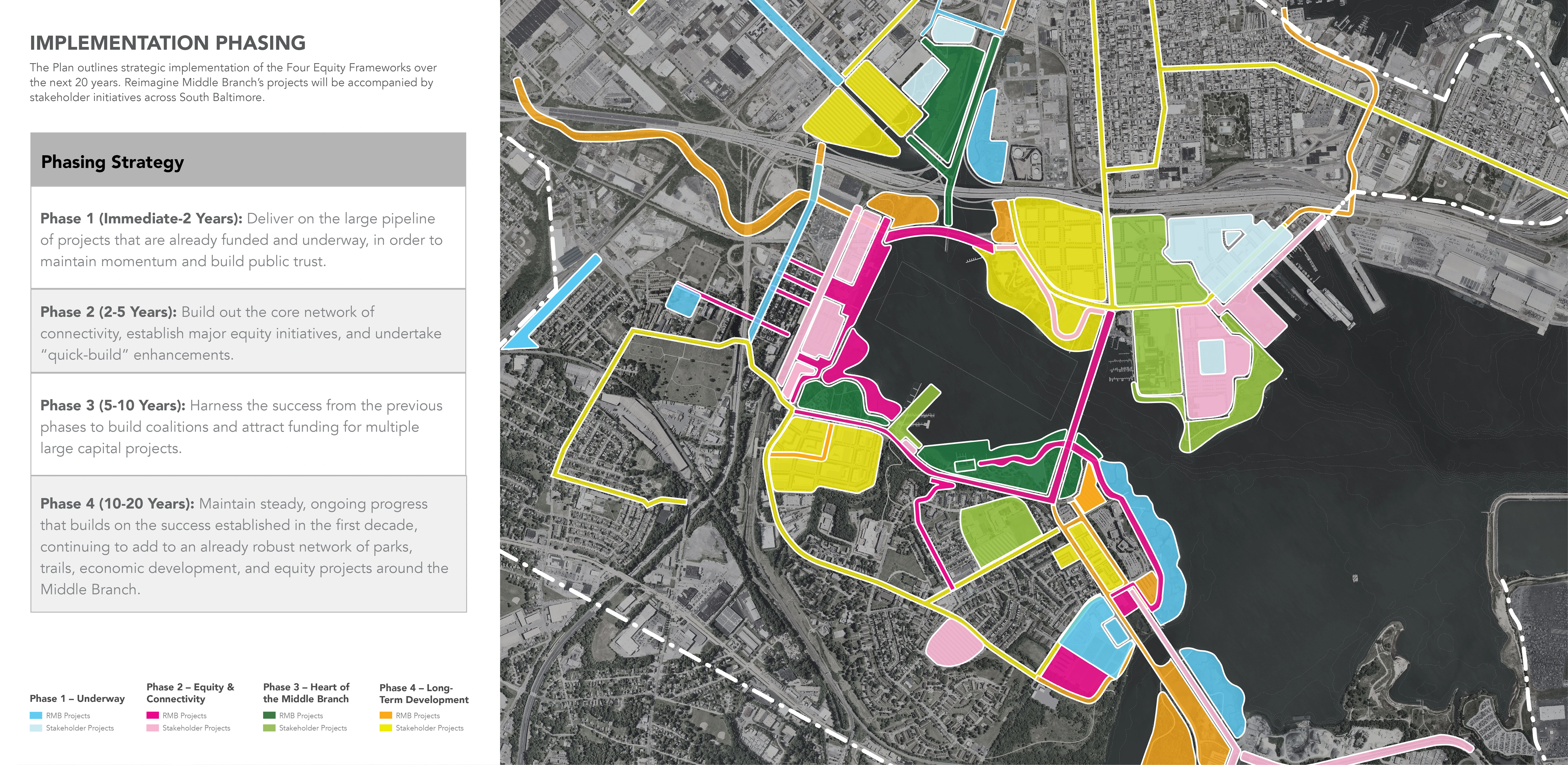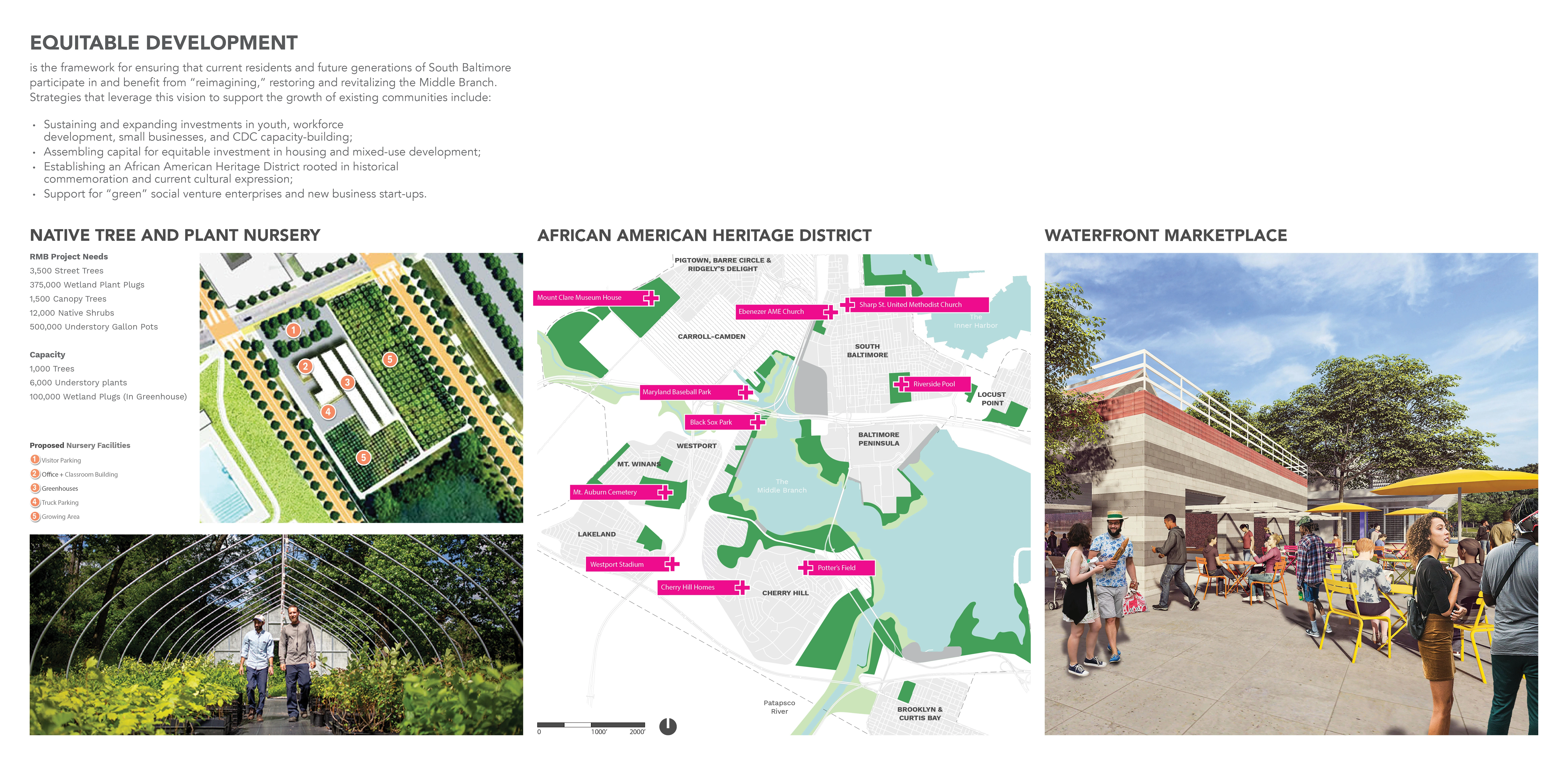 Reimagine Middle Branch is a community-driven initiative to reconnect South Baltimore with a system of world-class parks, trails, programs and economic development plans along 11 miles of the Middle Branch shoreline on the Patapsco River. While the Plan outlines a visionary physical transformation of the Middle Branch, it is also meant to catalyze the intangible transformation of place for one that is equitable and inclusive. To that end, the Plan recommends a series of capital improvements along with public programs, partnerships, policies, job opportunities and equitable economic development initiatives. As a result, this Plan is fundamentally about environmental and social justice, resilience and health.