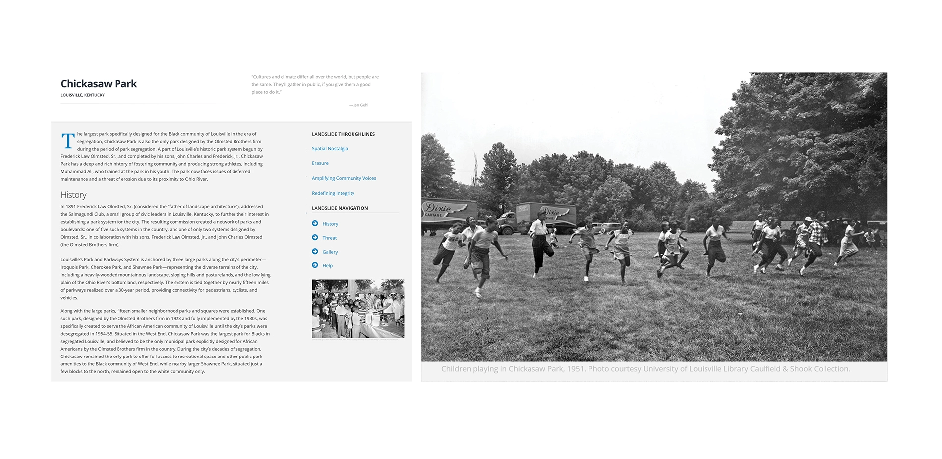 Landslide: Race and Space is a thematic digital report and exhibition about 13 threatened landscapes associated with African Americans, Hispanic Americans, and Native peoples. It includes an introduction detailing the historic relationship between race and space in America, an illustrated history of each site, common inequities and threats, defined as “throughlines,” and individualized calls to action. The digital exhibition also includes richly produced video interviews (2-5 minutes each) with landscape architects, historians, designers, and kin-keepers who offer compelling personal perspectives on the “throughlines” and bring to life each site’s history/significance. This time-sensitive report was produced in only three months in 2021.