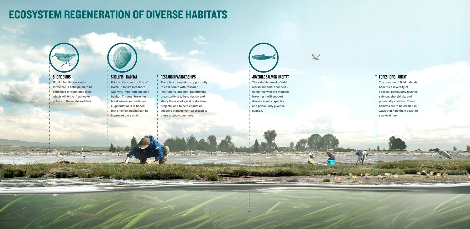 Ecological projects will restore dynamic estuary processes and enhance native and novel habitats to benefit numerous species. Ecosystem-based flood protection strategies will increase resilience against climate change impacts and protect new infrastructure. Park and community integration strategies will enable meaningful relationships between the IIWWTP and the surrounding Iona Beach Regional Park. The strategies will ensure that the plant’s layout responds to ecologically sensitive areas and the community’s desire to minimize its visual impact, while expanding educational, recreational, and experiential park offerings.