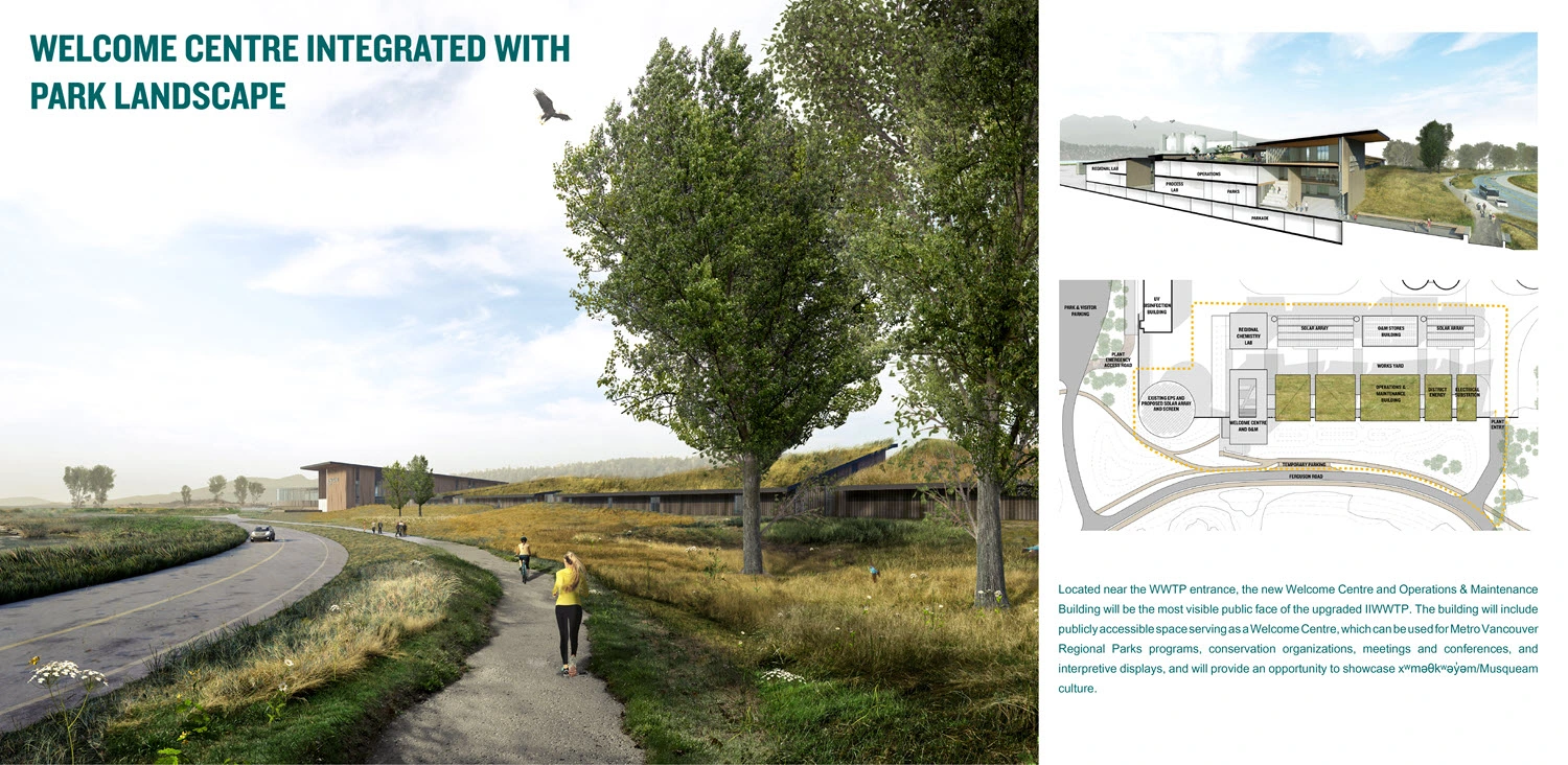 An integrated design process brought together multi-disciplinary expertise to align the project's goals of improving water quality, resource recovery, and integration with the park and community. Throughout the project definition phase, an extensive engagement process was undertaken to work with a variety of organizations impacted by the IIWWTP Projects, including neighbours, park user groups, local government, and Indigenous groups. This collaborative process has enabled priorities such as habitat restoration, traditional resource access, and recognition of xʷməθkʷəy̓əm/Musqueam cultural practices and knowledge transfer to be integrated from early design stages. This process also demonstrated how to work inclusively across disciplines and jurisdictions to balance and integrate social, ecological, technical, and climate-related needs. Through the continuation of an integrated design and delivery process, work on the IIWWTP Projects will further develop and evolve until 2038, and continual improvement will be achieved through ongoing WWTP and park operations.