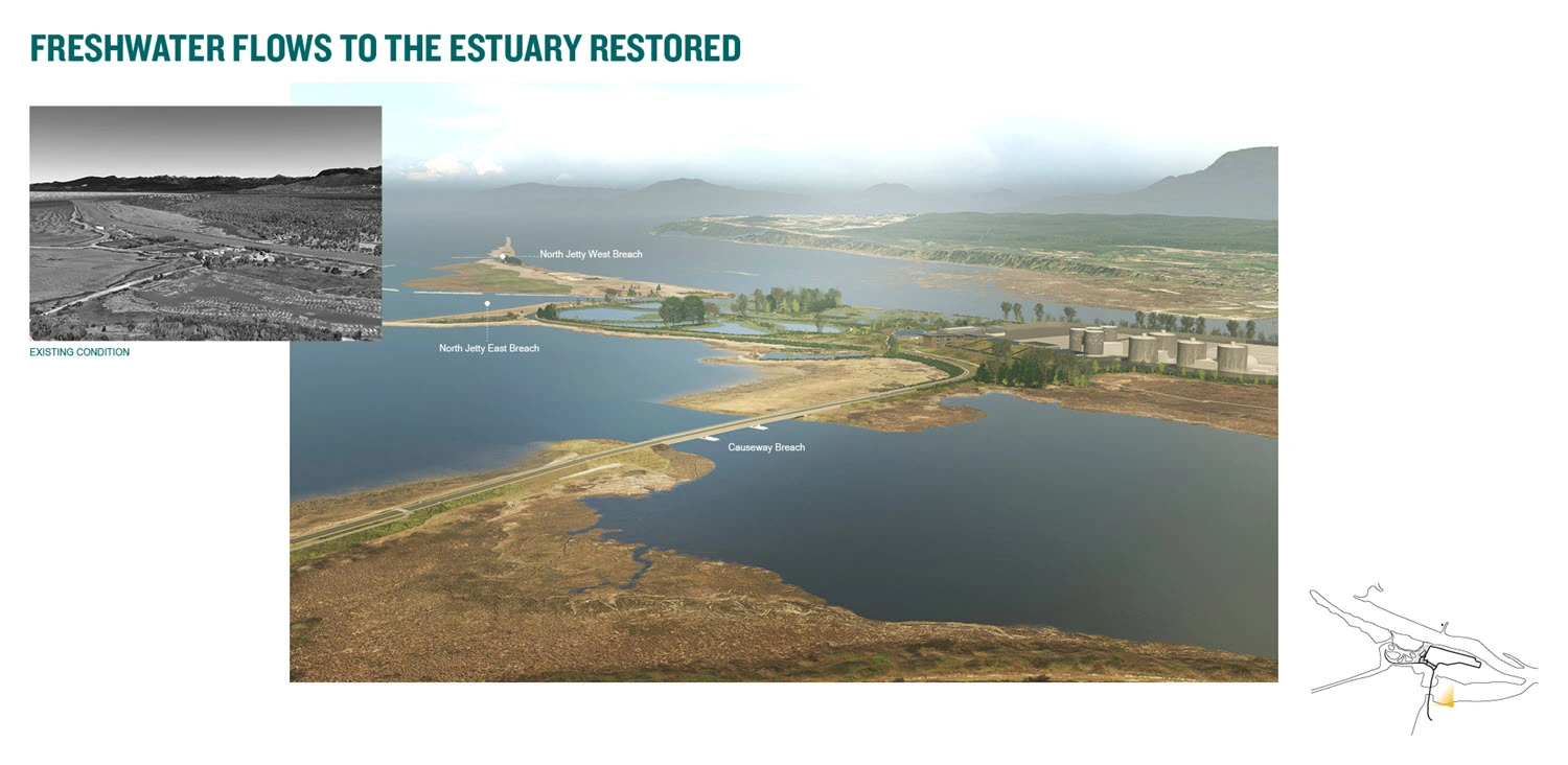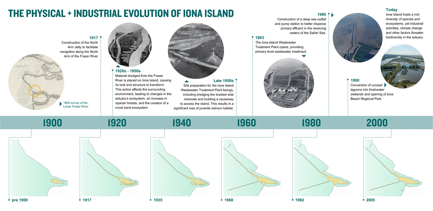 The Iona Island Wastewater Treatment Plant (IIWWTP) in Richmond, BC sits on xʷəyeyət/Iona Island, a complex site of intersecting human and ecological systems. Located in the Fraser River Estuary and across from xʷməθkʷəy̓əm/Musqueam, the existing treatment facility is one of the last plants on North America's west coast with only primary level wastewater treatment. Existing infrastructure in the estuary, including dikes and jetties, has disrupted natural sediment and freshwater flows, directly impacting juvenile salmon and other species. Furthermore, climate change poses a significant threat to the region, with projections estimating one metre of sea level rise by 2100.