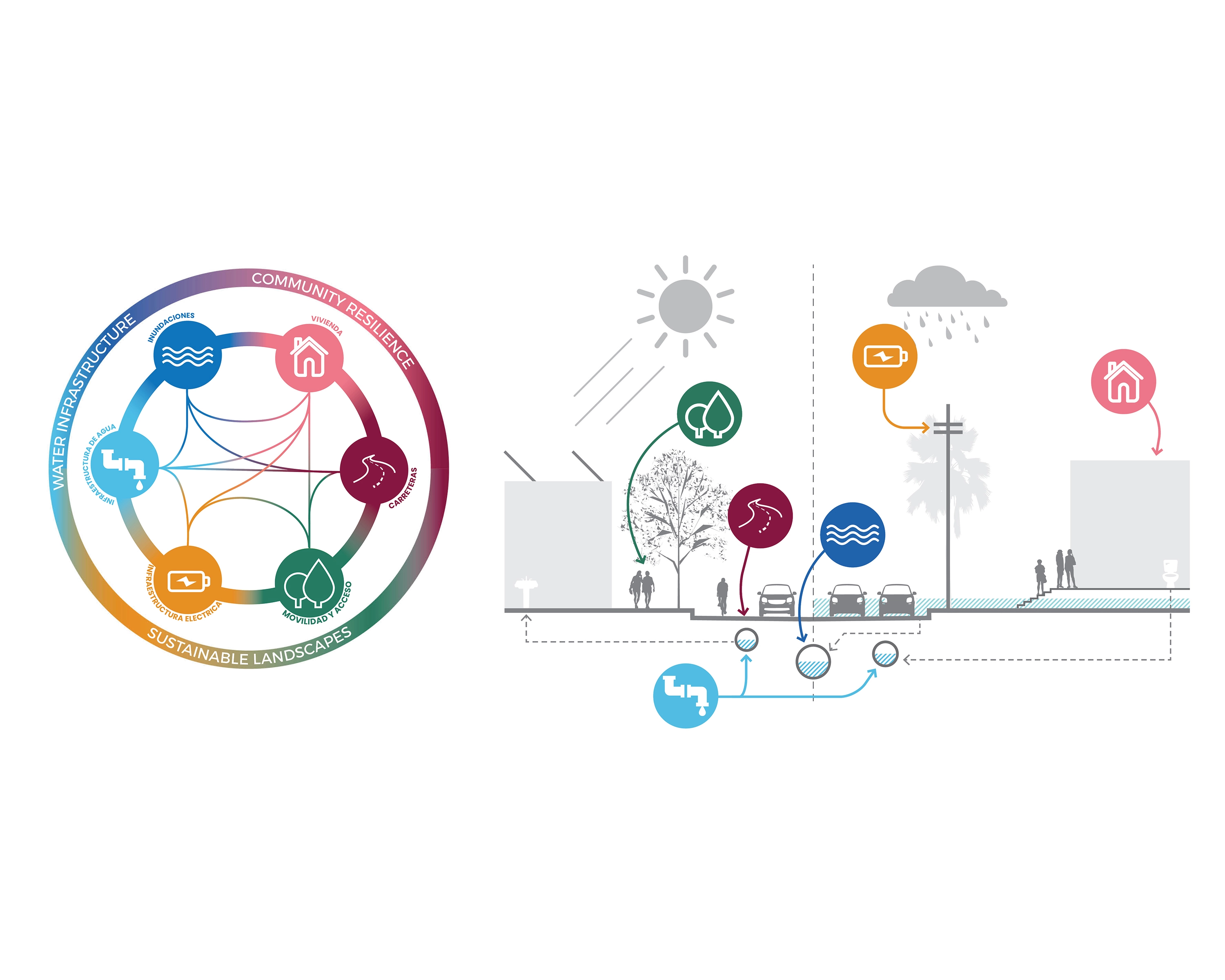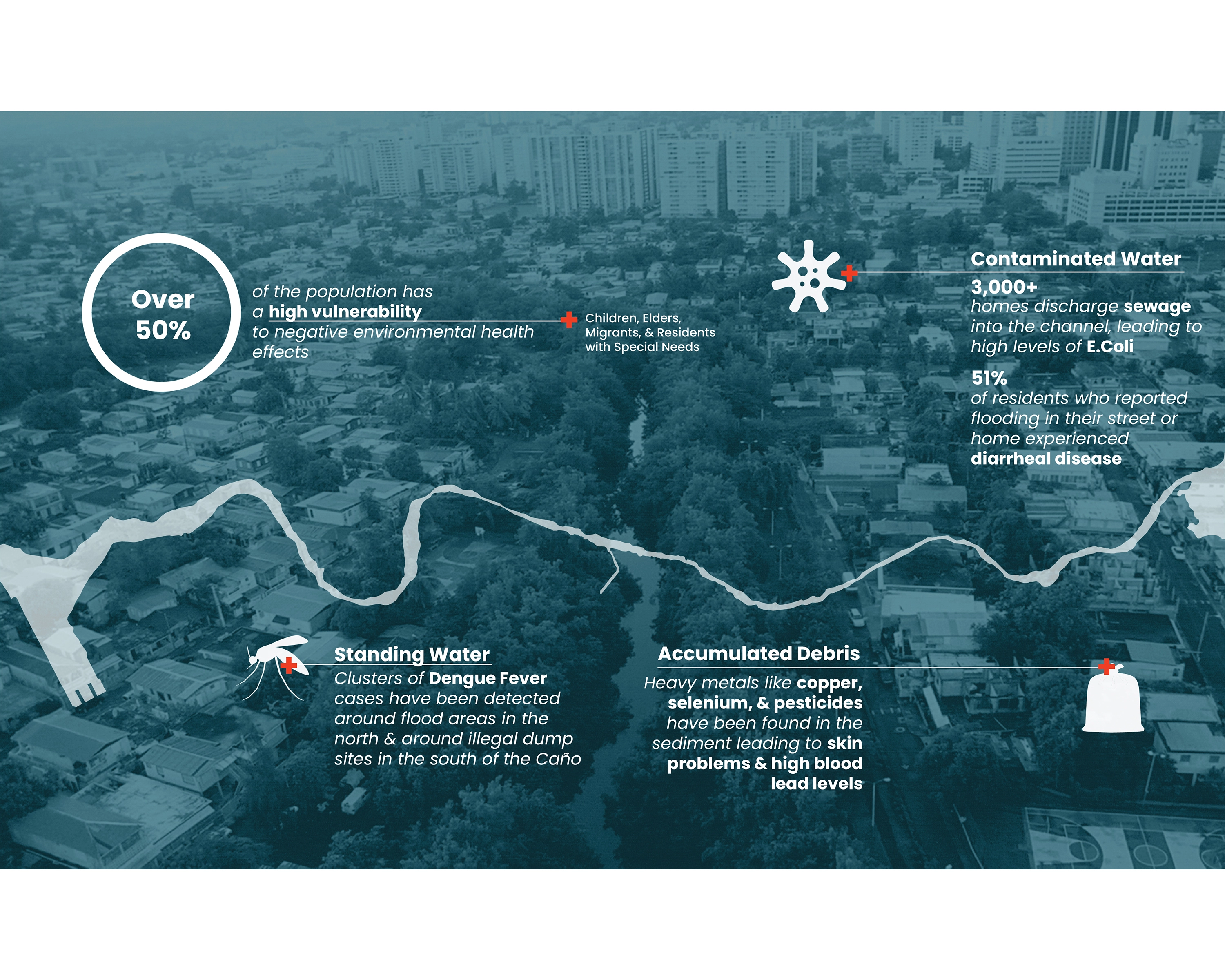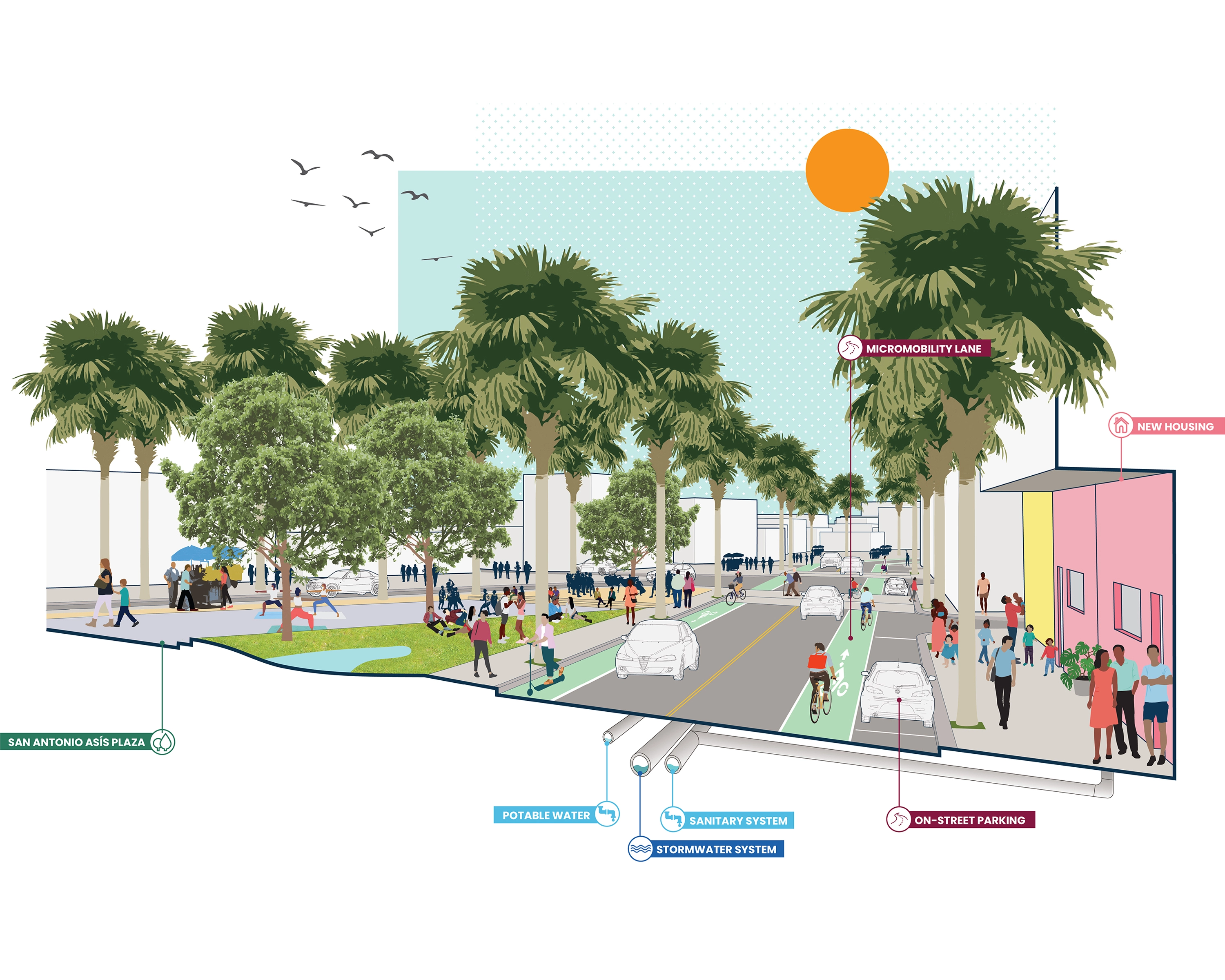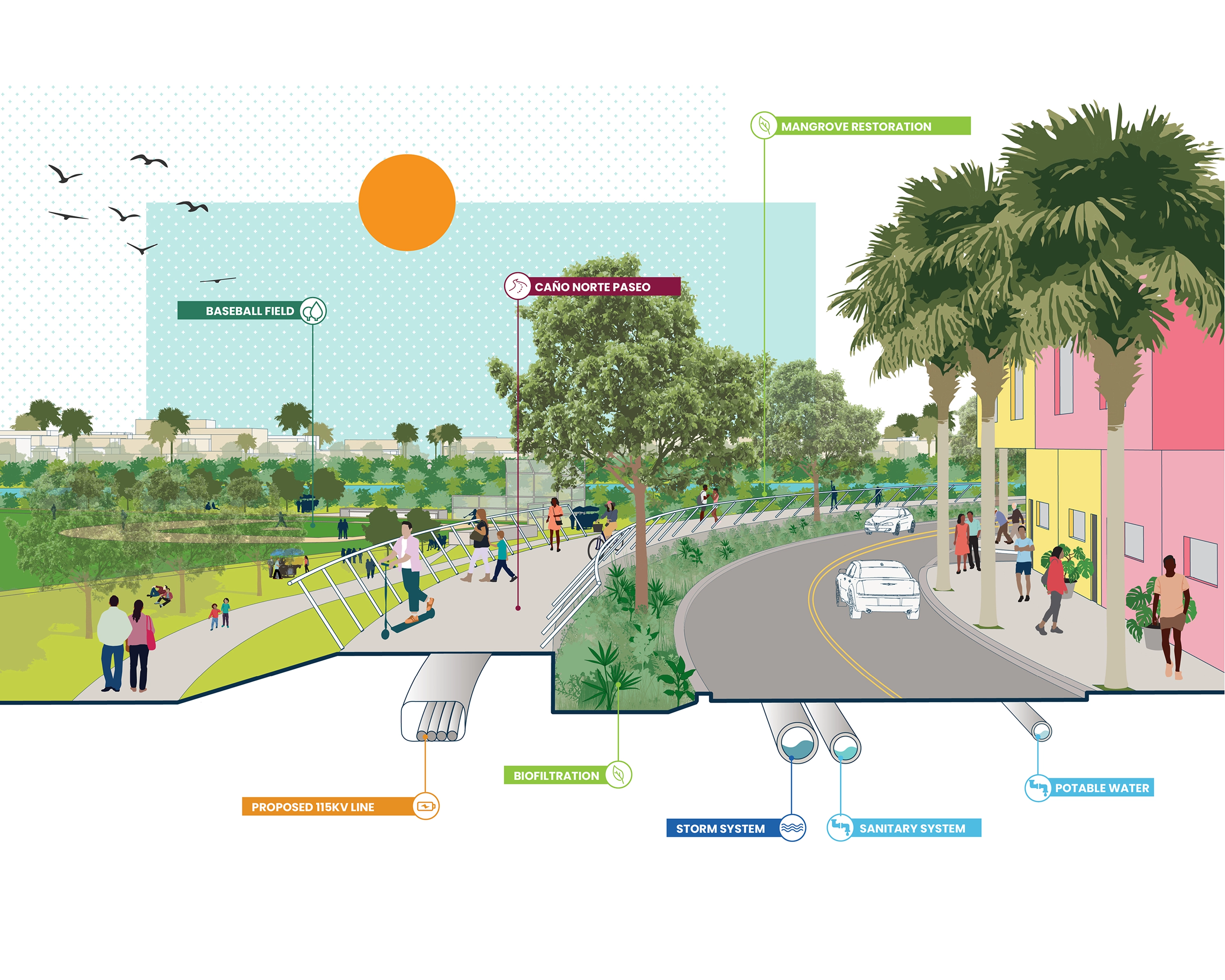 The eight communities of the Caño Martín Peña District were built piece-by-piece by their residents who recognize that their greatest asset in the face of a changing climate is their social capital. The Caño Martín Peña Comprehensive Infrastructure Master Plan was developed to serve the communities’ needs by improving their collective health and quality of life, incorporating nature-based strategies and climate change risk analysis to develop holistic solutions while safeguarding the communities’ deep social bonds as the fundamental link. The plan is grounded in a social and environmental justice framework, surveys and consultation with residents and community leaders, as well as coordination with Commonwealth and Federal agencies.