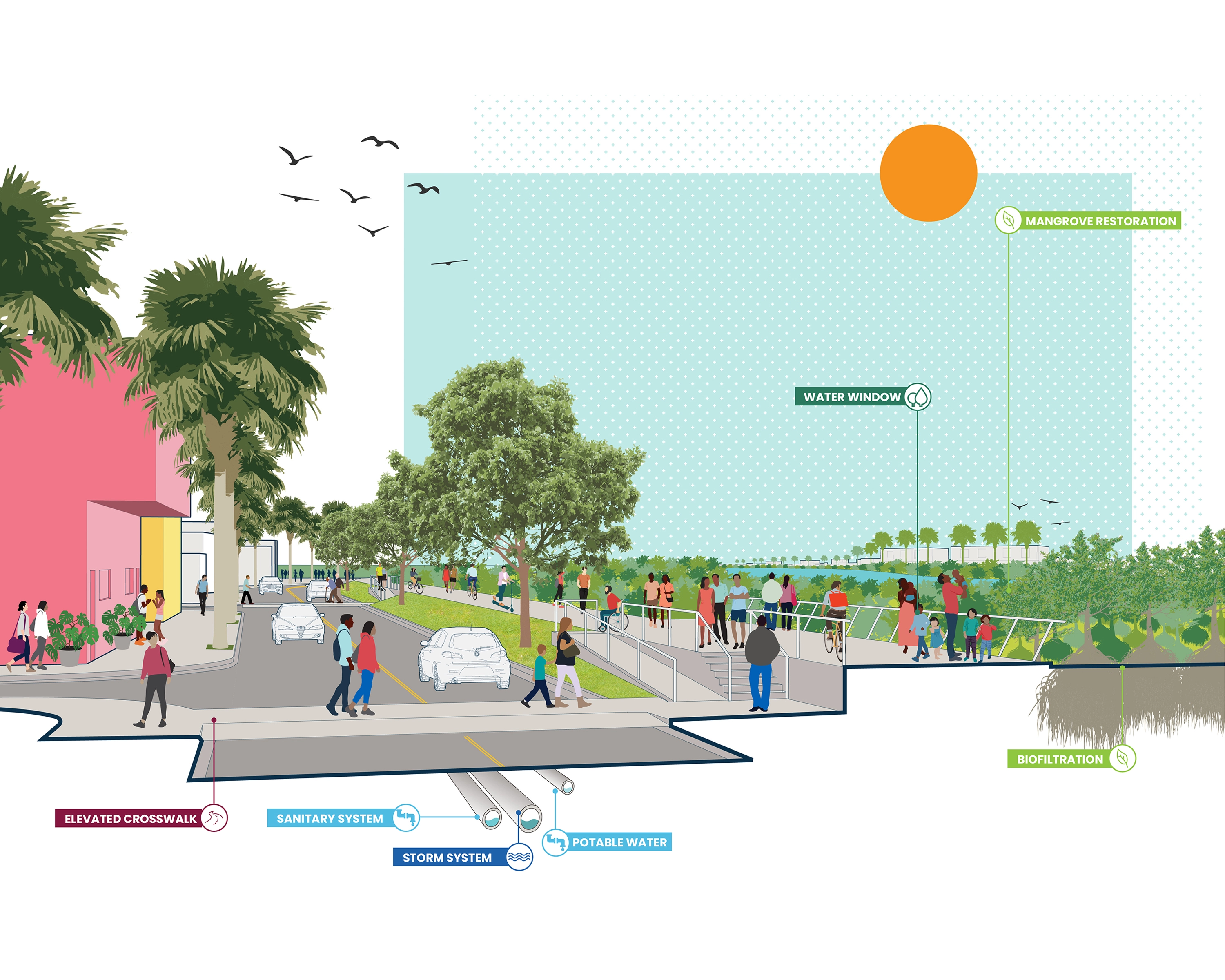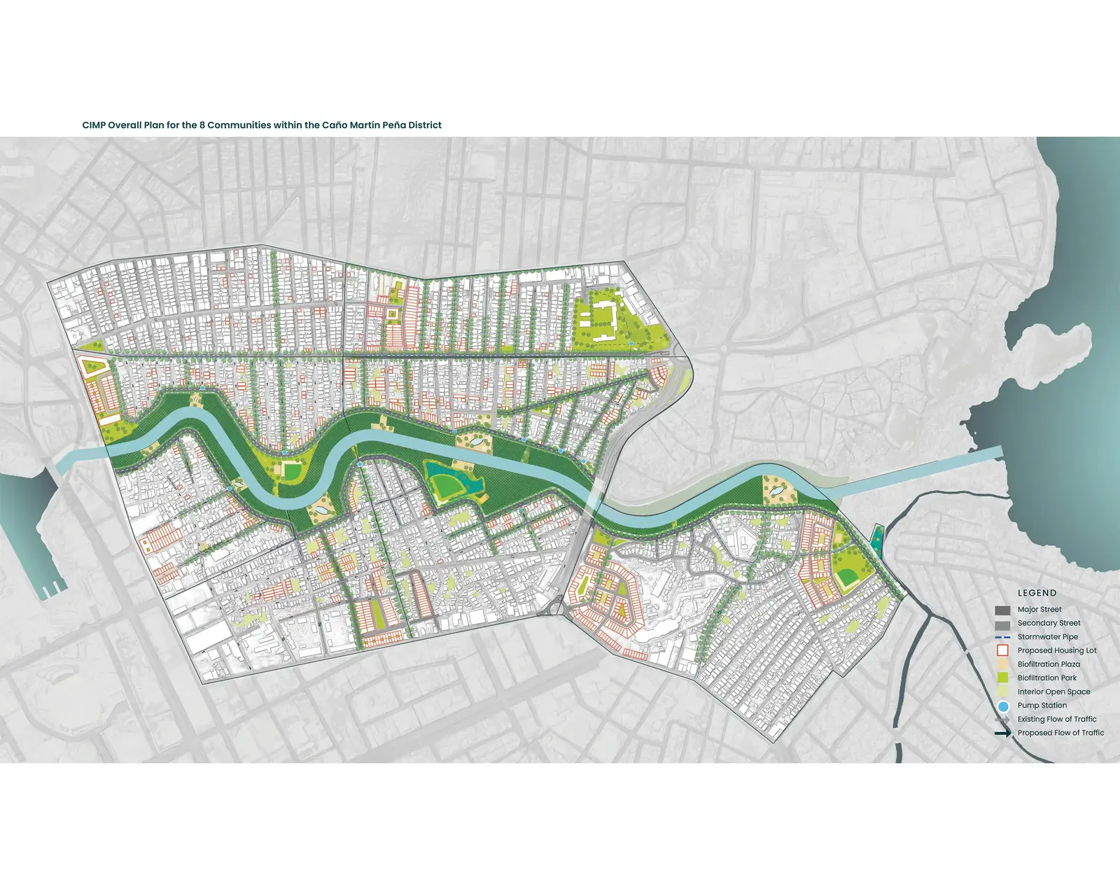 The Caño Martín Peña (CMP) District is a resilient and resourceful collection of eight communities that emerged informally around a channel of the San Juan Bay Estuary. In the midst of facing numerous challenges, these community members recognized their social capital as their greatest asset for survival and improved quality of life. More than 20 years ago, the eight communities formed local groups and a unified coalition to advocate for their homes, their right to stay in their communities, and to push for better infrastructure, ecological health, and economic opportunities. The Caño Martín Peña Comprehensive Infrastructure Master Plan (CIMP) is a testament to the power of community agency in addressing these communities’ unique challenges and is built upon the groundwork laid by the 2004 Plan de Desarrollo Integral y Usos del Terreno: Distrito Especial Caño Martín Peña (PDI), which was adopted as Puerto Rico Law 489. The CIMP is a transformative and actionable vision that directly addresses environmental and social justice concerns. The plan was developed through extensive collaboration with the coalition of the eight distinct communities of Caño Martín Peña. The 12,000 residents of these communities are beset with risks resulting from frequent flooding and a lack of infrastructure. The eight communities were instrumental in shaping the proposals to reflect their needs for a safe and thriving future. The CIMP addresses critical environmental and social justice concerns through a holistic approach that incorporates nature-based solutions, designs that work with natural systems, and climate change risk analysis based on local sea level rise and the Intergovernmental Panel on Climate Change’s AR6 report. This comprehensive plan targets safe drinking water, sanitary water and stormwater collection, flood protection, economic opportunities, and access to safe housing and open space. Environmental sensitivity and sustainability are core principles of the plan, and it accounts for increased flooding due to sea level rise and climate change, as well as financial and political realities of implementing infrastructure and housing projects. By emphasizing the importance of community agency, the CIMP strengthens the connection between residents, local organizations, and governmental agencies charged with ensuring the long-term social, economic, and environmental resilience of the Caño Martín Peña community. This collaboration ensures that the voices of the CMP District communities are heard and that their needs are prioritized in the planning process. Furthermore, the CIMP is a forward-looking plan addressing climate impacts through transformative action, scalable solutions, and protection of biodiversity within the San Juan Bay Tropical Estuary. Innovative approaches to stormwater management, flood protection, and housing development are designed to be scalable and adaptable, allowing for continued improvement in response to changing environmental conditions. In summary, the Caño Martín Peña Comprehensive Infrastructure Master Plan showcases the power of community agency in addressing environmental and social justice concerns. By incorporating the needs and desires of the CMP District communities, this plan paves the way for a more sustainable, equitable, and resilient future that empowers residents and safeguards their social capital.