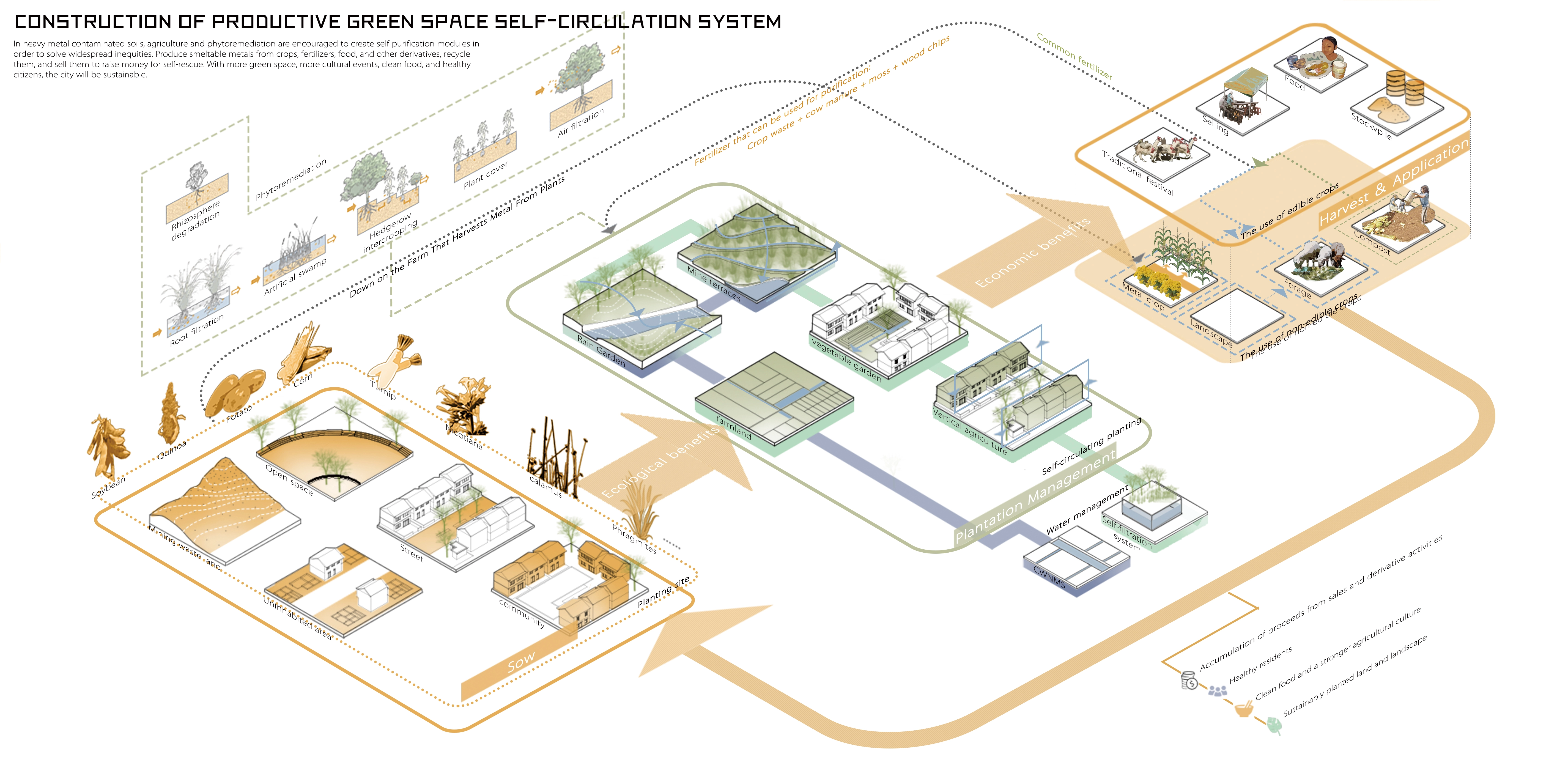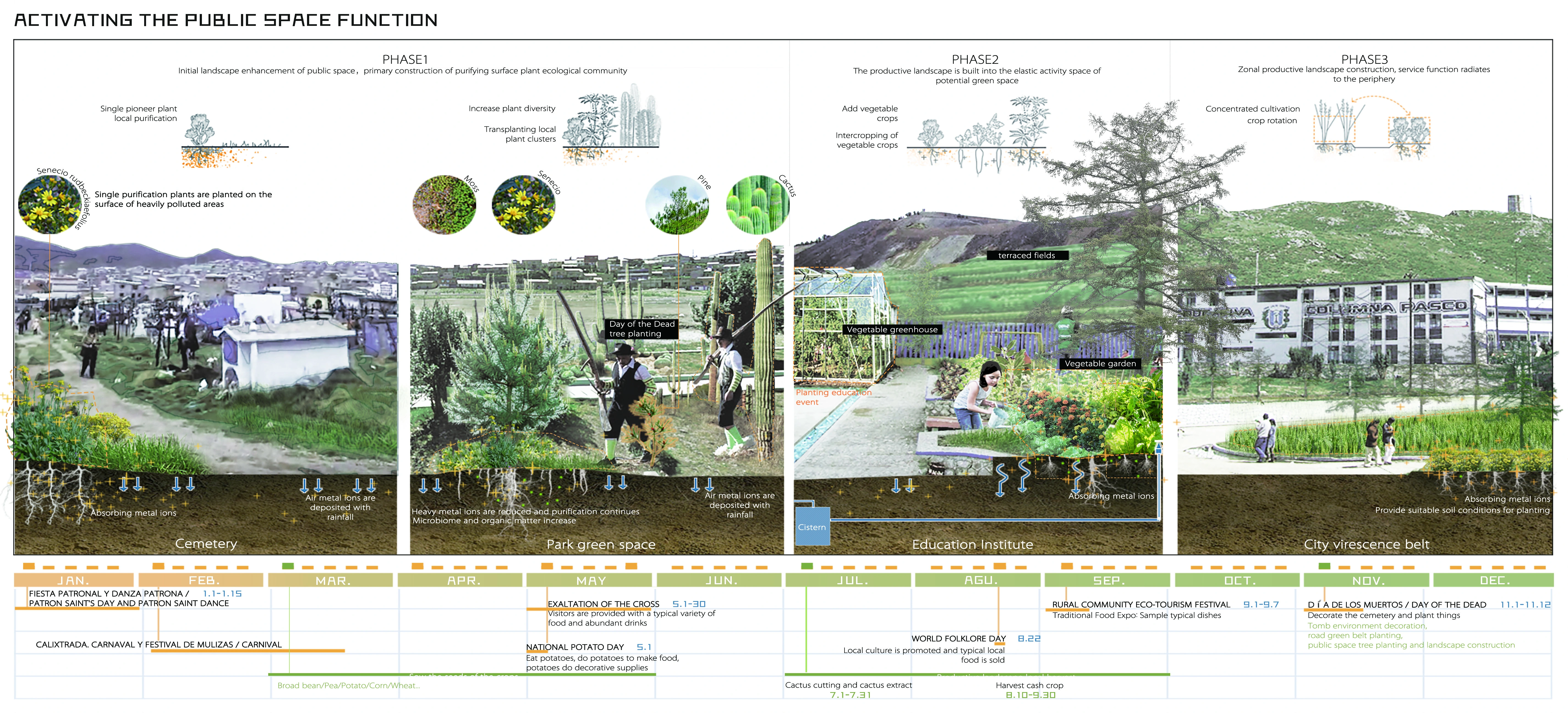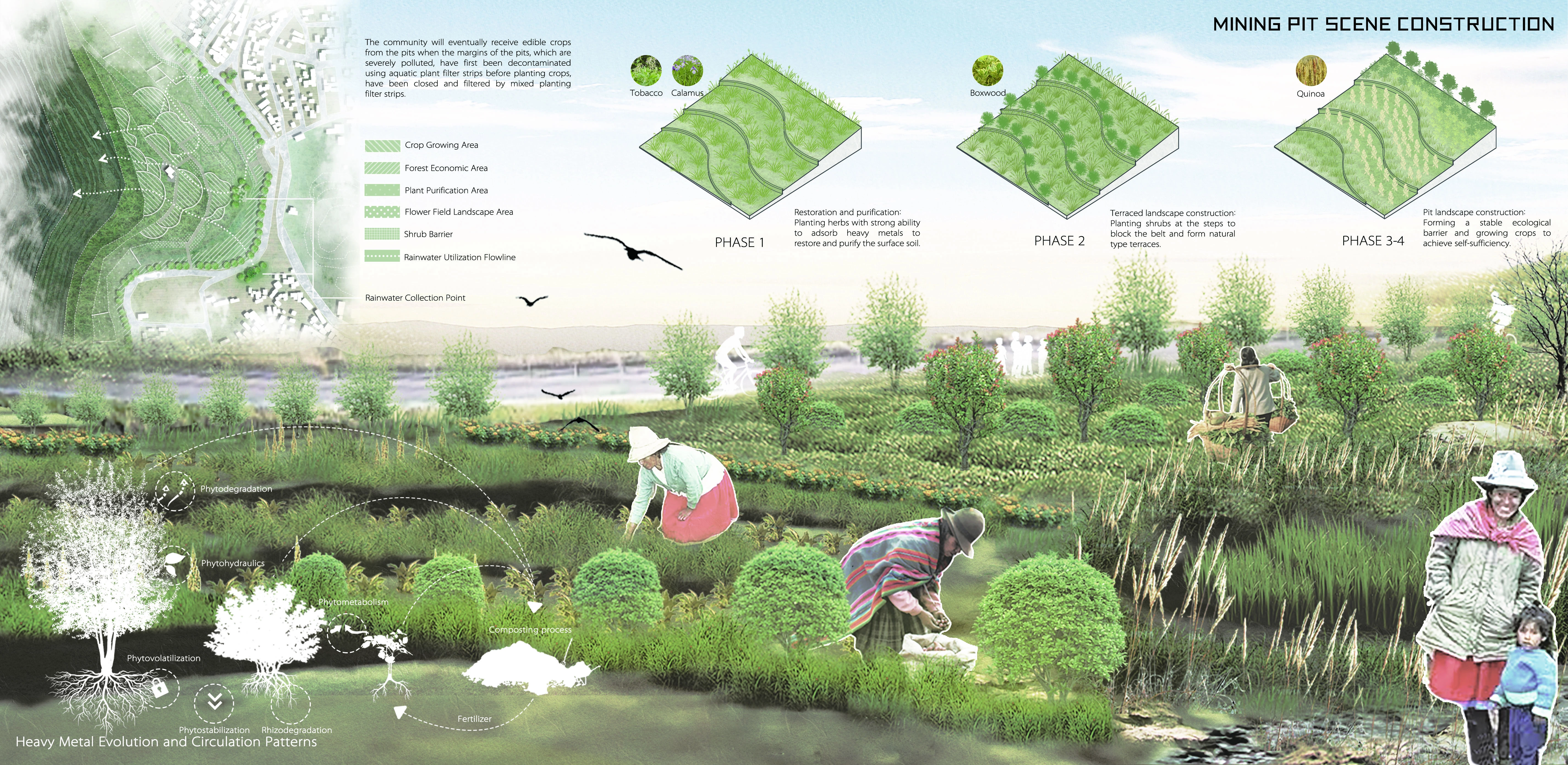 The urban structure and public areas of Cerro de Pasco have been permanently harmed by the site's ongoing mining sector expansion. We needed to find new ways to strike a balance between urban development and the lives of its residents because, ironically, the expansion of the mining industry is a source of economic development for the city. The idea was inspired by agriculture, the second-largest industry in Cerro de Pasco. People and the land make a healthy connection through the development of a self-help network that relies on the plant purification module of crops. The city also develops a self-sufficient cycle system through four stages of sustainable evolution to create the ideal productive green space system.