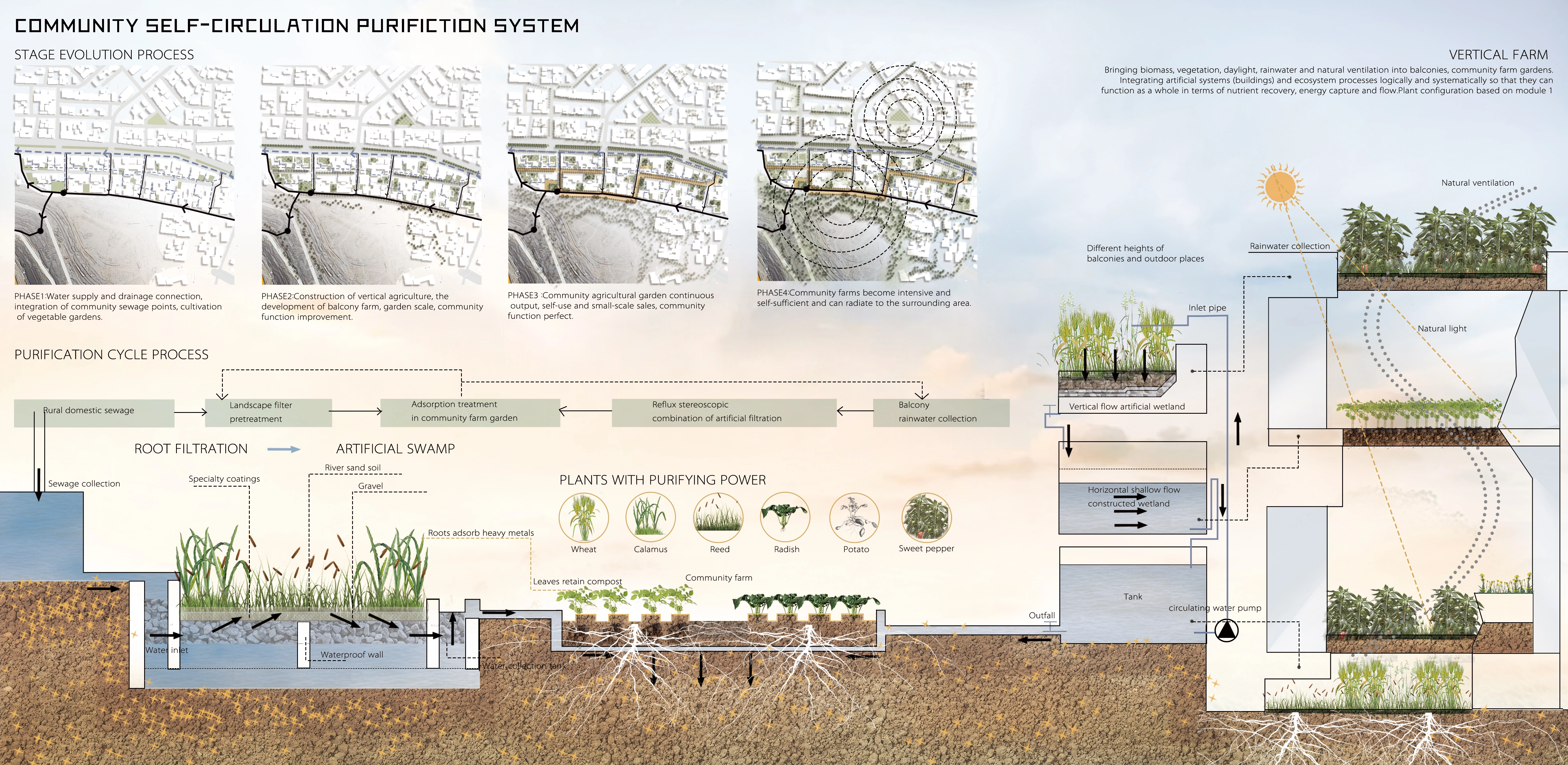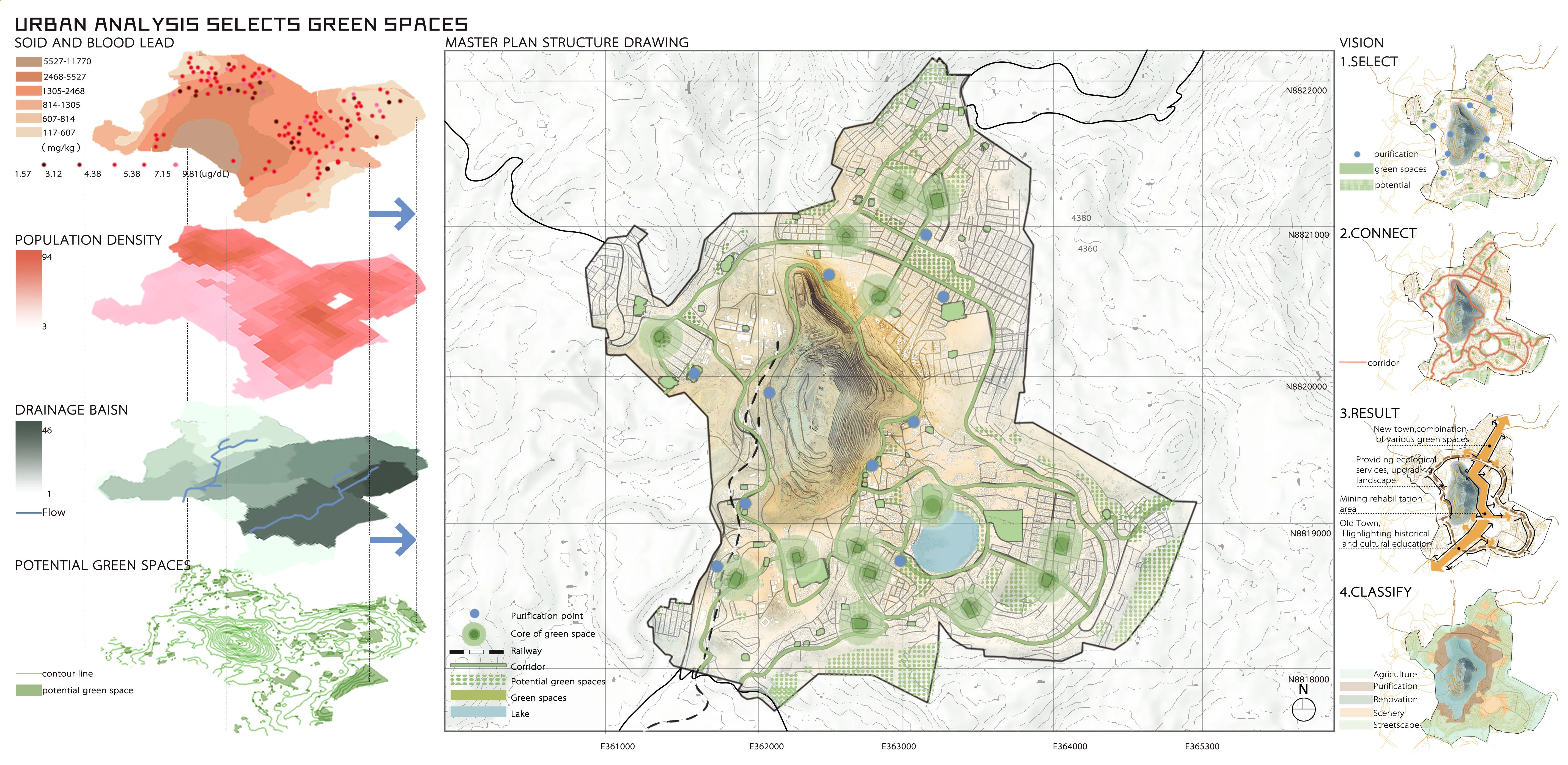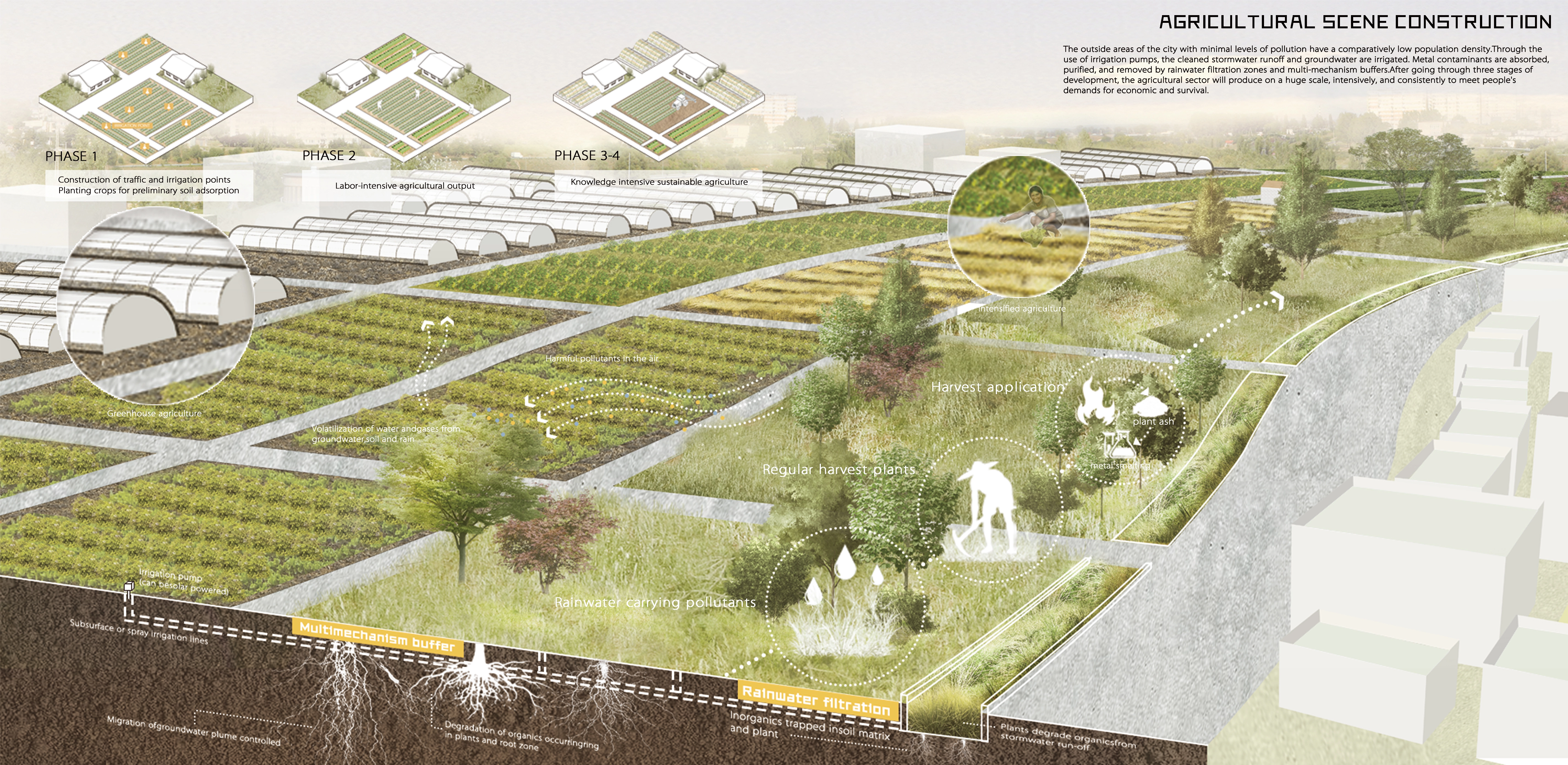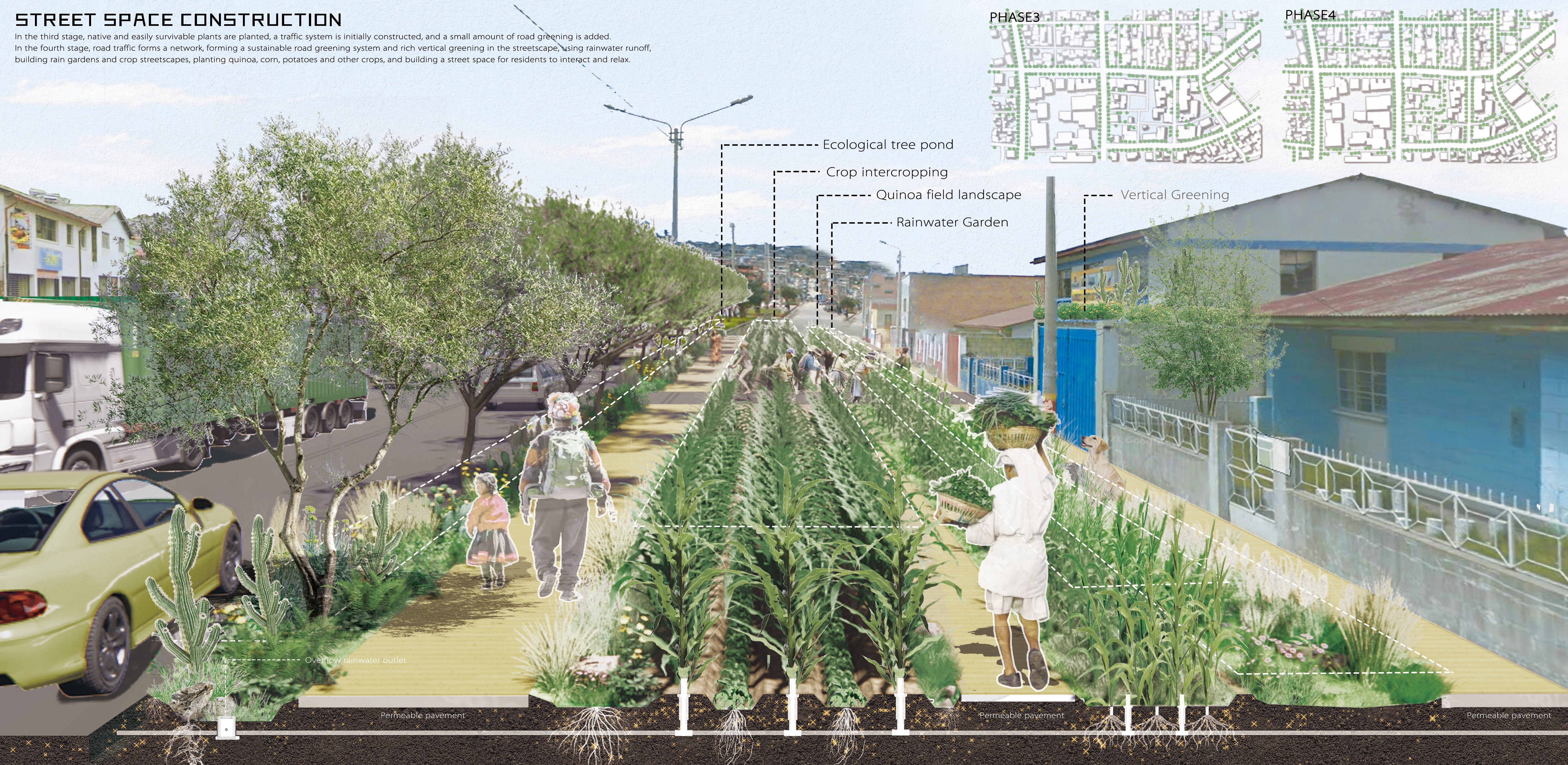 The urban structure and public areas of Cerro de Pasco have been permanently harmed by the site's ongoing mining sector expansion. We needed to find new ways to strike a balance between urban development and the lives of its residents because, ironically, the expansion of the mining industry is a source of economic development for the city. The idea was inspired by agriculture, the second-largest industry in Cerro de Pasco. People and the land make a healthy connection through the development of a self-help network that relies on the plant purification module of crops. The city also develops a self-sufficient cycle system through four stages of sustainable evolution to create the ideal productive green space system.