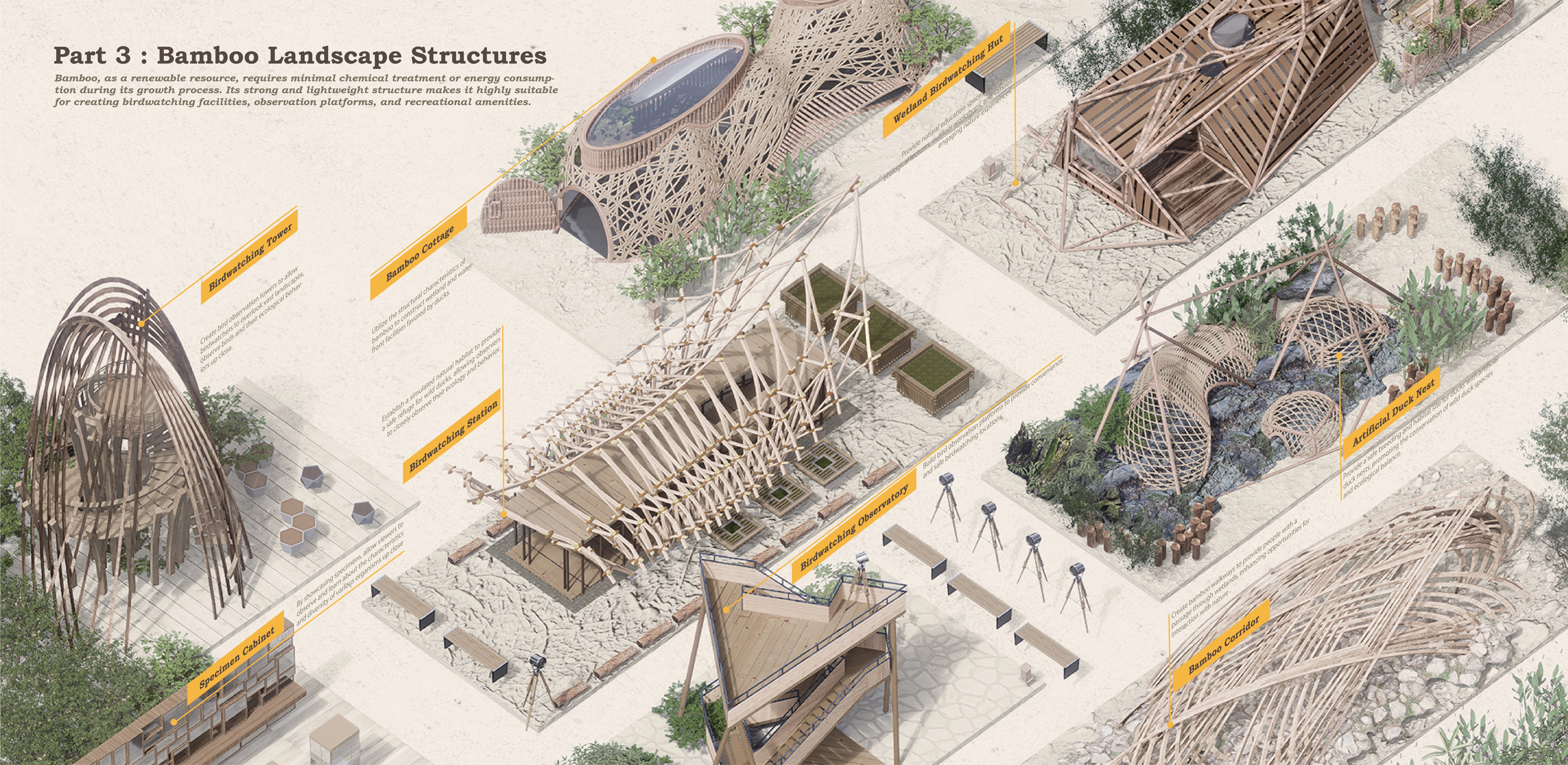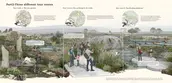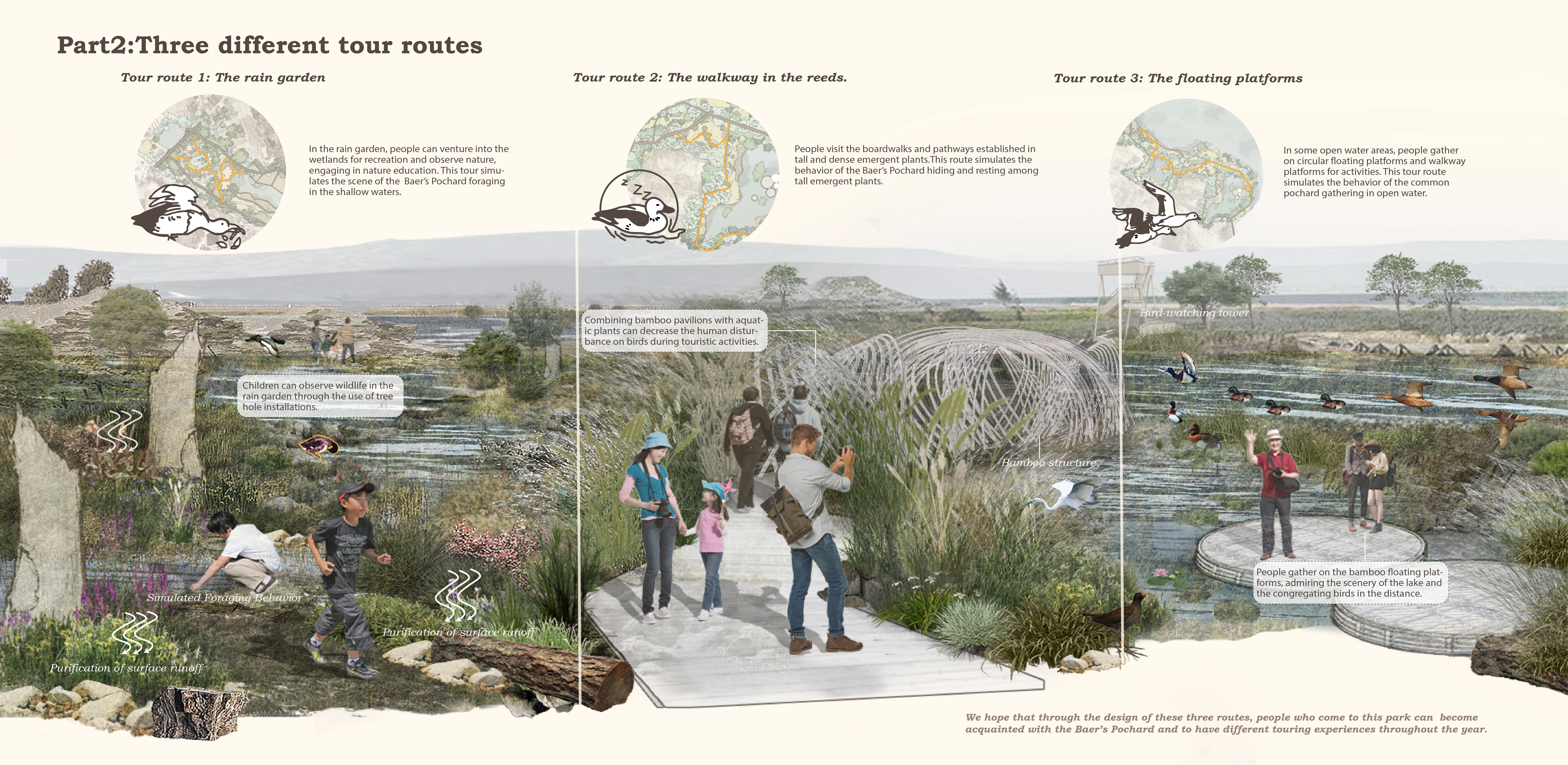 3. Human-bird coexistence strategy: We want the wetland park to be a place for tourism and education where people can observe and understand Baer's pochard. We divide the park into three areas: human-bird coexistence area, buffer zone and core conservation area. We open the core area gradually as the bird population recovers. We design three tour routes: rainwater garden, stack road and floating platform to simulate Baer's pochard's life. We use sustainable facilities in the park.