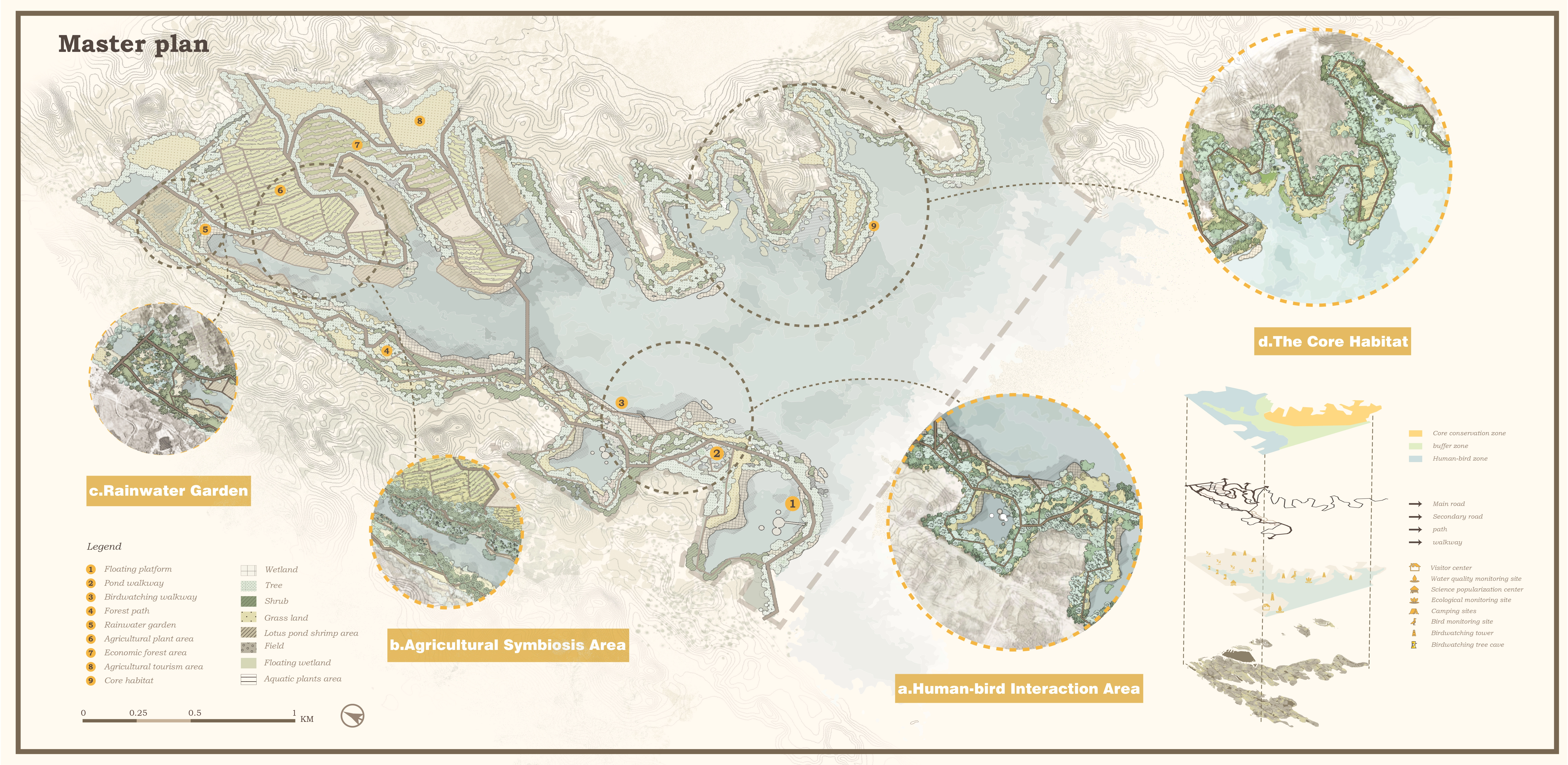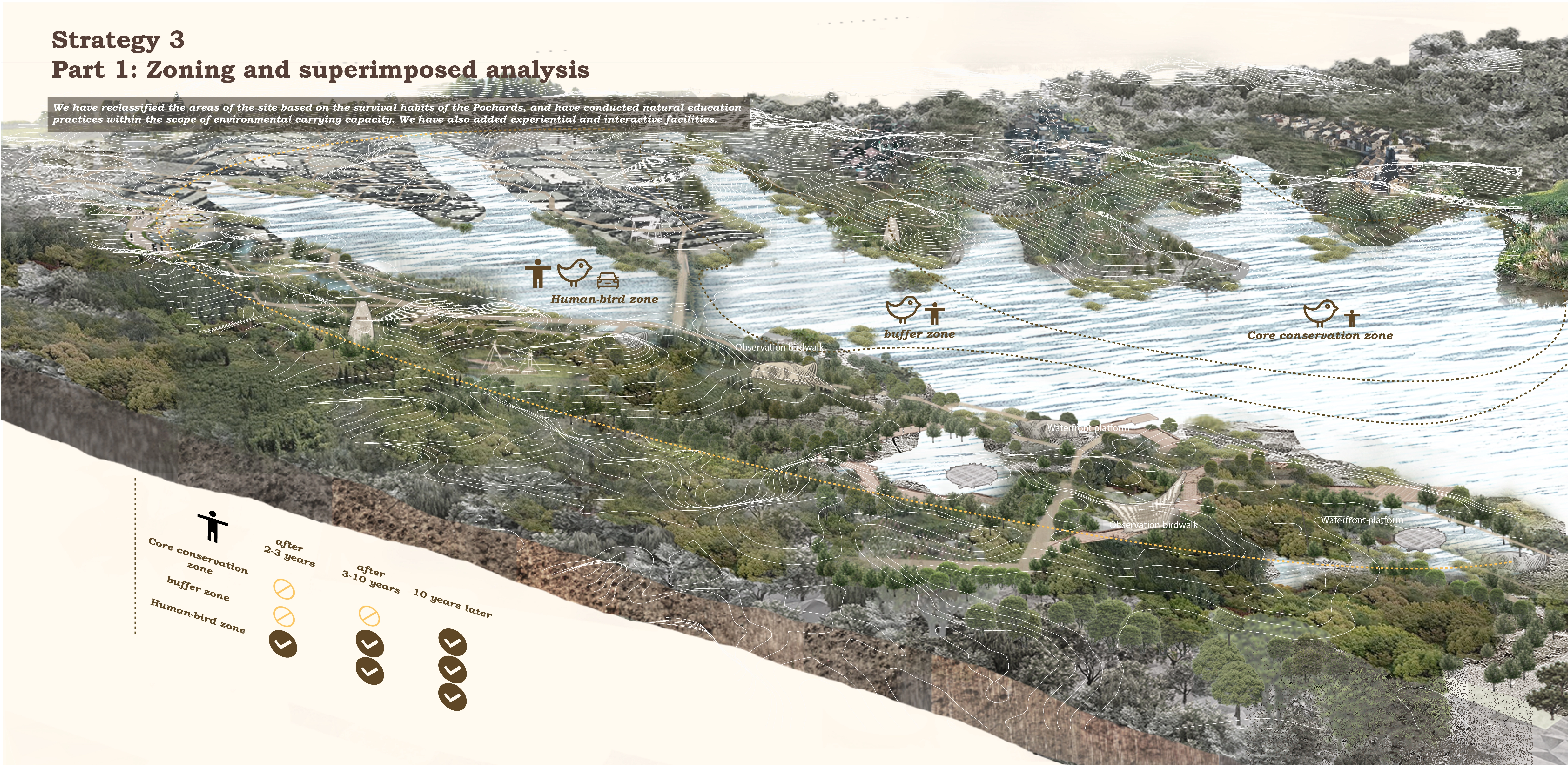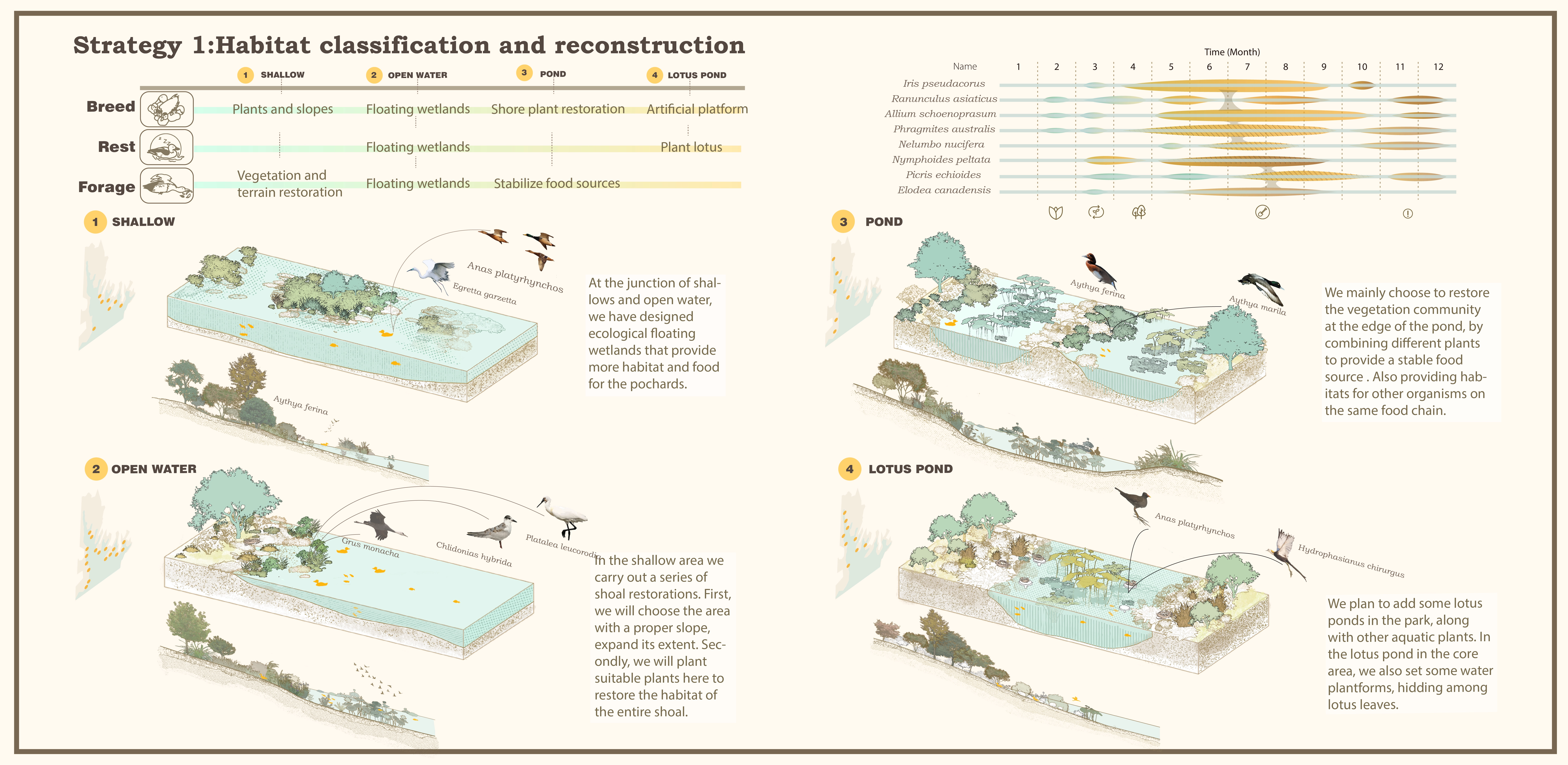 1. Ecological strategy: Based on Baer's pochard's habits, we design four ecological models: shallow beach lotus pond, pond and open water area. We restore, transform and add wetlands on site and create artificial platforms for nesting.