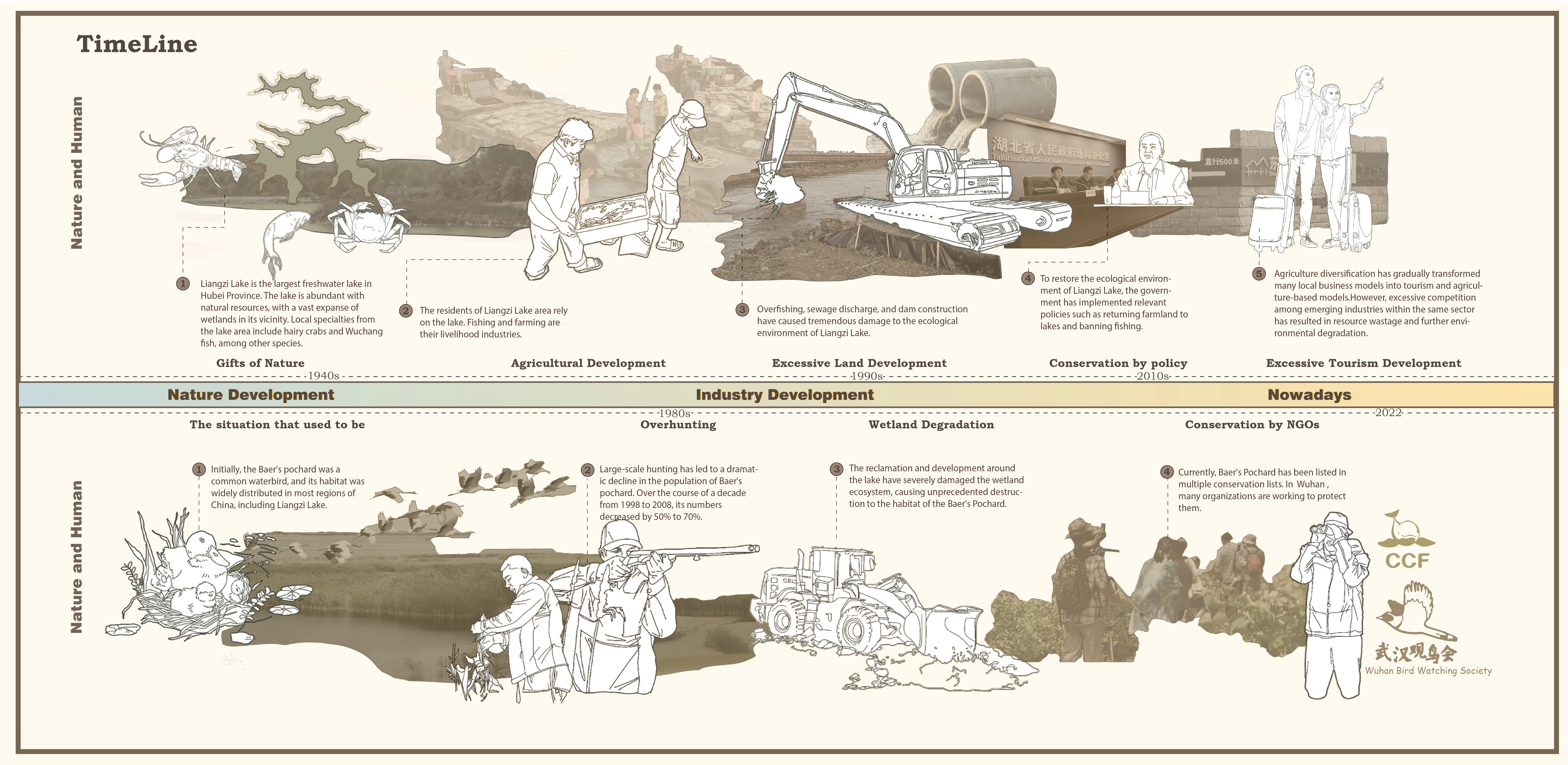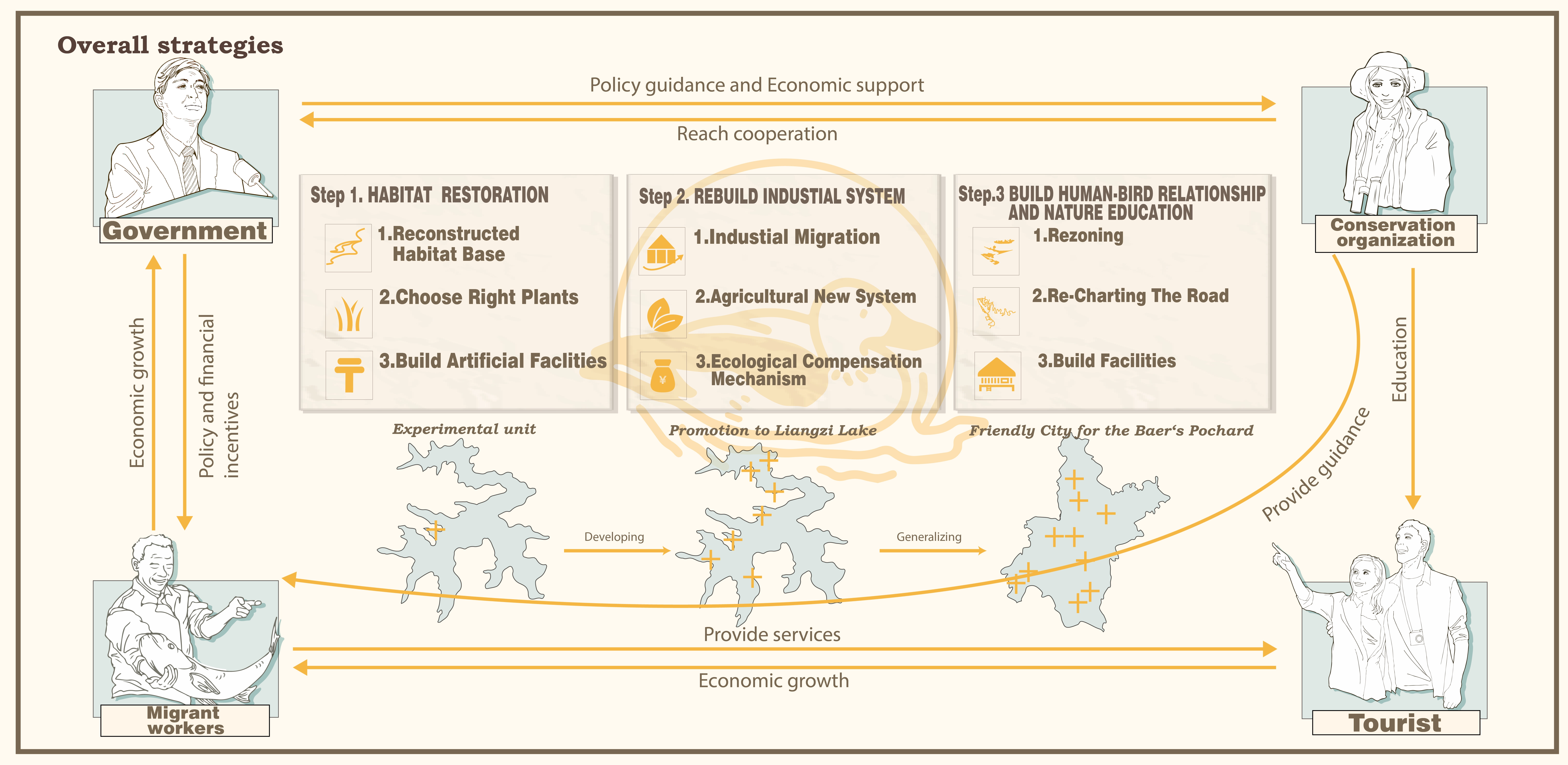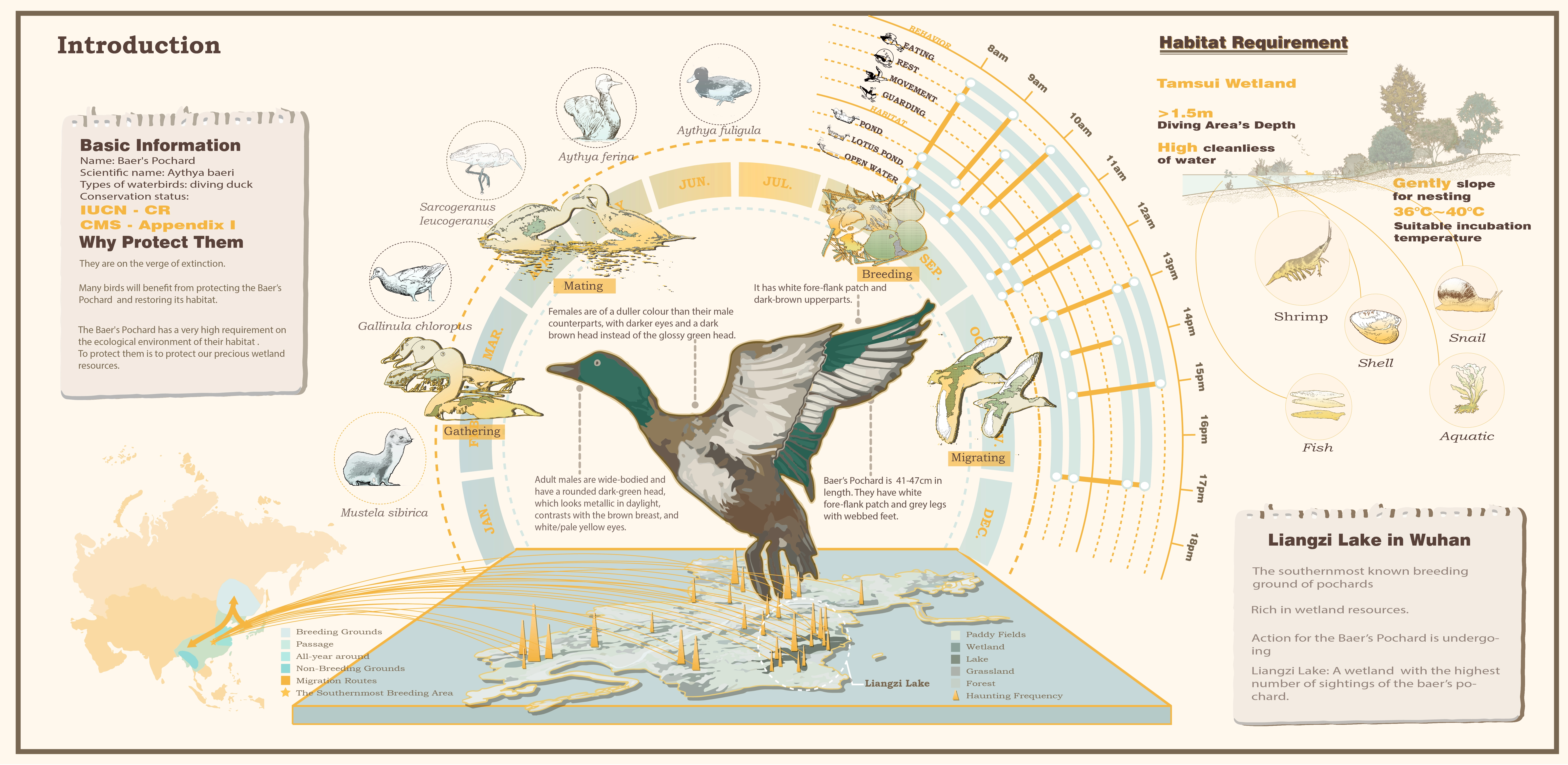 Human activities pose a tremendous threat to the planet's biodiversity. It is crucial to explore how to balance ecology and industry.This project focuses on the critically endangered species of Baer's pochard. We have chosen a typical wetland park in Wuhan, the southernmost breeding ground of the species, situated in an area where traditional agriculture conflicts with nature conservation. We propose a comprehensive strategy to address the needs of various stakeholders, including how to conserve the Baer's pochard and increase its population while utilizing traditional Chinese farming wisdom to maximize economic benefits for local residents and achieve sustainable development. The strategy also involves redesigning the wetland park.