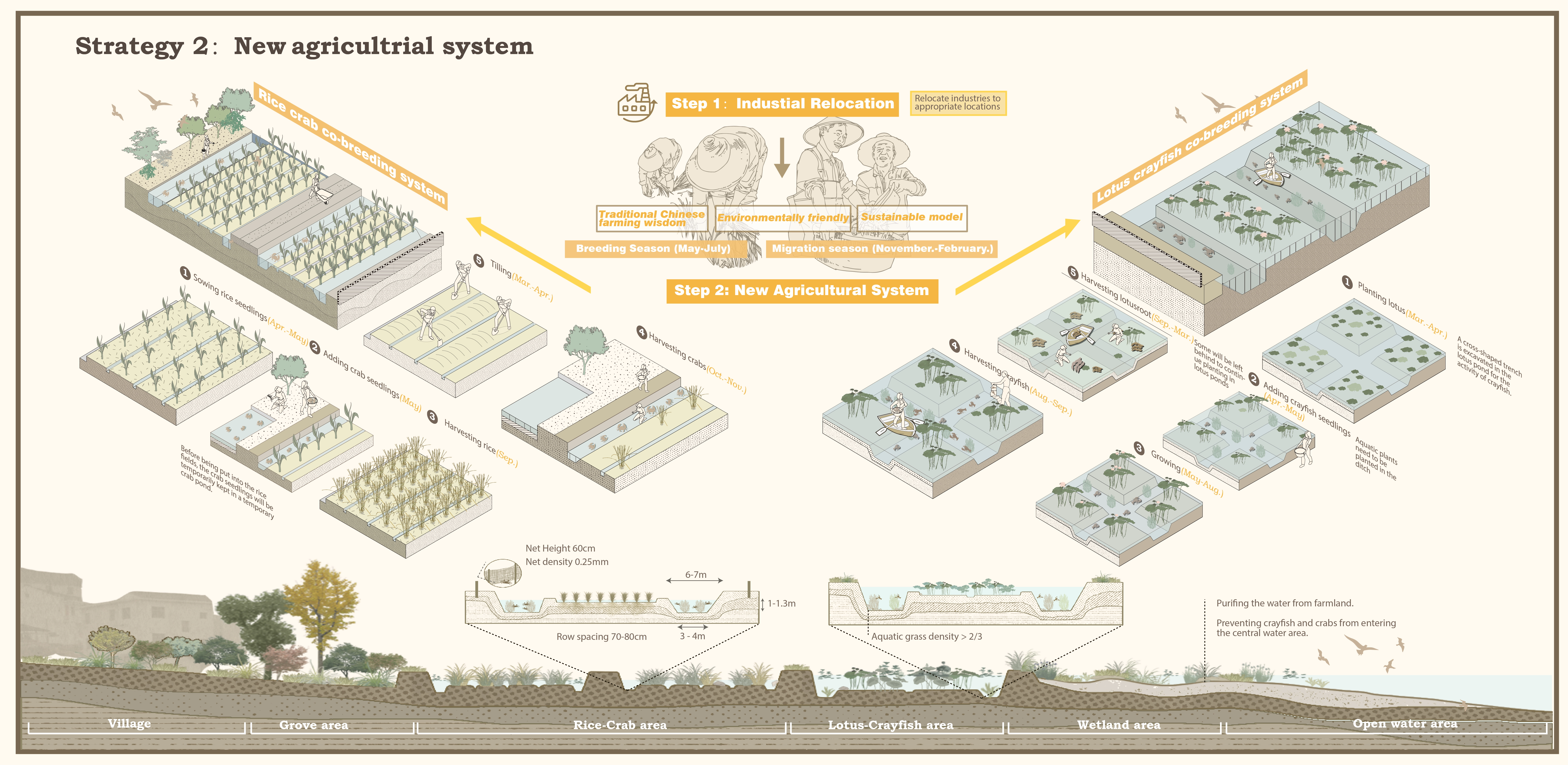 2. Industrial strategy: We relocate tourism industry to minimize wetland impact and design two agricultural systems: lotus shrimp symbiosis and rice crab symbiosis. We use traditional farming wisdom and local aquatic products to protect birds and generate economic benefits. We also design ecological compensation mechanisms for sustainable development.