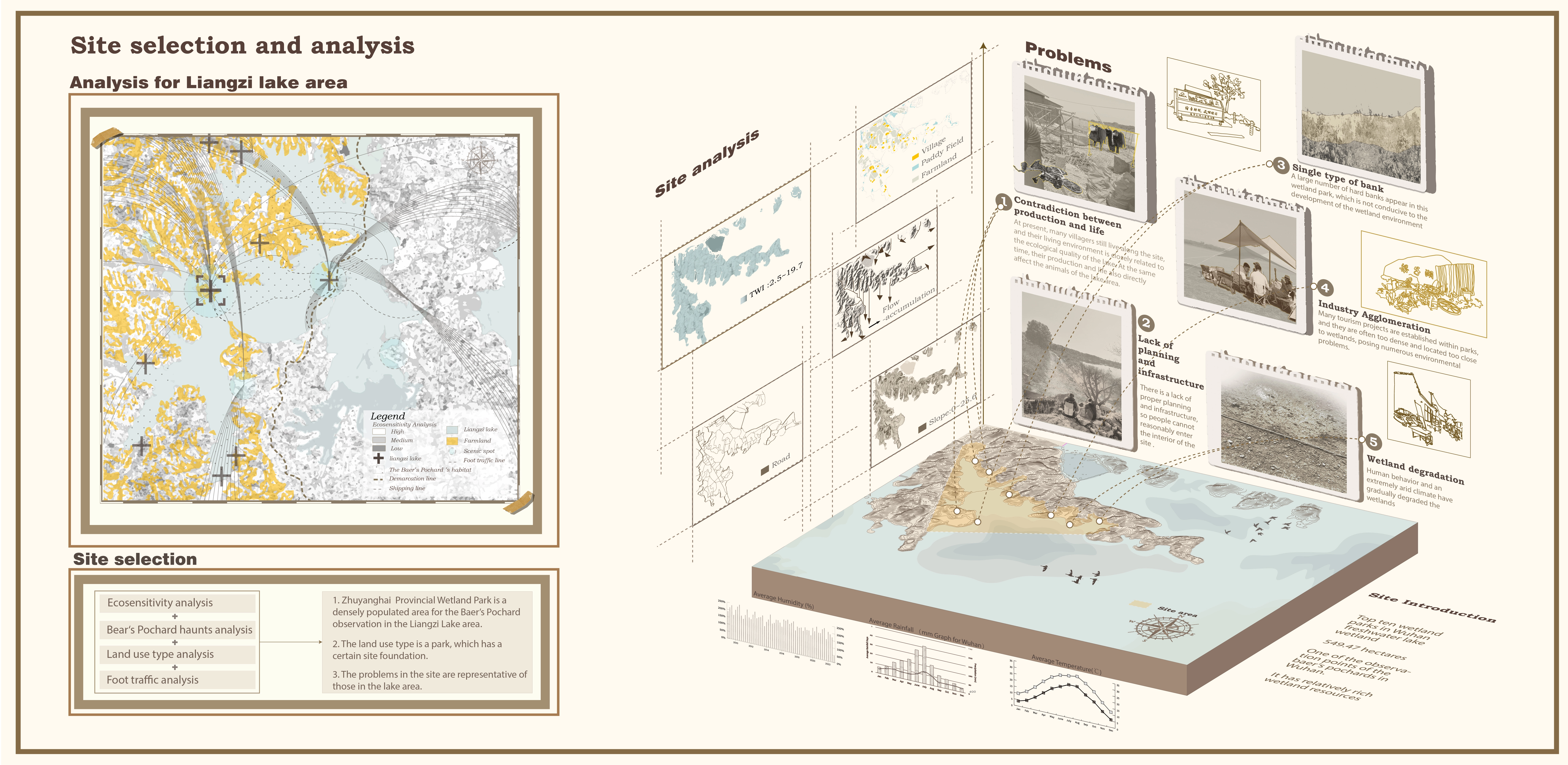 Birds are the most severely affected population in the biodiversity crisis and they are closely related to humans. The main source of the bird crisis is the various environmental destruction caused by human irrational development. Living in Wuhan, which has rich wetland resources but has always faced urban development and ecological conflicts, we hope to find a balance between industry and ecology from the perspective of birds here. While avoiding the homogenization of urban form, we will shape an ecological image with historical heritage by exploring local ecological features to promote sustainable development of society, economy and ecology. The focal species method is the most commonly used research method for protecting birds today, and this project also relies on it to choose the protagonist, the little-known but endangered Baer’s Pochard. Due to wetland degradation and large-scale hunting, Baer’s Pochard has declined sharply in number over the past forty years. Today, there are only about 1,500 left in the world. China, as its main distribution area, must take action to protect it urgently. The project is located in Liangzi Lake Puyanghai Provincial Wetland Park in Wuhan. As the southernmost breeding ground for Baer’s Pochard in the world, Wuhan is also known as China’s wetland city and has long faced problems between urban industrial development and ecological wetland protection. Liangzi Lake is the area where Baer’s Pochard is most frequently observed in Wuhan city. As a traditional agricultural area locally, the contradiction between agriculture and ecology is more prominent. After multiple inspections, we believe that this park with typical local contradictions and undergoing wetland degradation is suitable as our foothold for completion.