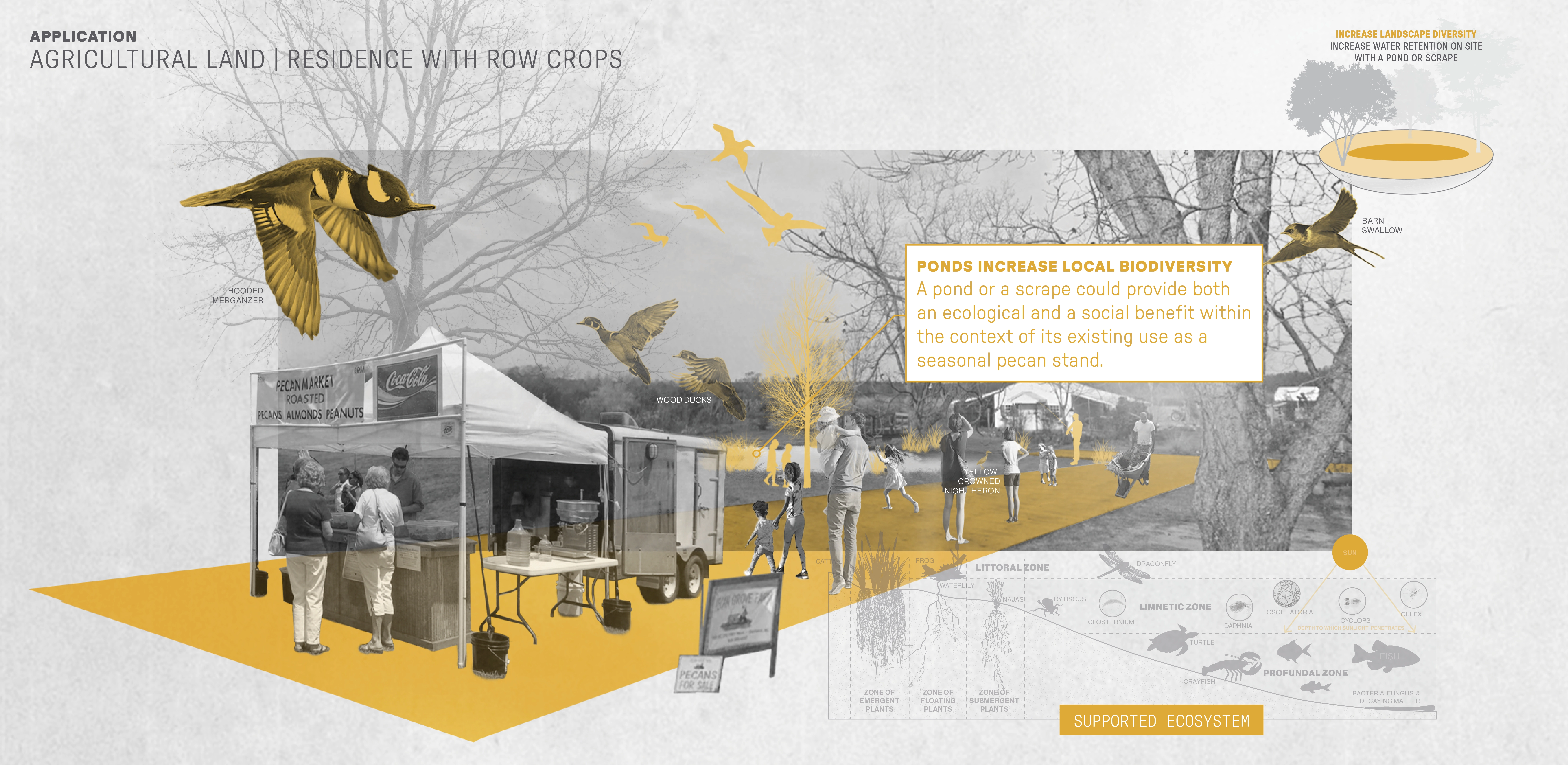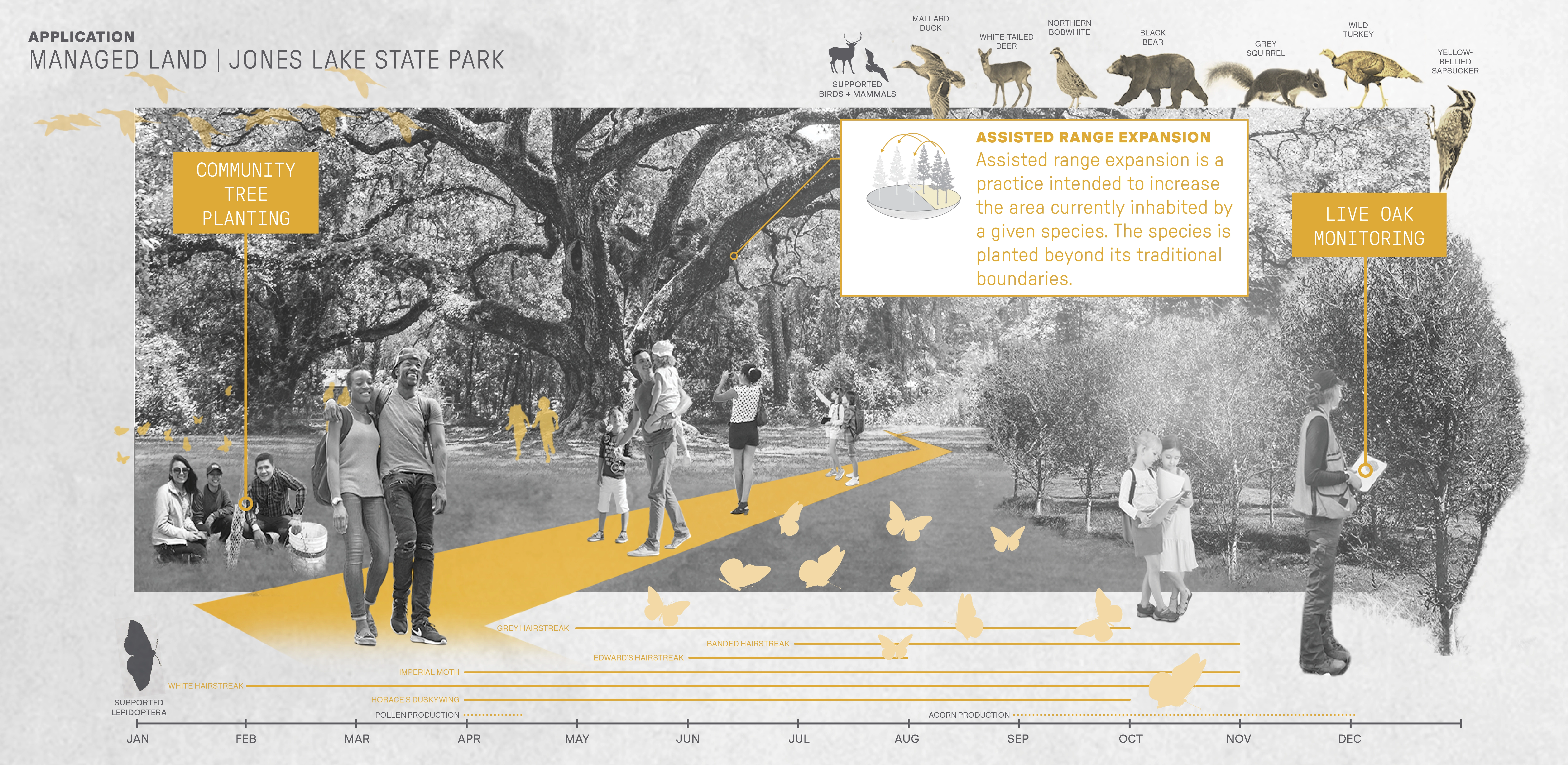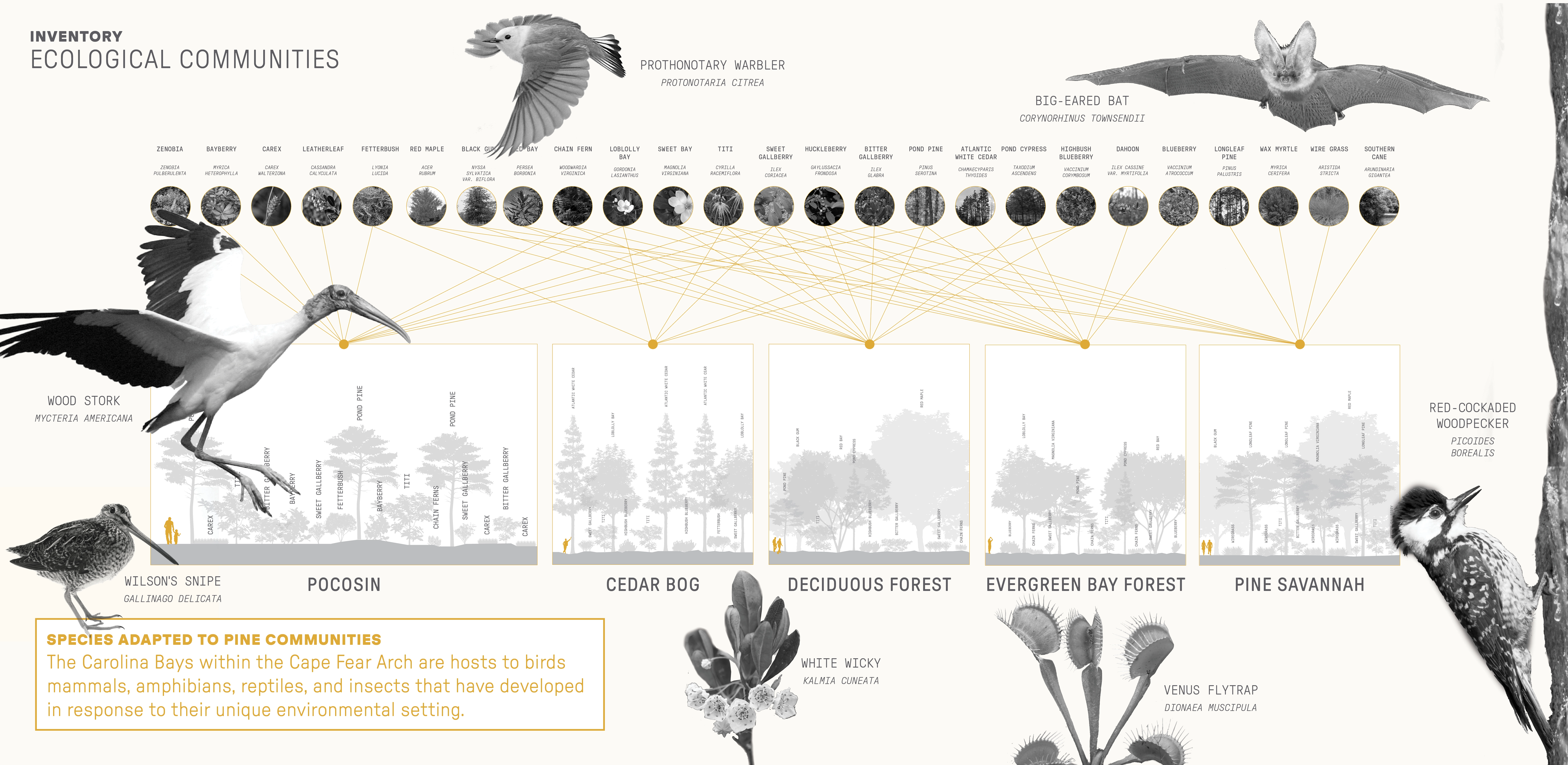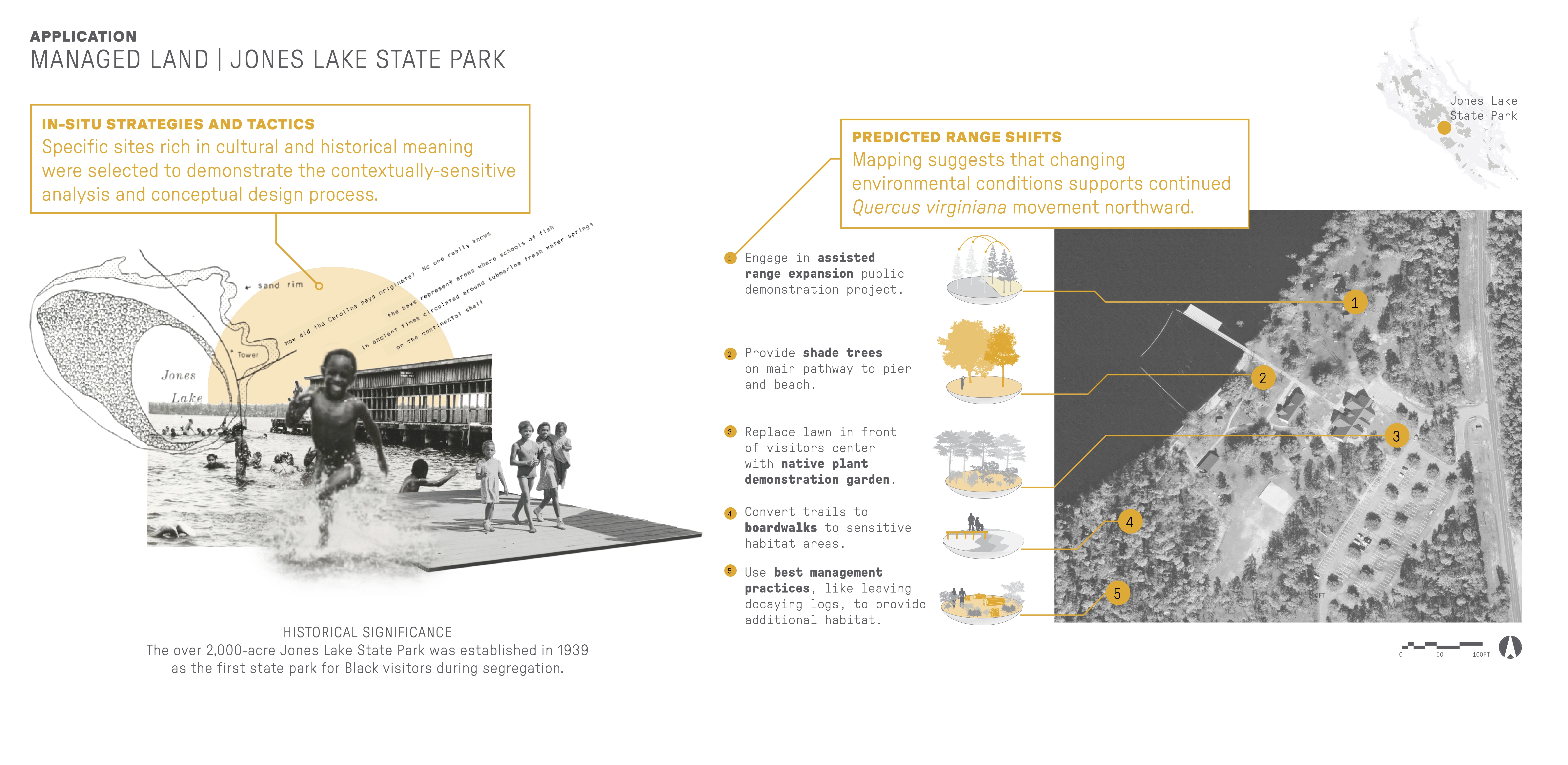 Contextually Sensitive Tactics for Climate Adaptation Projections indicate that the future in this area is hotter and wetter, with more invasives, pests, and wildfires. Research and analysis identified climate-adaptive tactics that fit into two overarching concepts: protecting a large number and variety of species and protecting the ability for species to move and migrate. Strategies that support these concepts are increasing landscape diversity, increasing local connectedness, and decreasing anthropogenic resistance. Forty-five resulting tactics were organized by 12 approaches. These tactics were applied to a range of sites representing five critical land types within the Bladen Lakes area: managed, agricultural, developed, and interstitial land, and priority connection parcels. Site-specific examples illustrate how in-situ design tactics can honor place and program while promoting climate adaptation that combats biodiversity loss.