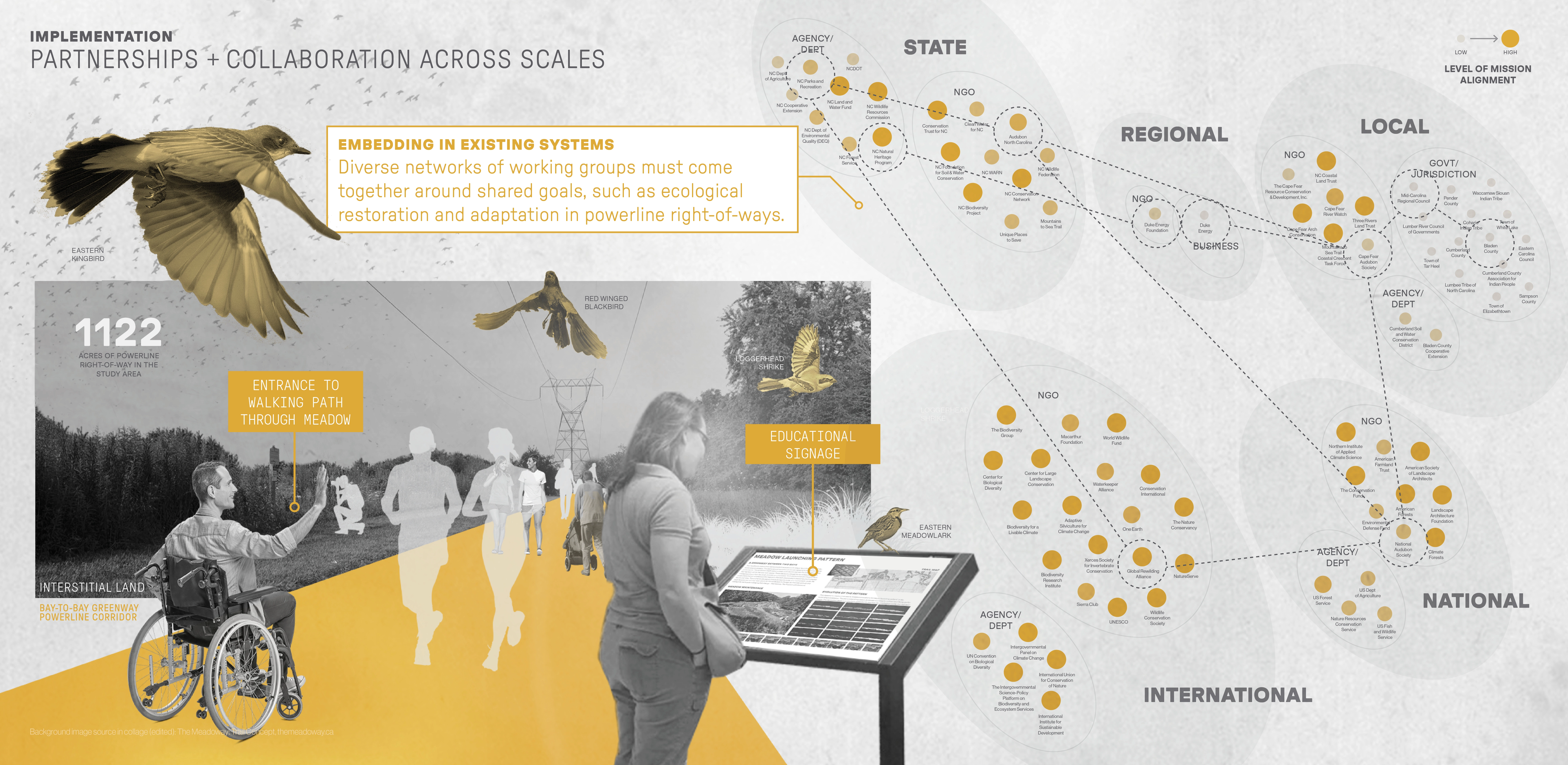 This project addresses biodiversity conservation through corridor design, exploring how the strategic application of design tactics at multiple sites and scales can facilitate climate-related movement as species track their ecological niche. The Nature Conservancy has identified “resilient and connected landscapes” across the US. These priority areas for conservation are linkages that could sustain the diversity of a region under a dynamically changing climate. This project examines the largest of these landscapes in NC’s Coastal Plain, resulting in a scalable framework for analyzing, planning, and designing for climate-related species movement. Applied broadly, this model could reduce the catastrophic effects of biodiversity loss.