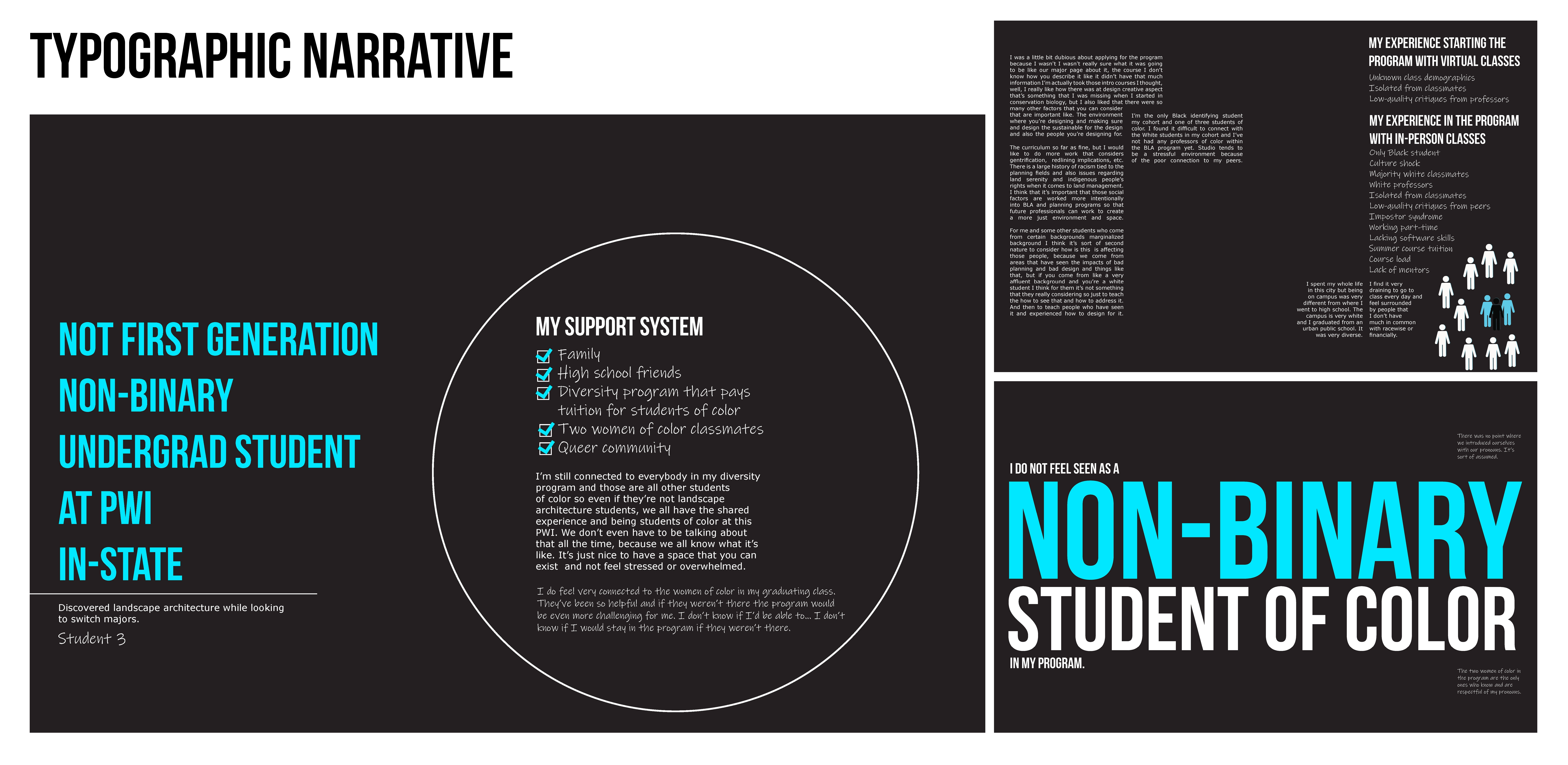 This engaged research revealed that cognitive diversity is prevalent amongst Black landscape architecture students, demonstrating the need for a range of techniques for recruiting and retaining them. The Typographic Narratives reinforce the importance of having both racial and cognitive diversity in peers and faculty. Primary recommendations to equitably diversify the landscape architecture field include cultivating pre-college learning partnerships, reworking landscape architecture curricula to be less white/Eurocentric, and increasing professional development mentorship.