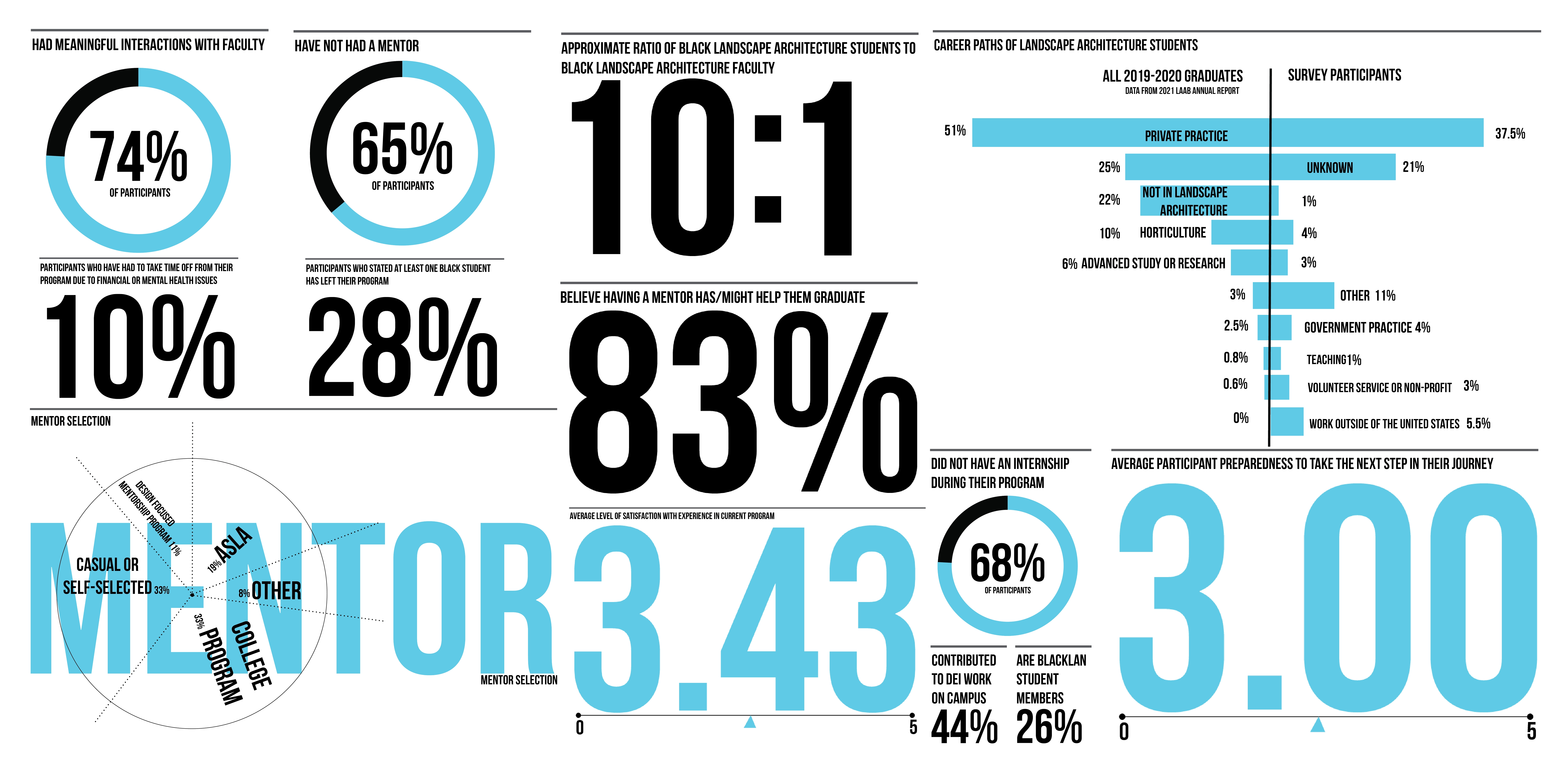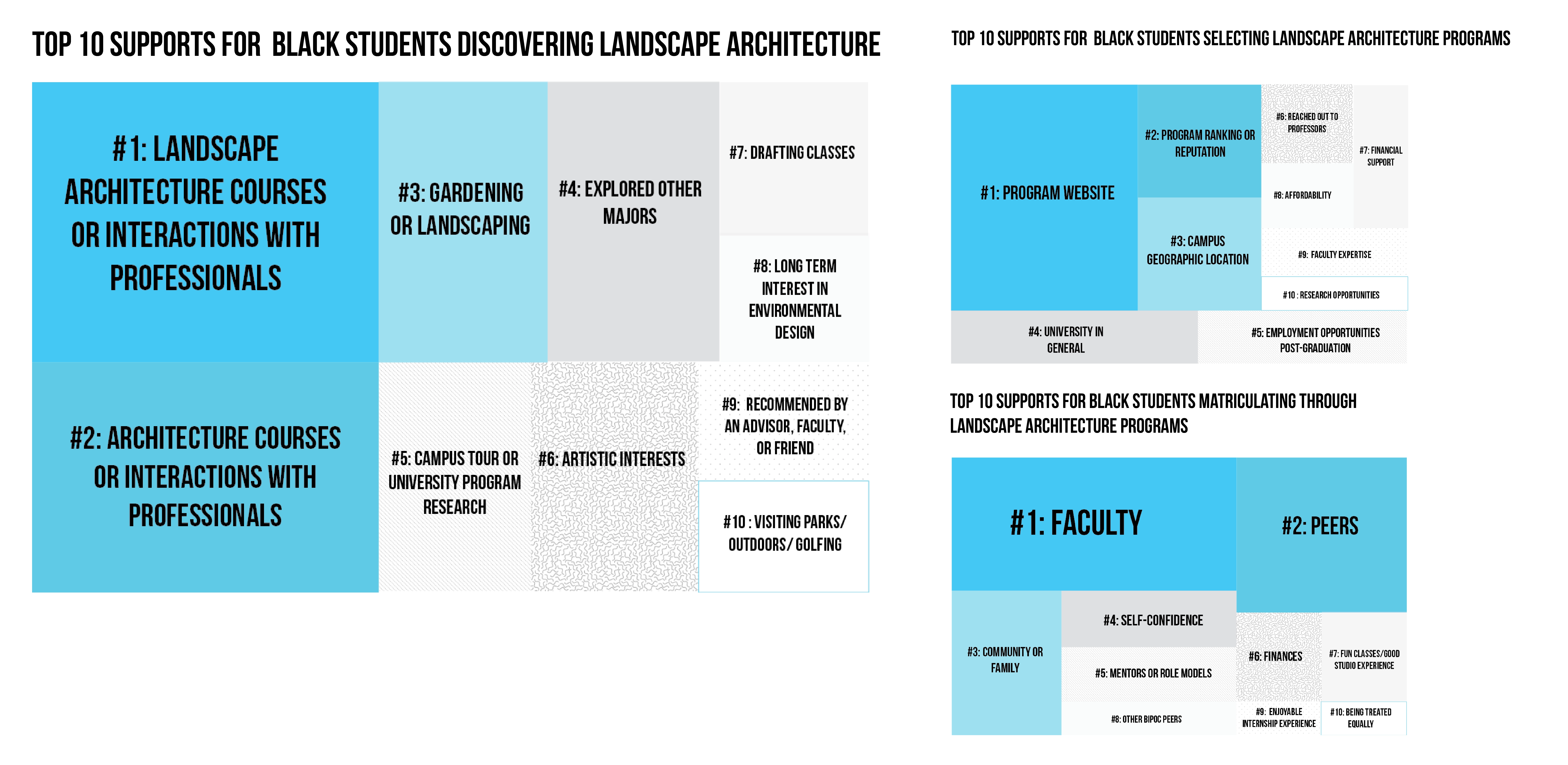 Quantitative and qualitative data from multiple-choice and open-ended survey questions and participant interviews were used to examine Black students’ experiences in discovering, choosing, and navigating their landscape architecture programs. The conceptual framework is informed by Critical Race Theory, narrative inquiry, and case study methods. Survey results were analyzed using descriptive statistics and deductive coding with apriori codes (Saldana 2021). The apriori codes were determined from an indepth literature review. The survey results are illustrated in infographics detailing students’ backgrounds, experiences, and recommendations to the landscape architecture field. Key points in the interviewees’ stories related to the discovery, recruitment, and retention portions of their design journey were identified and retold anonymously through counternarrative visualizations, dubbed “Typographic Narratives” by the researcher.