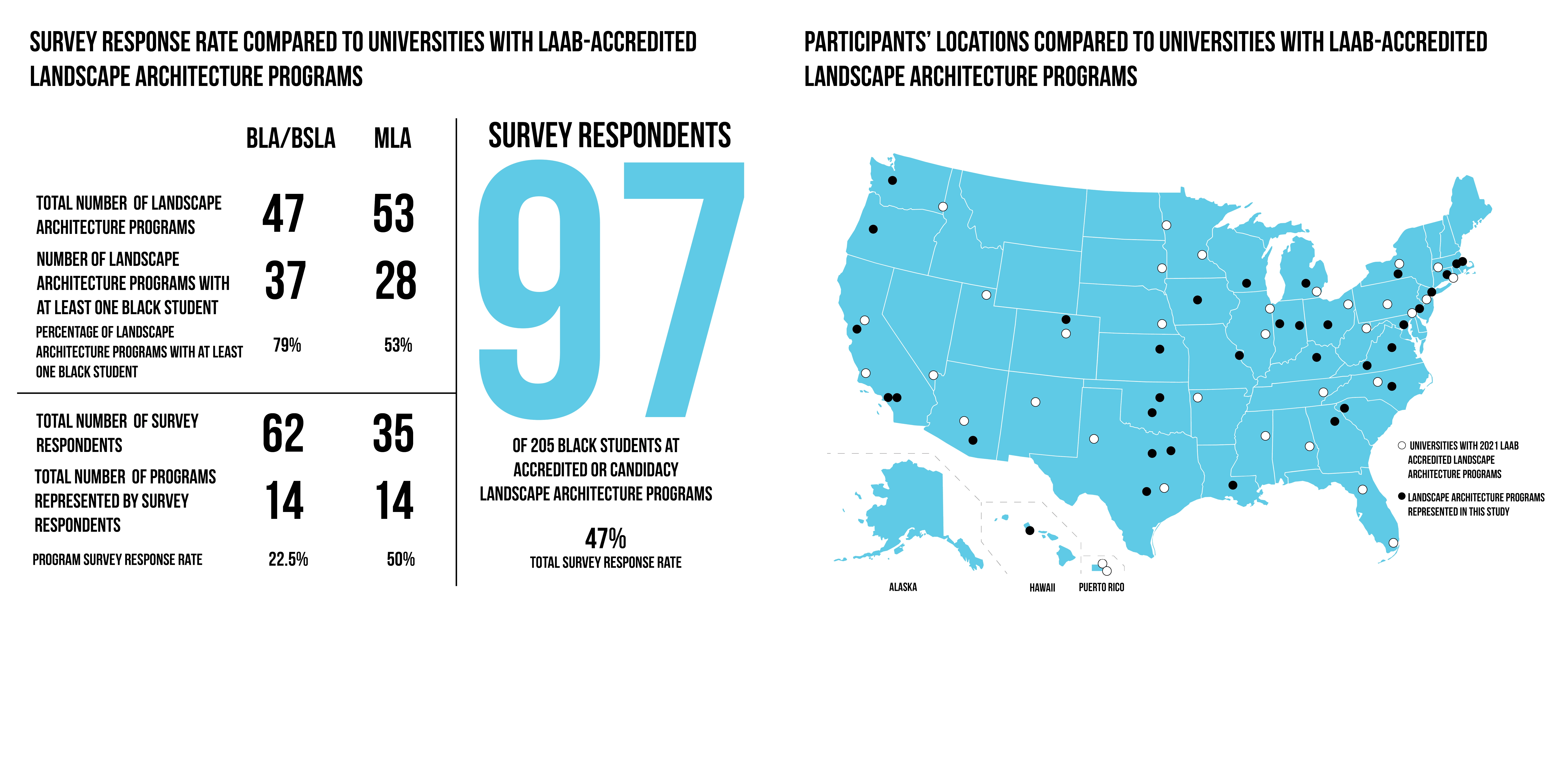 This study surveyed 97 students enrolled in 28 LAAB-accredited programs across the United States in the 2020-2021 academic year who identify as Black or African American. Eight survey respondents were selected for indepth interviews. The selection process was guided by proportional representation of undergraduate and graduate programs with reservation of two participant spots for students from historically black colleges and universities to ensure their stories are shared in this study.