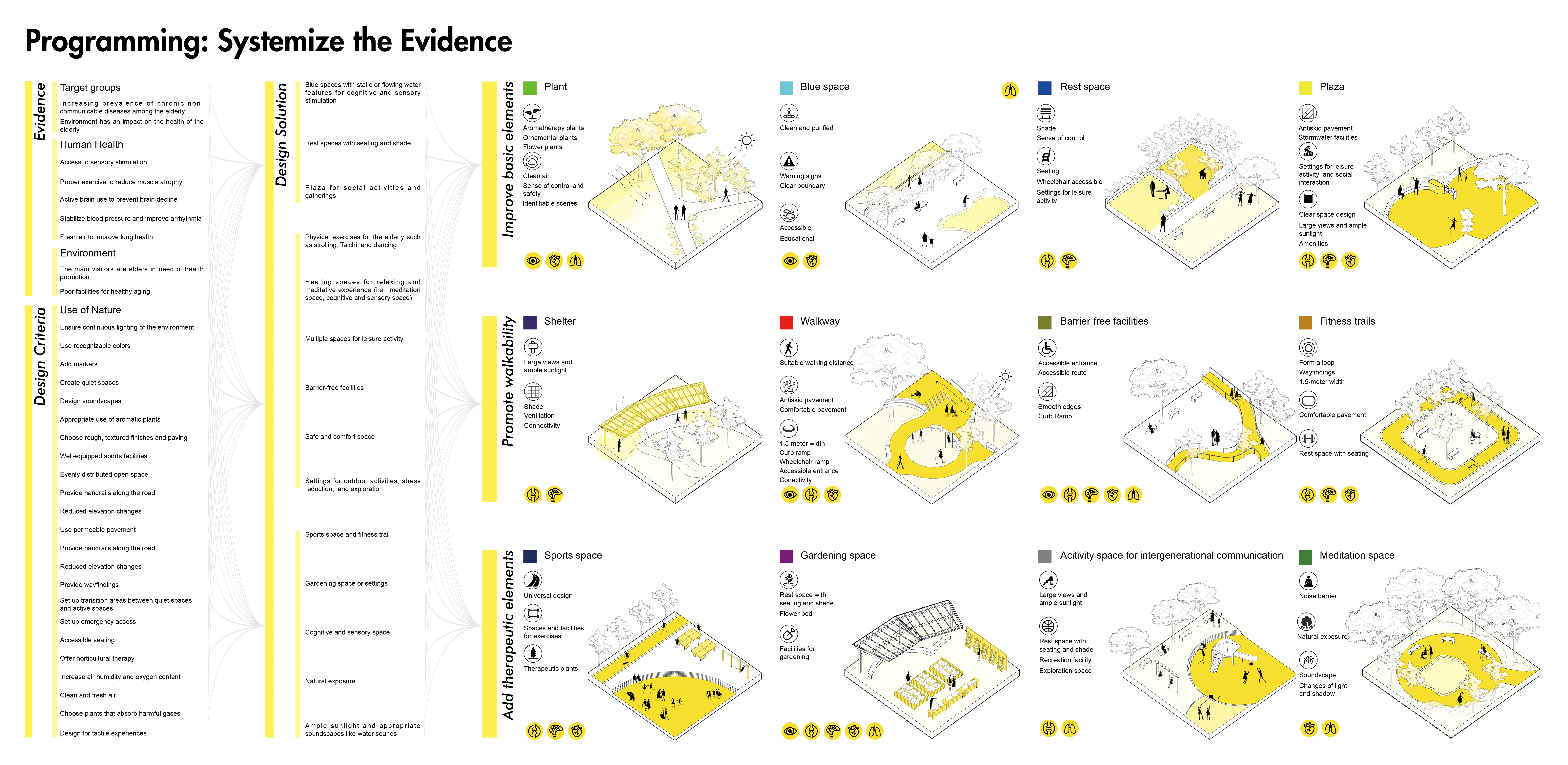 2) Programming. Designers systemize the evidence according to the aims of healthy aging design. Based on the evidence and design criteria, we propose a series of detailed strategies for healthy aging design.