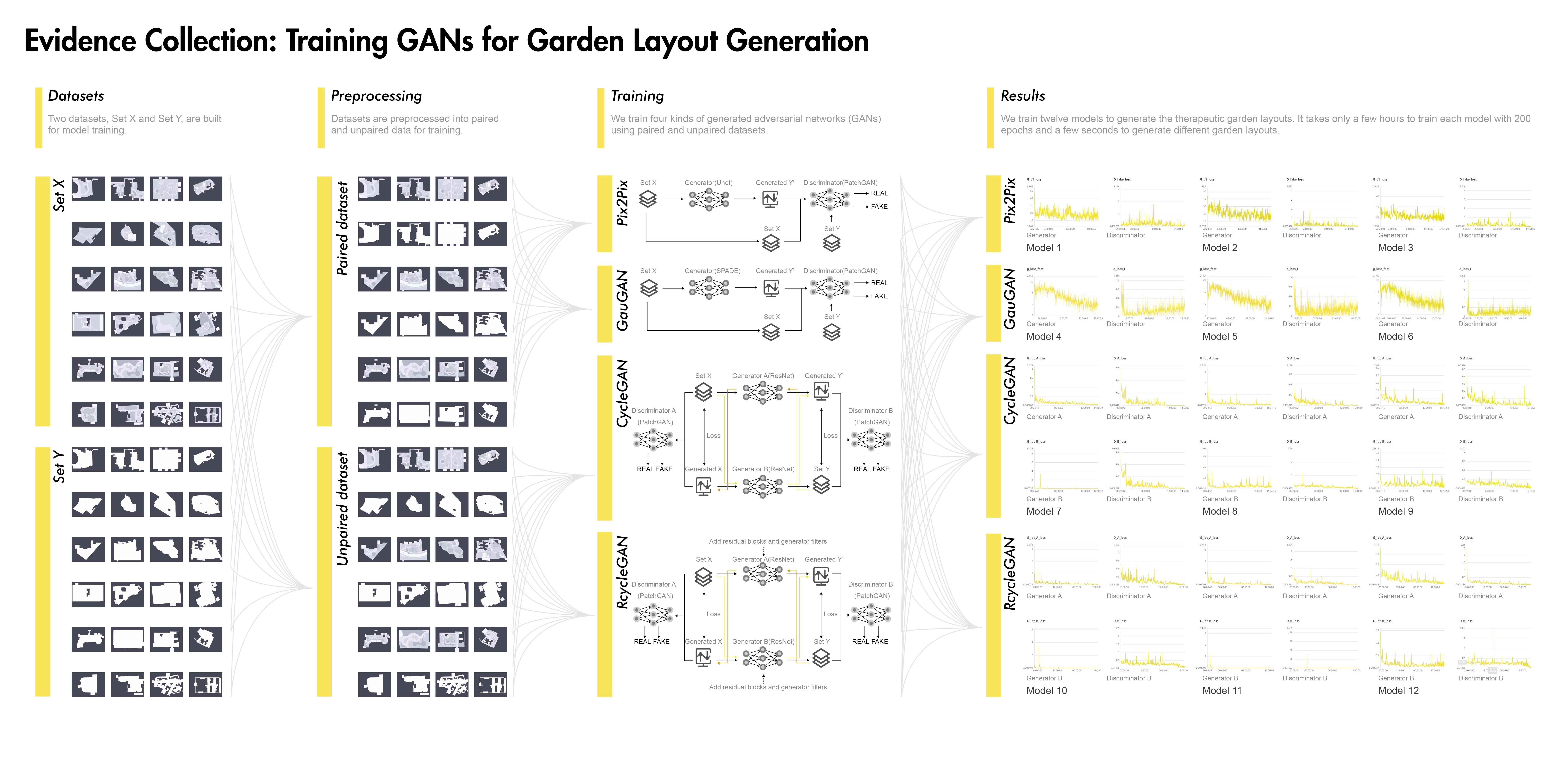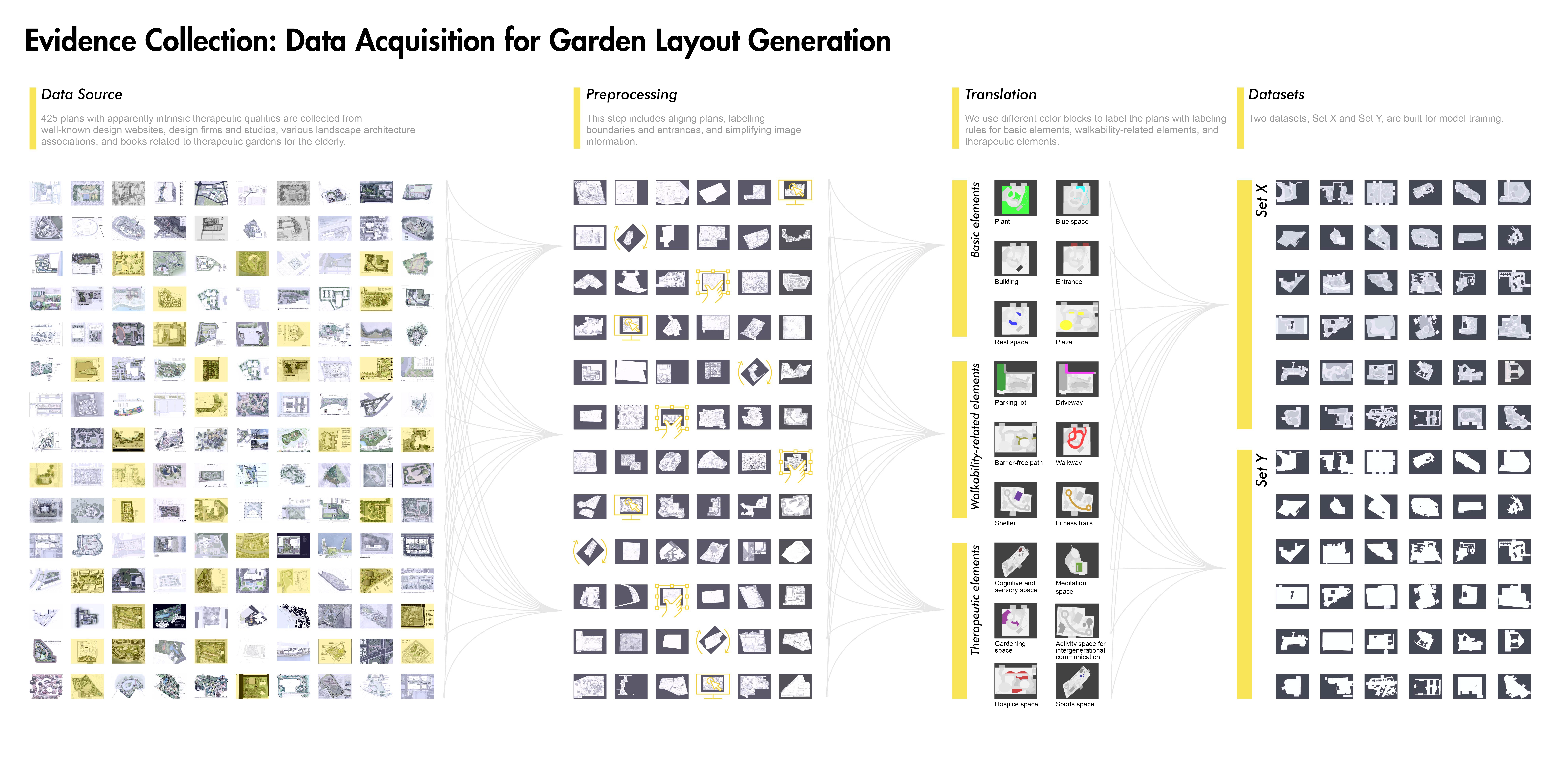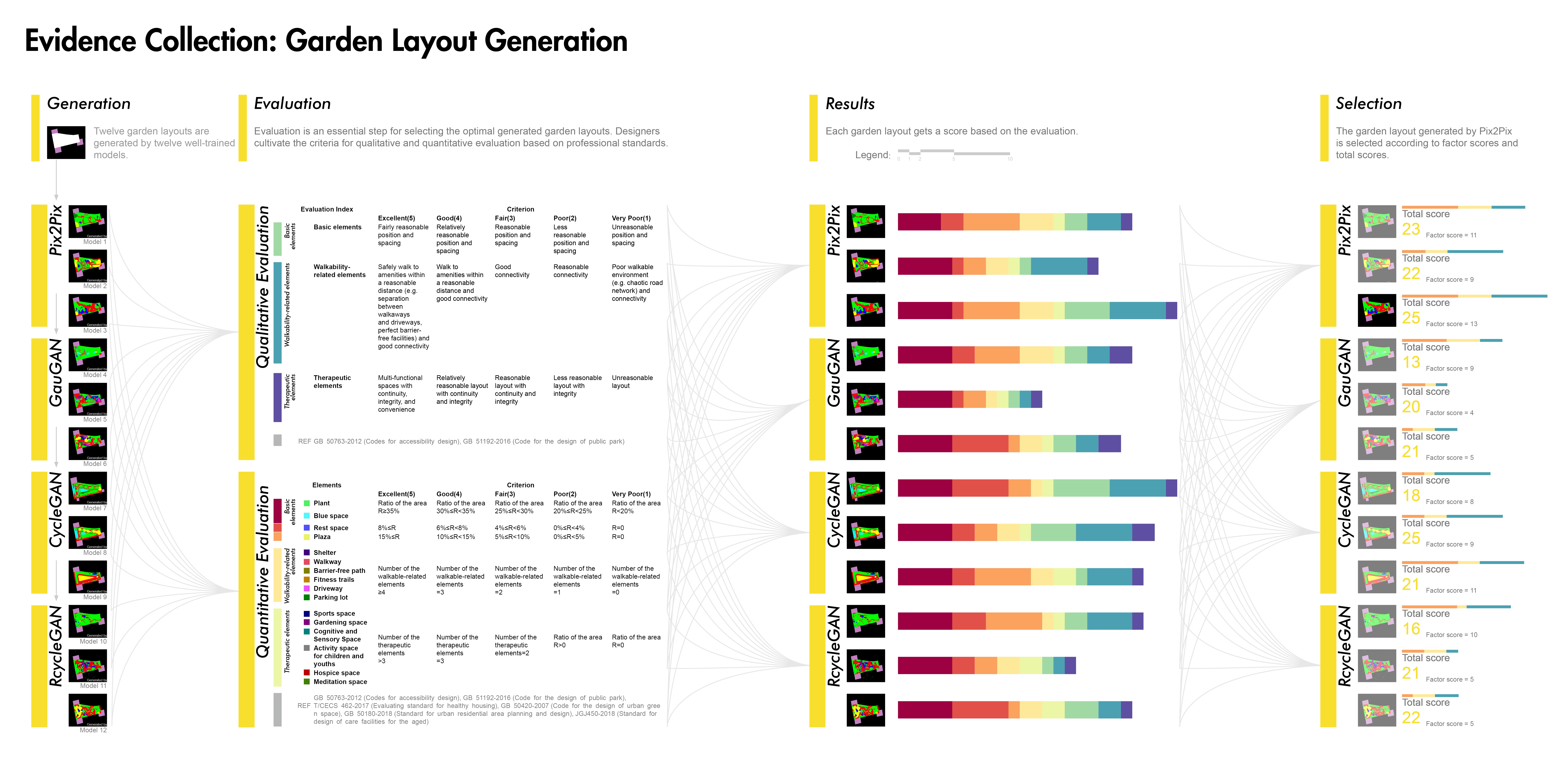 1) Evidence Collection related to healthy aging design with the involvement of artificial intelligence techniques including target group analysis, study area, data acquisition, training neural networks based on GANs, and garden layout generation. To train models generating healthy aging design, two therapeutic garden datasets were built for model training, and then 12 trained GANs models were used to generate garden layouts. To select the best-generated layout, 12 garden layouts are assessed qualitatively and quantitatively by age-friendly environmental criteria.