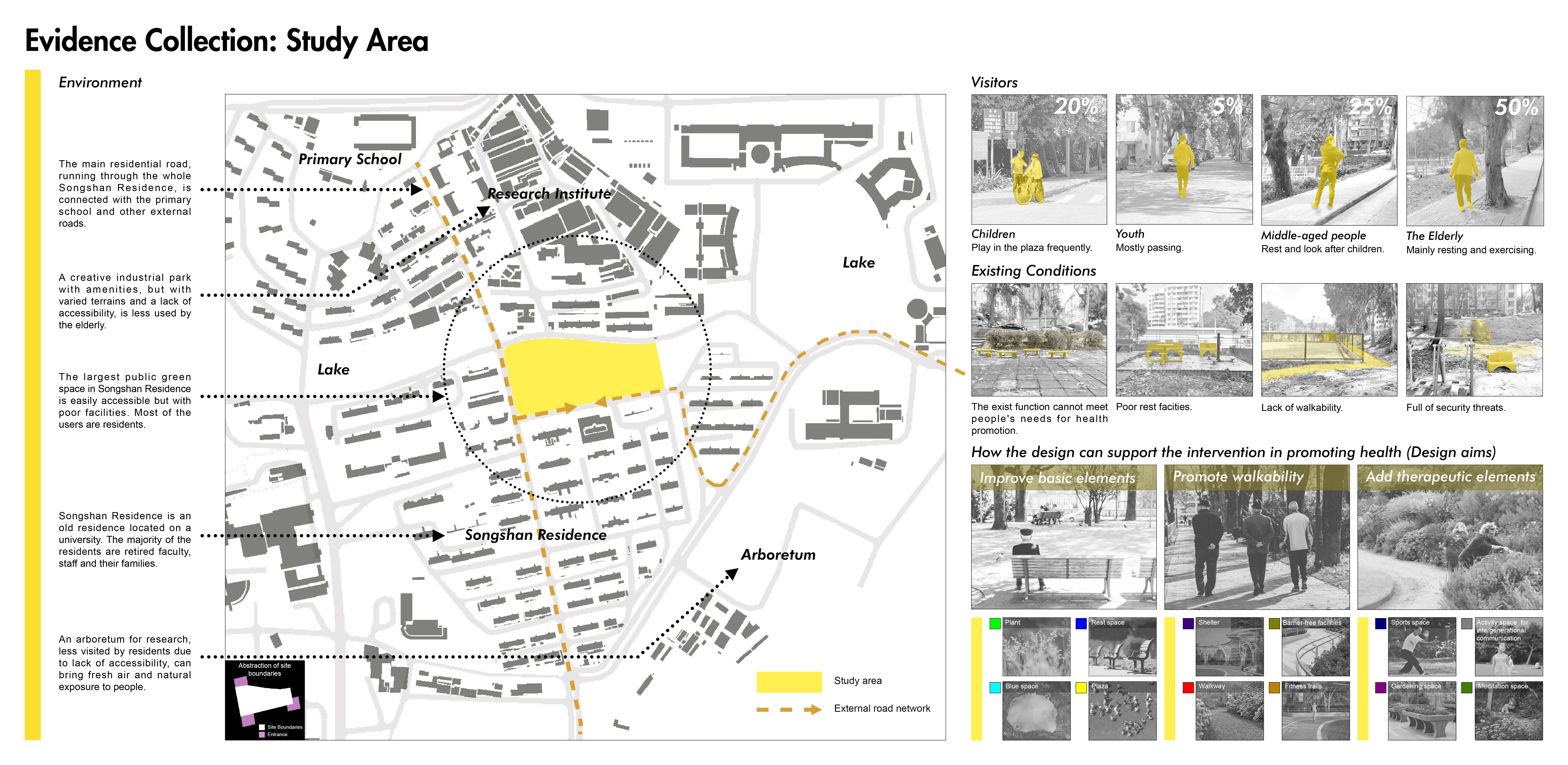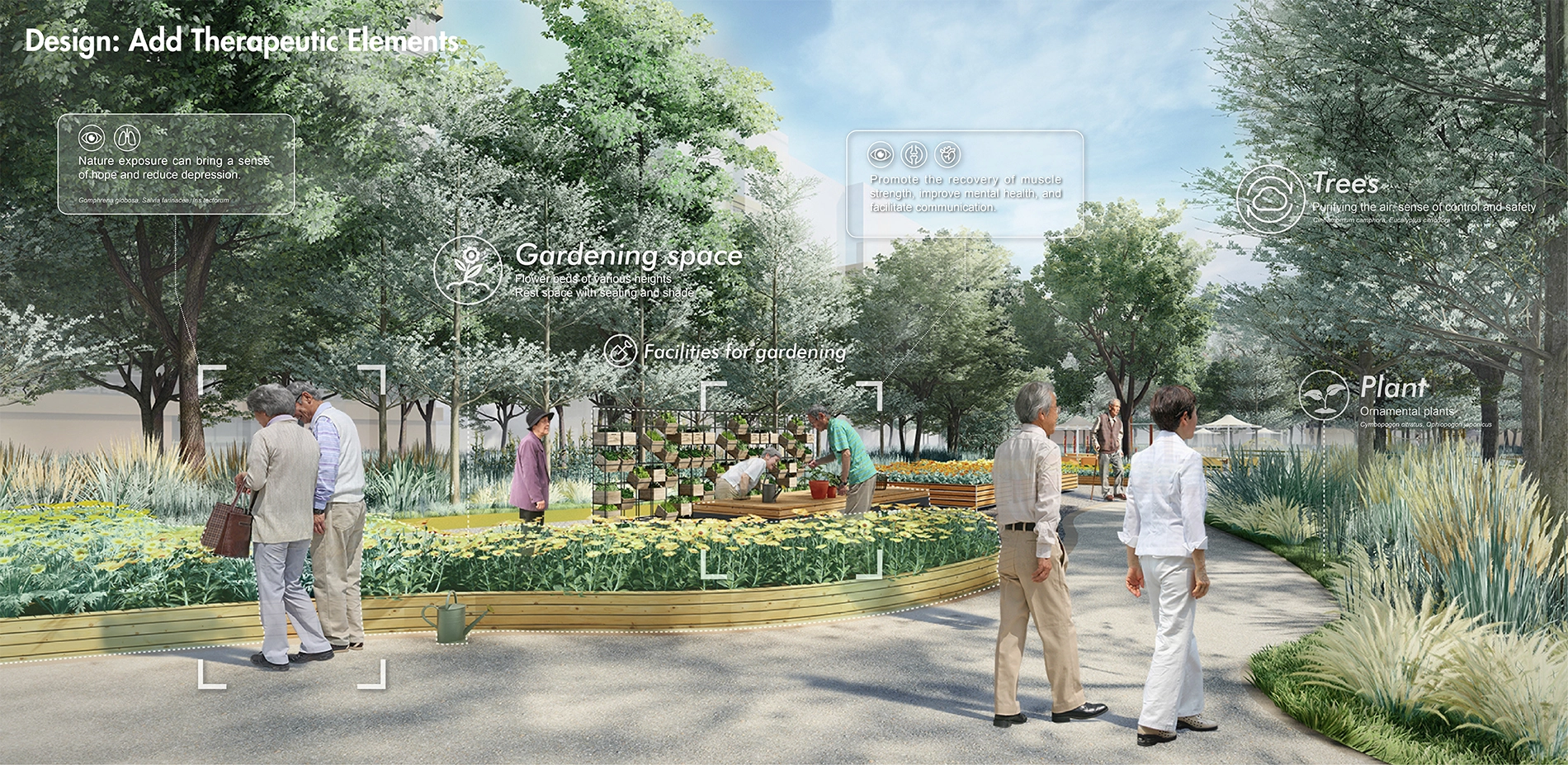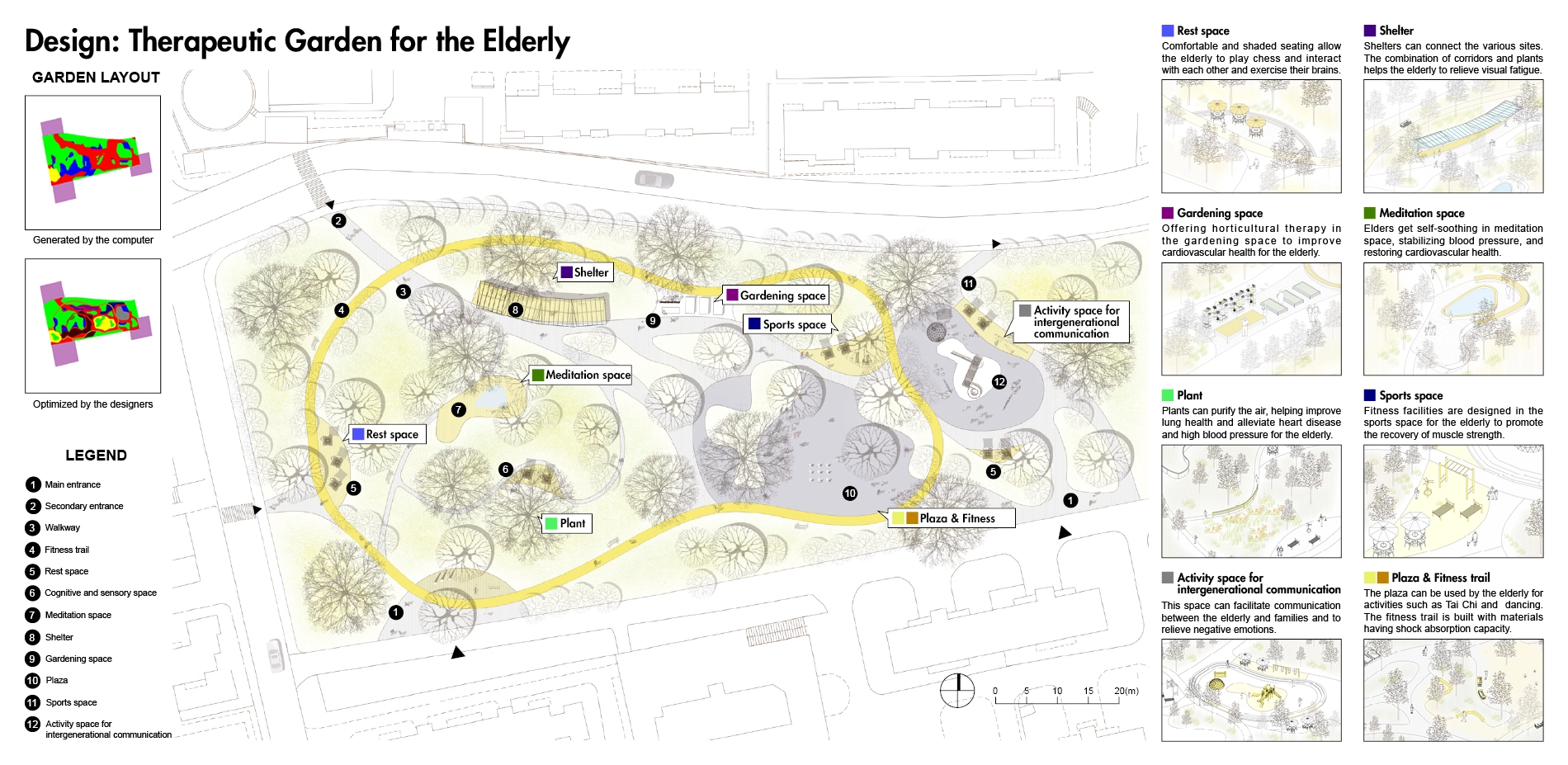 3) Design a Therapeutic Garden for the Elderly. We use the strategies to design and optimize the generated garden layout including basic garden function, walkability-related facilities, and therapeutic opportunities.