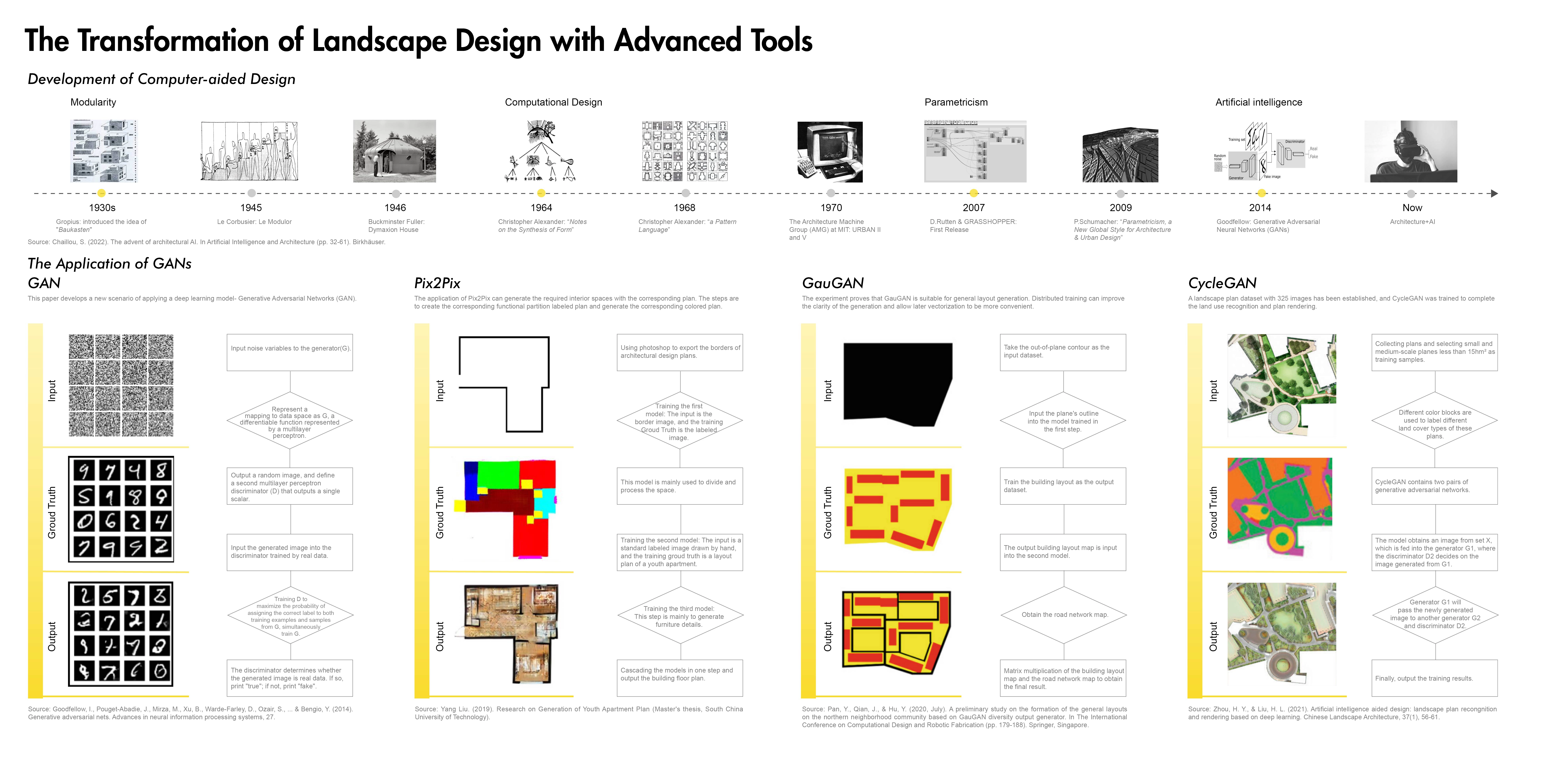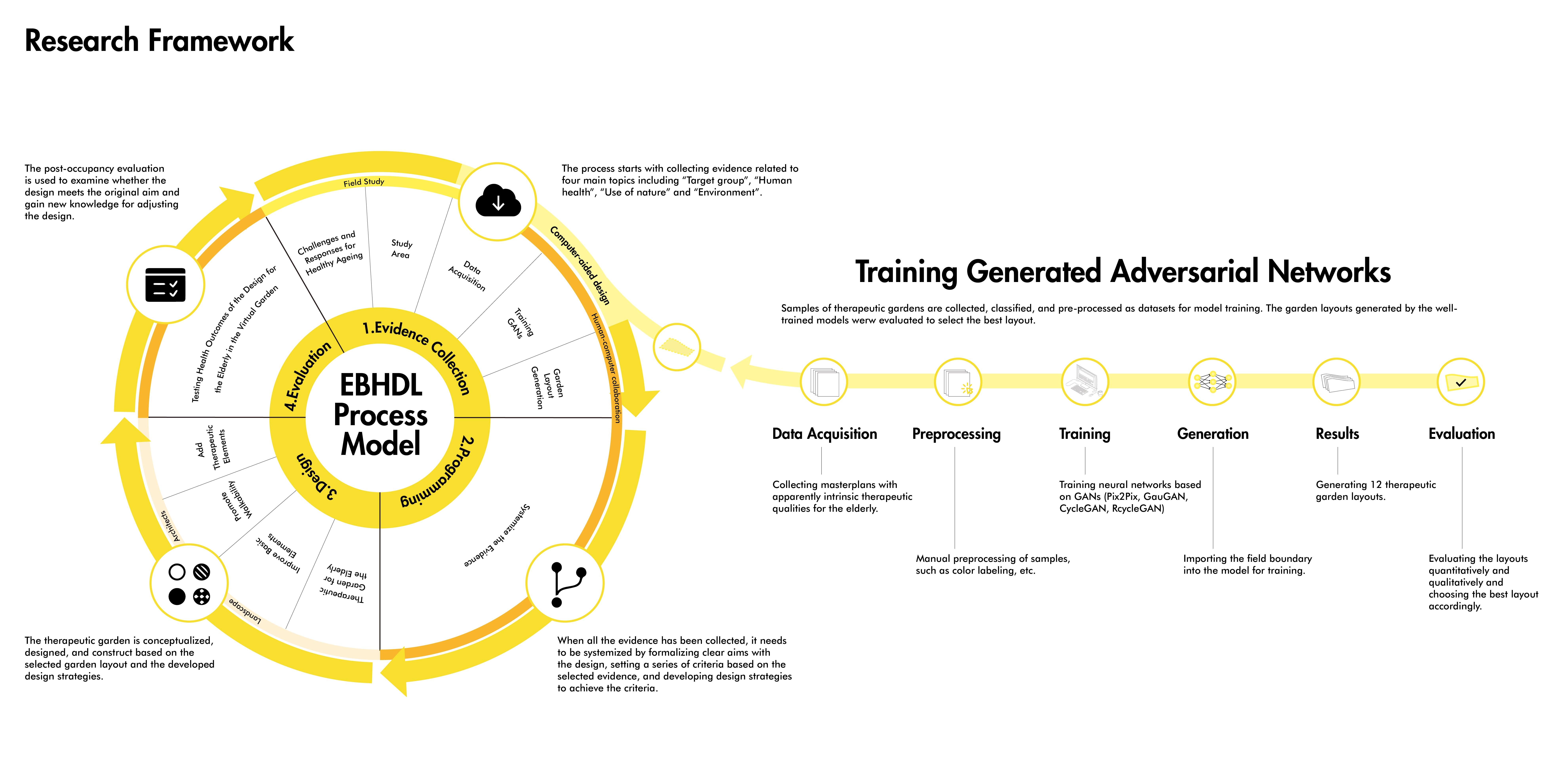 China’s population is aging dramatically, and health issue in old age has become a vital social concern. Providing green spaces, especially therapeutic gardens, is an effective measure to promote various dimensions of health for the elderly by encouraging physical activity, relieving mental fatigue, and facilitating social interaction (Taheri et al., 2021). The Evidence-based Health Design in Landscape Architecture (EBHDL) process model is often considered a scientifically valid approach to deliver on stated health outcomes of therapeutic or healing places (Stigsdotter & Sidenius, 2020). The model provides the basis for design decisions through scientific methods, making the design more rigorous, rational, and scientific. However, the process is a spiral that is time-consuming, labor-intensive, and costly. The growth of artificial intelligence is possible to improve the EBHDL process to create a dynamic and scientific method for therapeutic garden design. Especially the Generative Adversarial Networks (GANs), in which ideas of programming and mass can provide more inspiration for designers and evaluate design conveniently and efficiently.