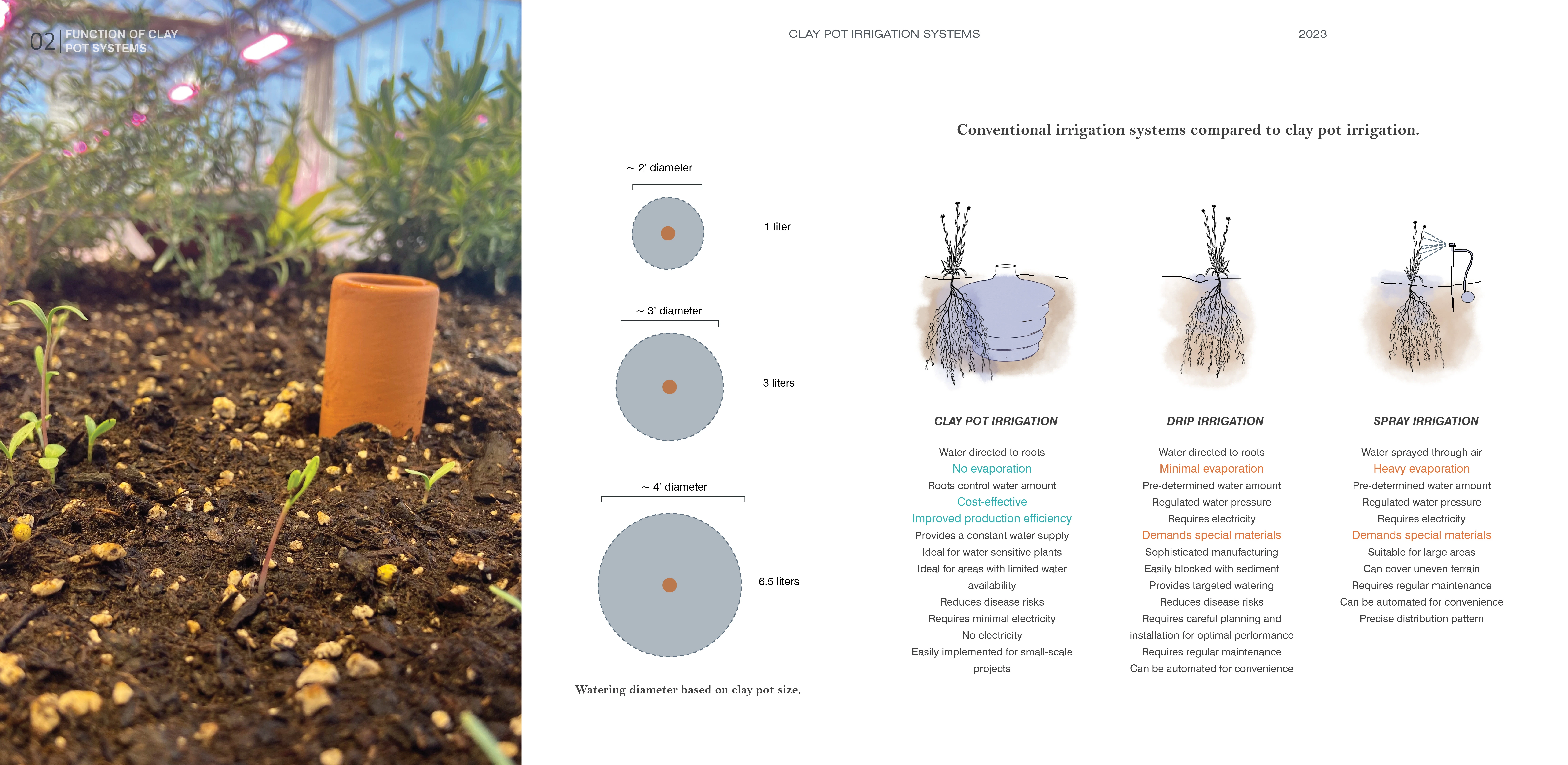 Climate change will alter growing conditions, necessitating adaptive irrigation practices. Landscape architects, trained in systems thinking, ecological planning, and water conservation knowledge, must urgently respond to landscapes facing water scarcity. To address future droughts, efficient irrigation systems, like buried clay pots, can be used and could enhance landscape design. These self-regulating irrigation systems are particularly efficient because the water flow rate varies with plant water demand. Plant survival and growth are dramatically increased with these systems, allowing for more robust plants that better tolerate drought.
