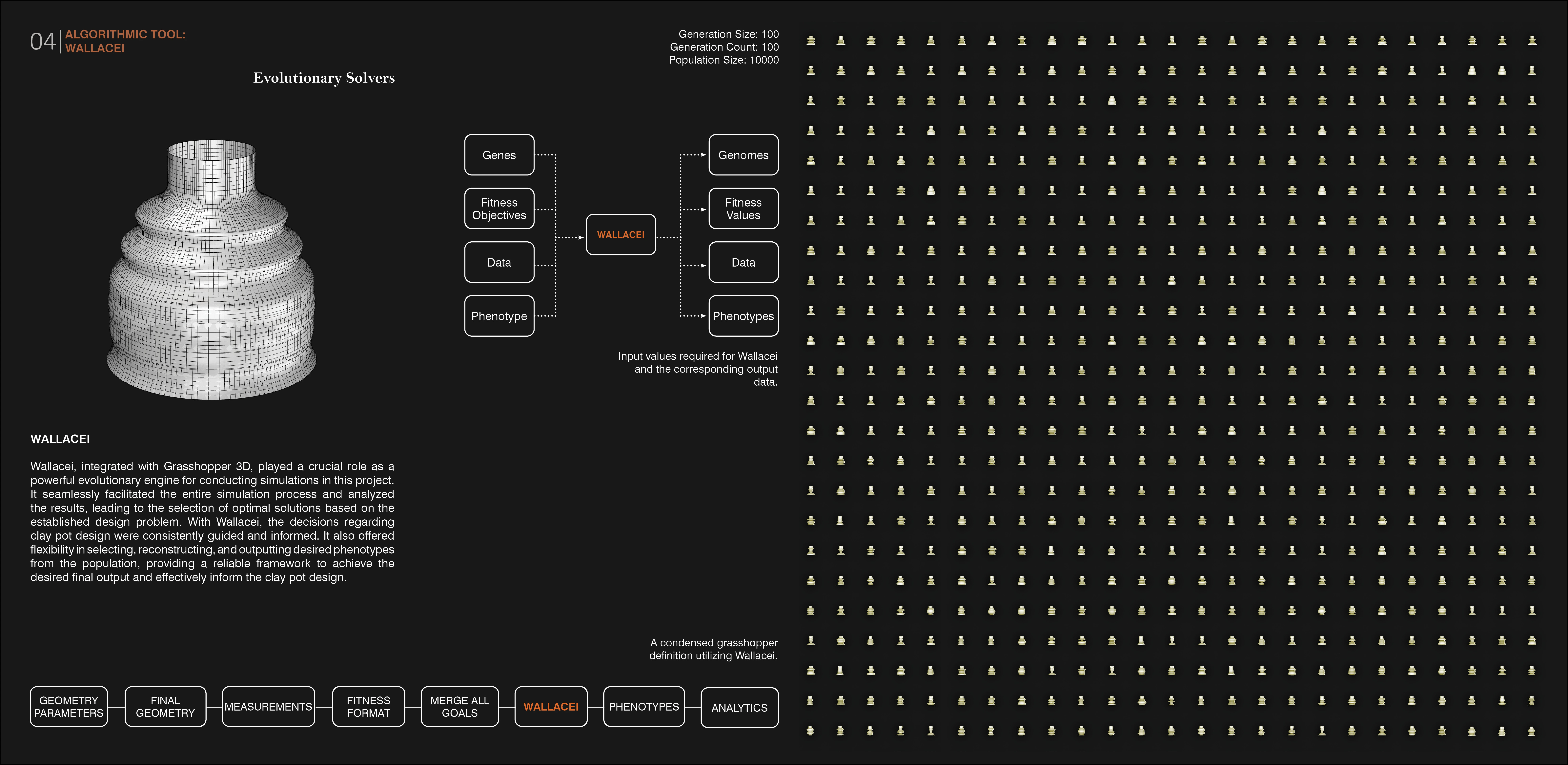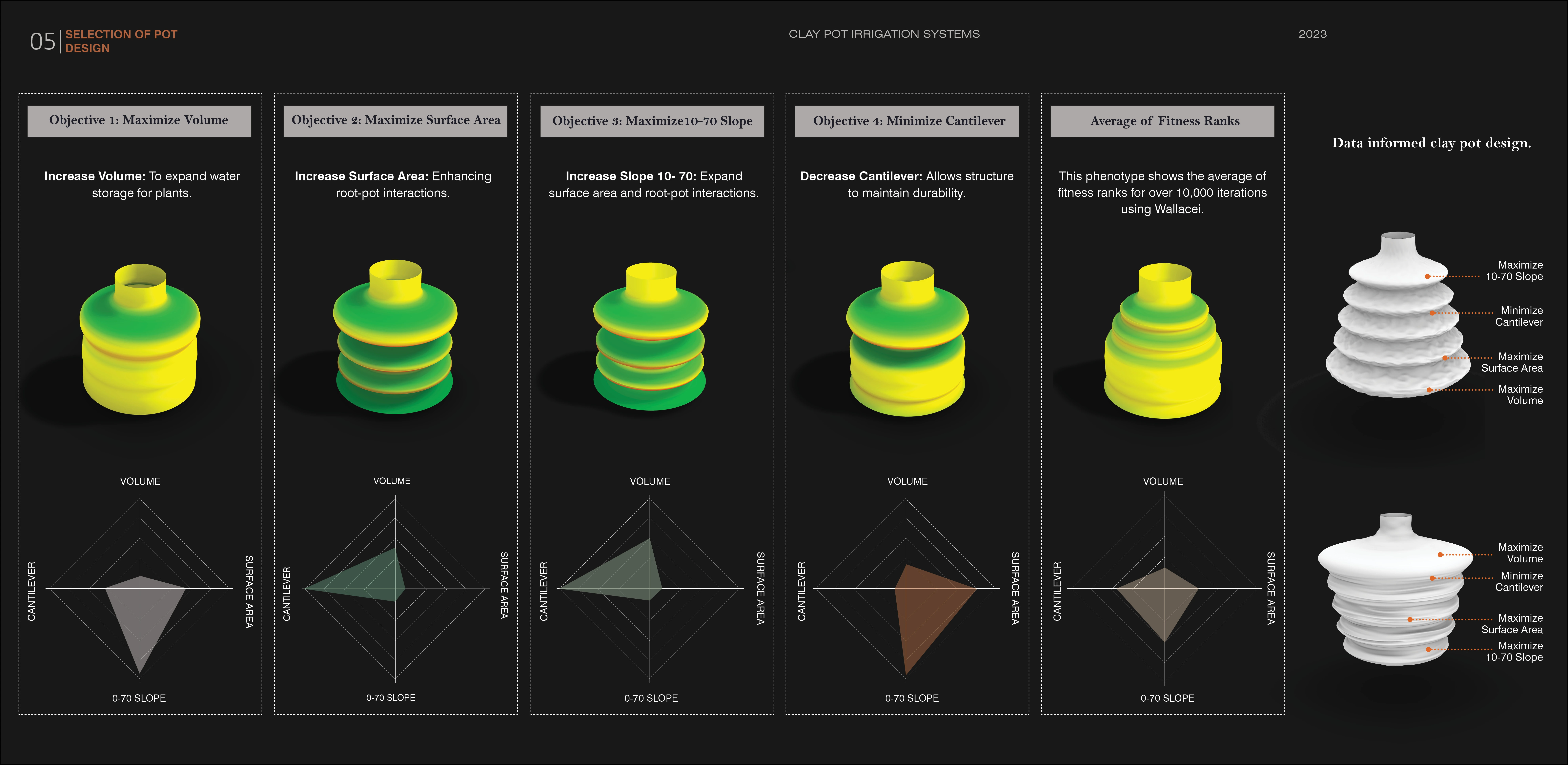 Employing an evolutionary solver, Wallacei, this project utilized data analysis to select desired solutions for the final pot design. This approach prioritized repetitions tailored to plant water demands, increased surface area for root interactions, and enhanced pot durability. By considering multiple objectives and constraints, the algorithmic tool identified more suitable combinations of form and size parameters. Ultimately, two pot designs were selected for testing in a greenhouse experiment, where they were compared to a conventional pot form. Although the pots contained equal volumes of water, their surface areas varied.