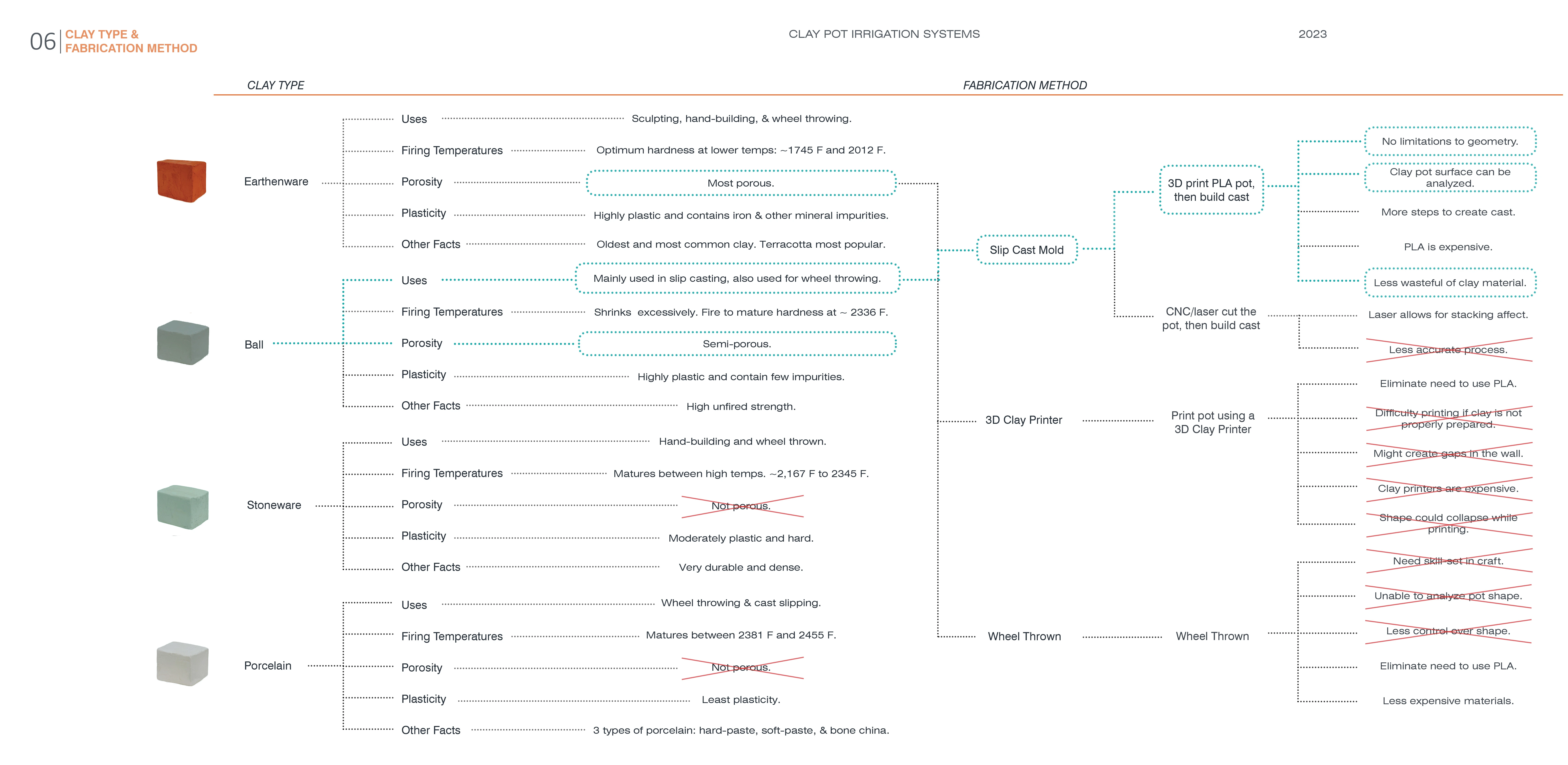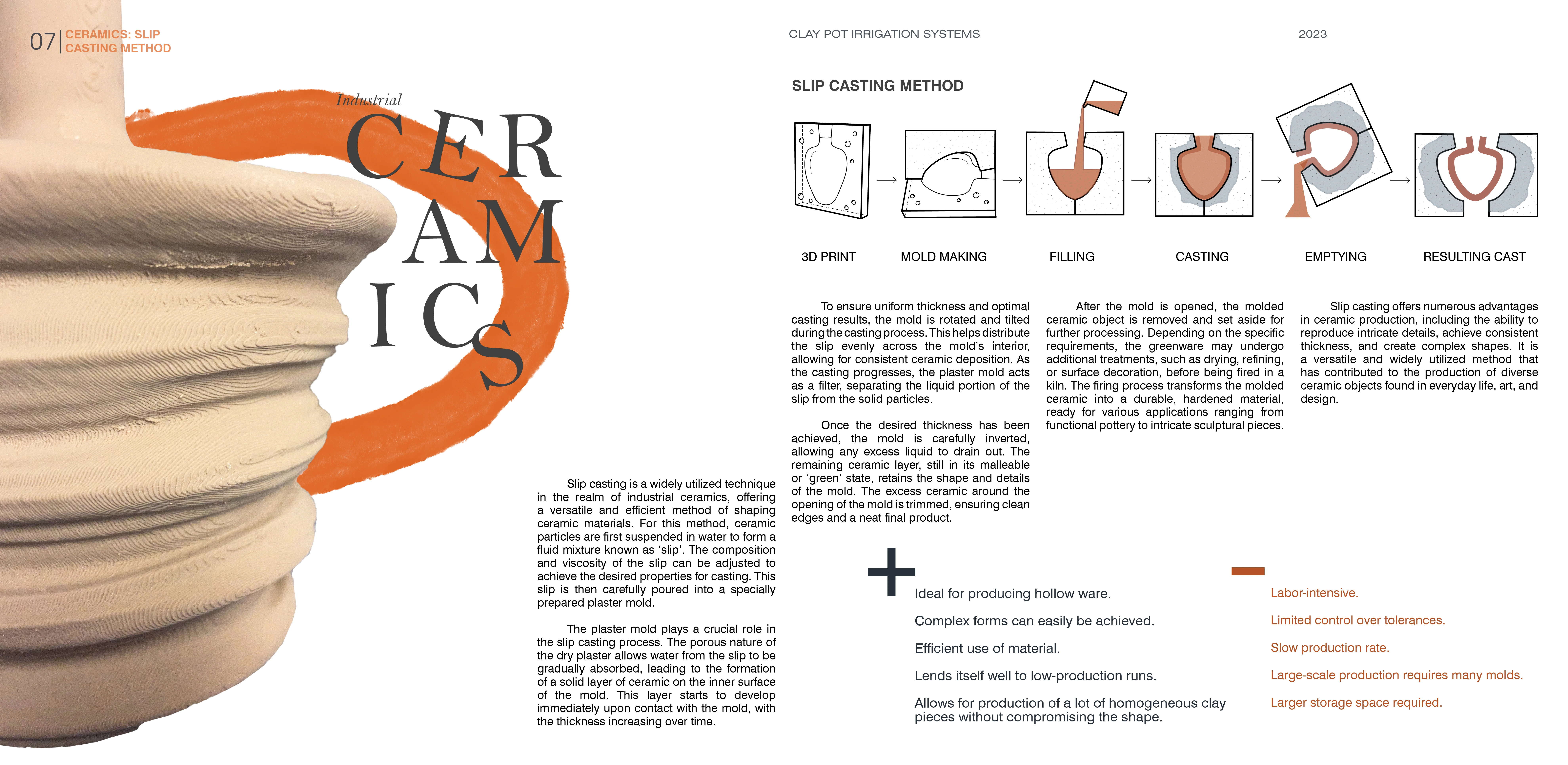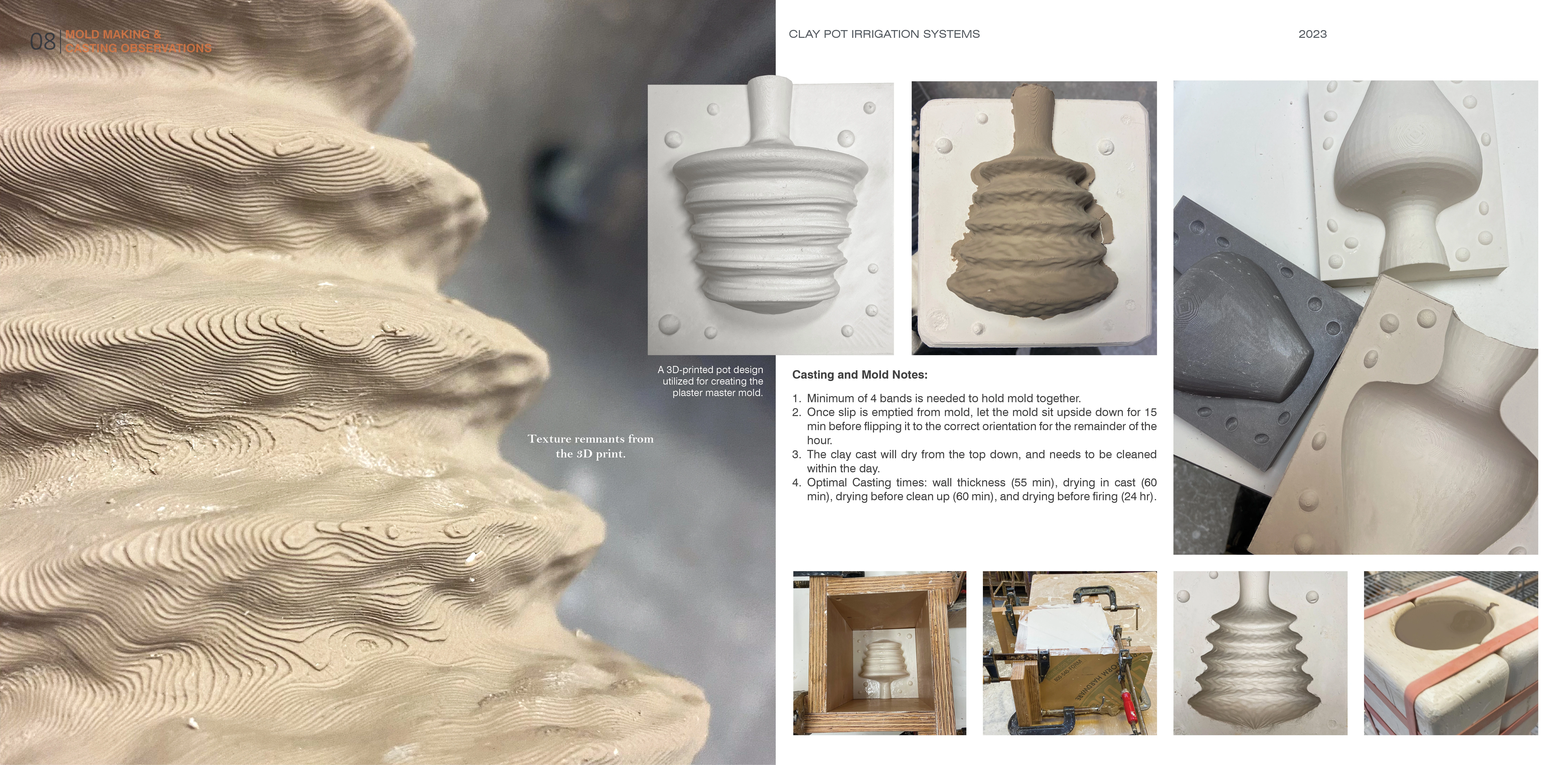 This project aimed to establish an iterative design approach using digital technologies, like 3D printing, to enhance irrigation performance, reduce water usage, and improve land management through the design of ceramic clay pots. While clay pots could be purchased, 3D printers provided opportunities for exploring pot design and efficiency. Multiple casts of homogenous pots were made using 3D-printed PLA master molds, ensuring greater accuracy and reproducibility. The slip casting technique enabled the creation of complex shapes not achievable with conventional methods.