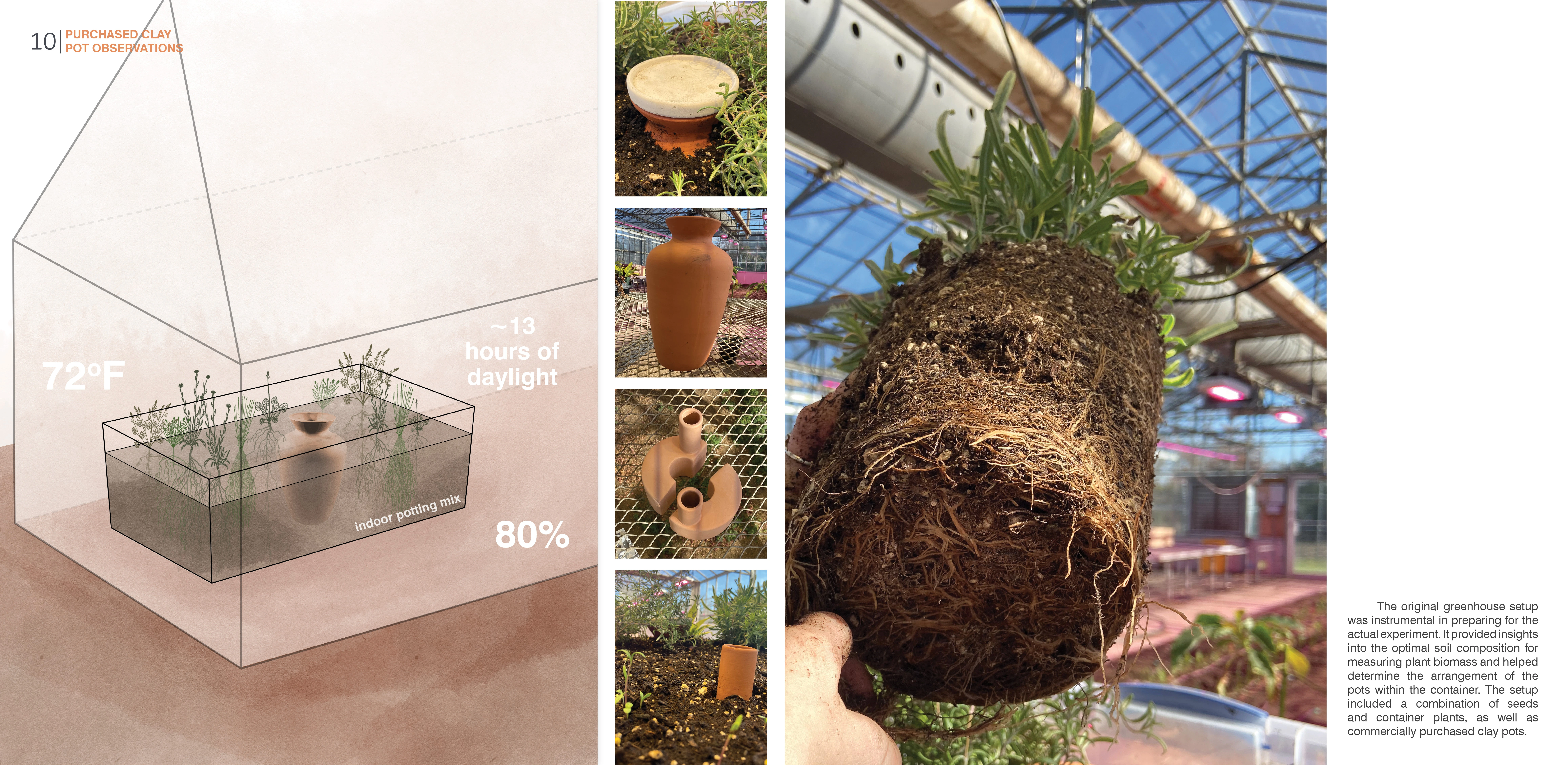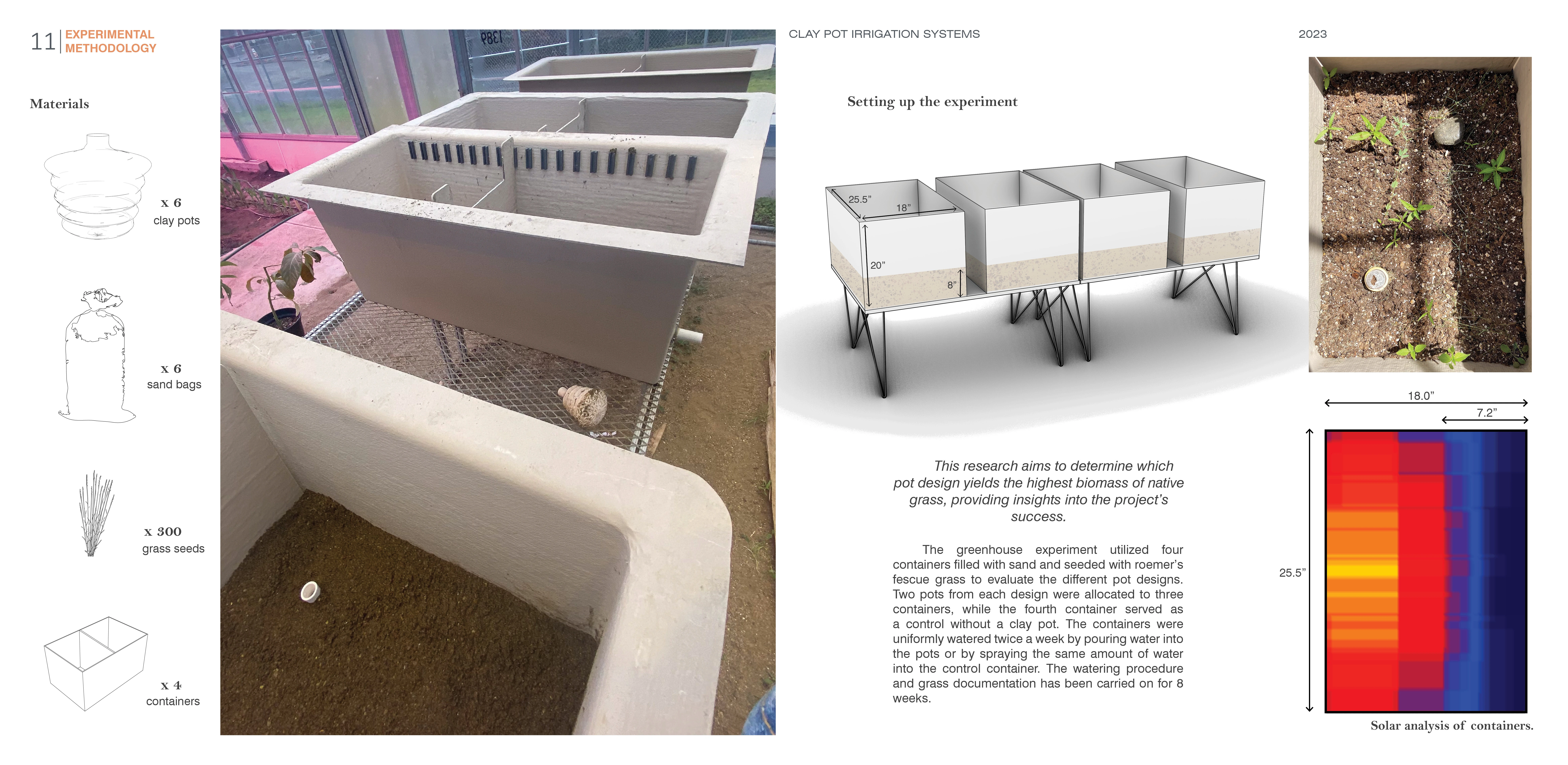 The greenhouse experiment utilized four containers filled with sand and seeded with roemer's fescue grass to evaluate the different pot designs. Two pots from each design were allocated to three containers, while the fourth container served as a control without a clay pot. The containers were uniformly watered by pouring water into the pots or by spraying the same amount of water into the control container. This research aims to determine which pot design yields the highest biomass of native grass, providing insights into the project's success. While the research results are still pending, the collected information will inform the application of new tools to a vernacular technology. However, initial observations indicate a higher grass density within a 10-inch radius of the clay pots, suggesting potentially lower porosity than expected. Secondly, solar exposure significantly impacts the grass's growing conditions throughout the day. Future studies should aim for consistent solar exposure to optimize growing conditions and conduct further sampling for a more comprehensive analysis.