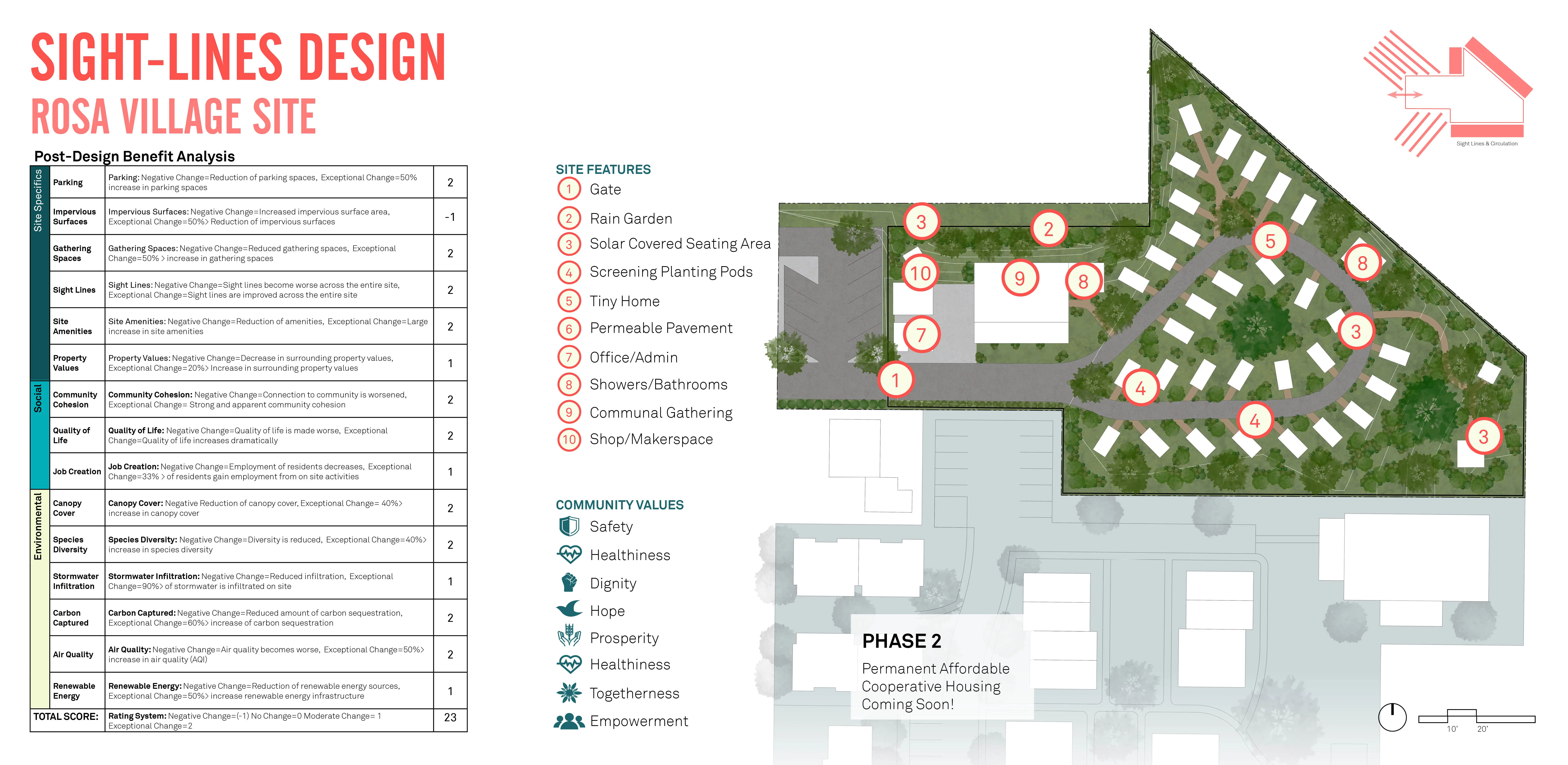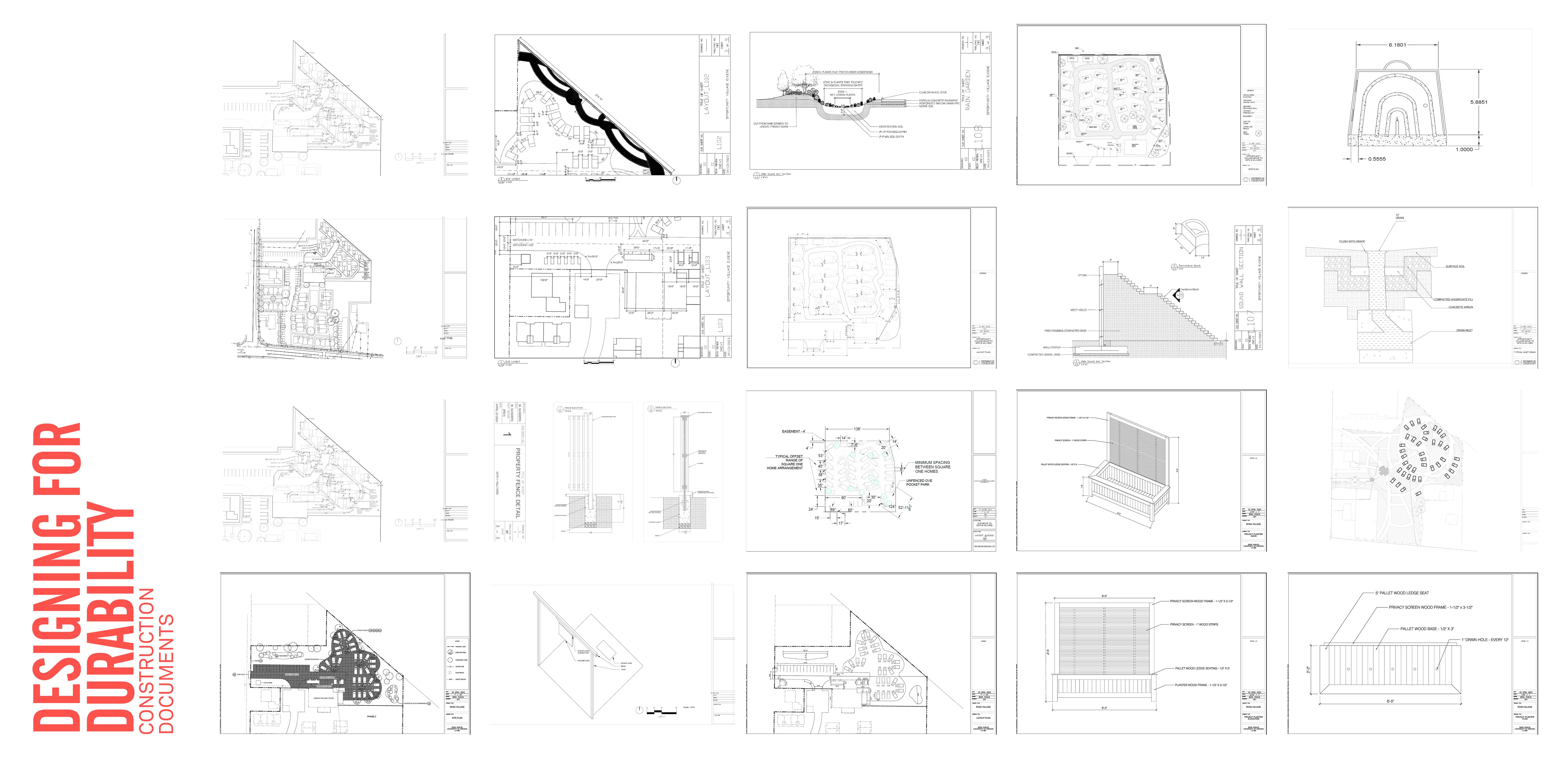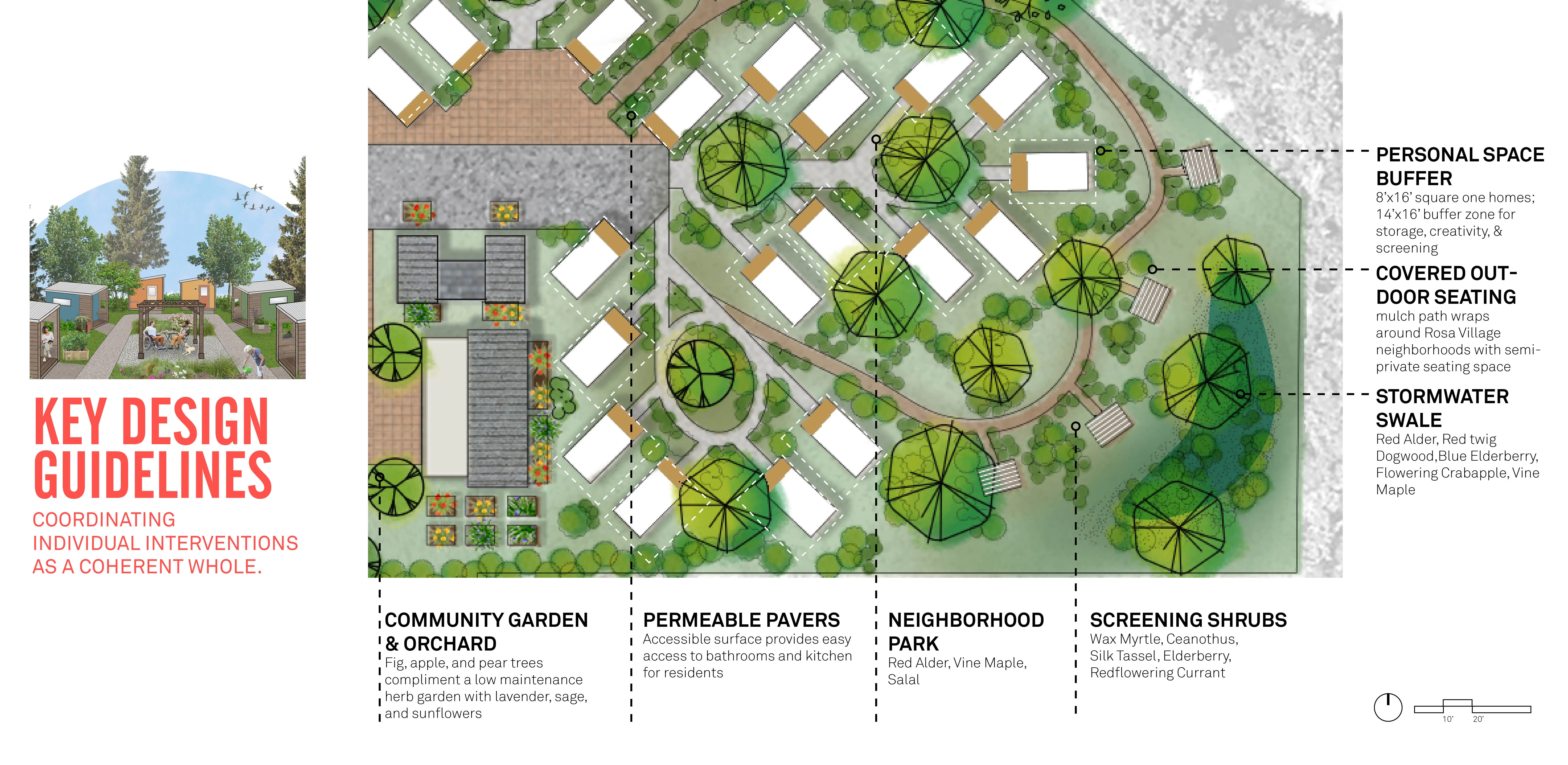 The design phase combined our education, community co-design, and the practicalities of the situation. We visited other tiny home / otherwise houseless communities. We met with the designers of pallet shelters and community supported shelters. We met with local leaders and village coordinators. We got advice from Jared McKnight (2021 ASLA Student Award Winner). We learned that providing as many beds as possible, as quickly as possible, was critical. So, we created site plans that maintain 30 dwelling units per acre - while also providing villagers with needed privacy. Because city designers usually only have a few days for each design – we create multiple site plans and typologies for planting, housing, open space, lighting, and security. Knowing that transient communities are usually placed on sites with high climate change risk, we drew up designs for stormwater capture, heat mitigation, and soil remediation. To reinforce the value of landscape - we clearly listed the multitude of design benefits (aesthetics, economic, cultural, ecological, physically, and mentally). Finally, we developed construction documents. Our sets are currently being reviewed by a panel of people (including registered landscape architects, architects, villagers, and City officials). We are looking forward to seeing our designs be built this Fall.