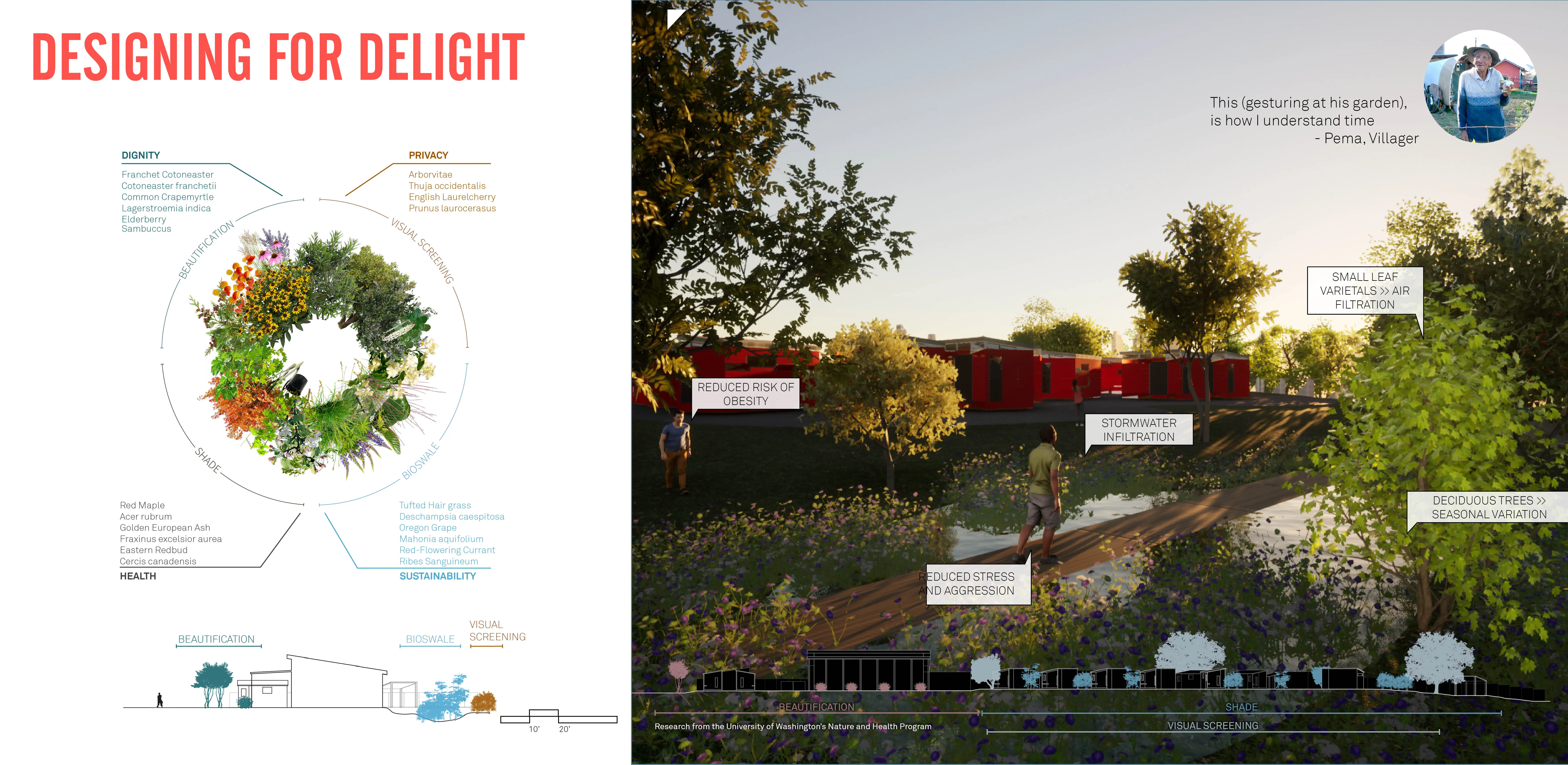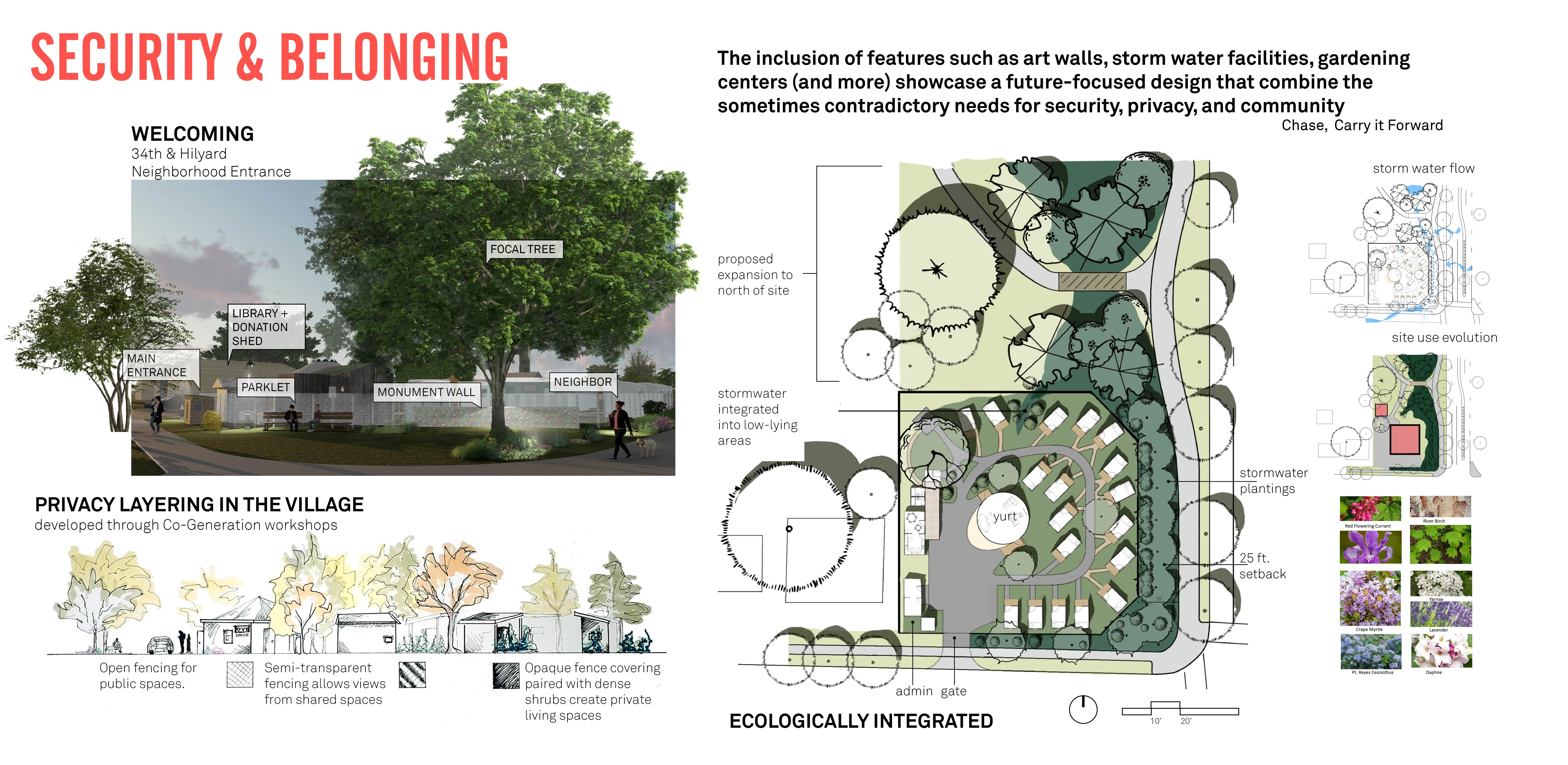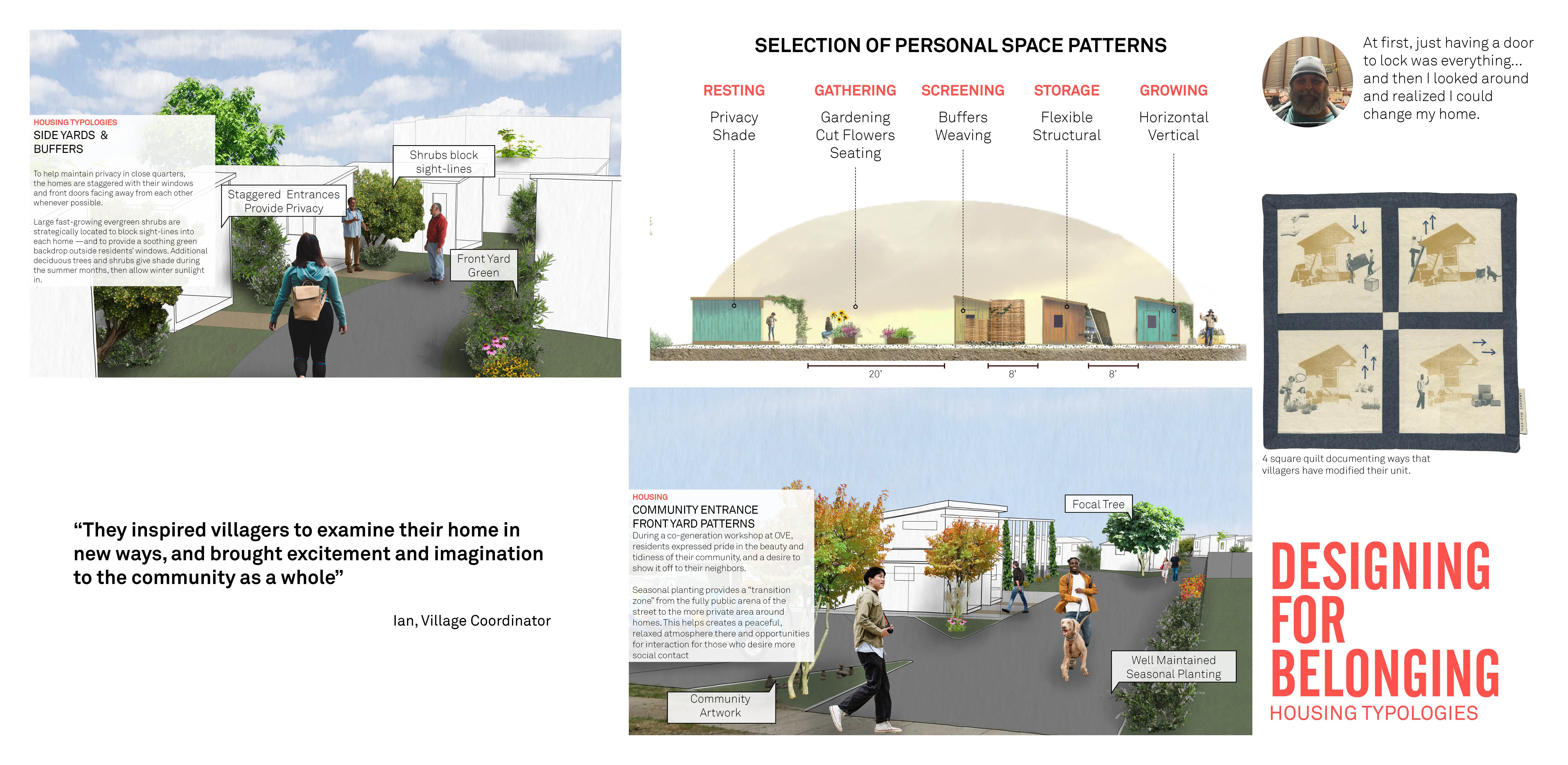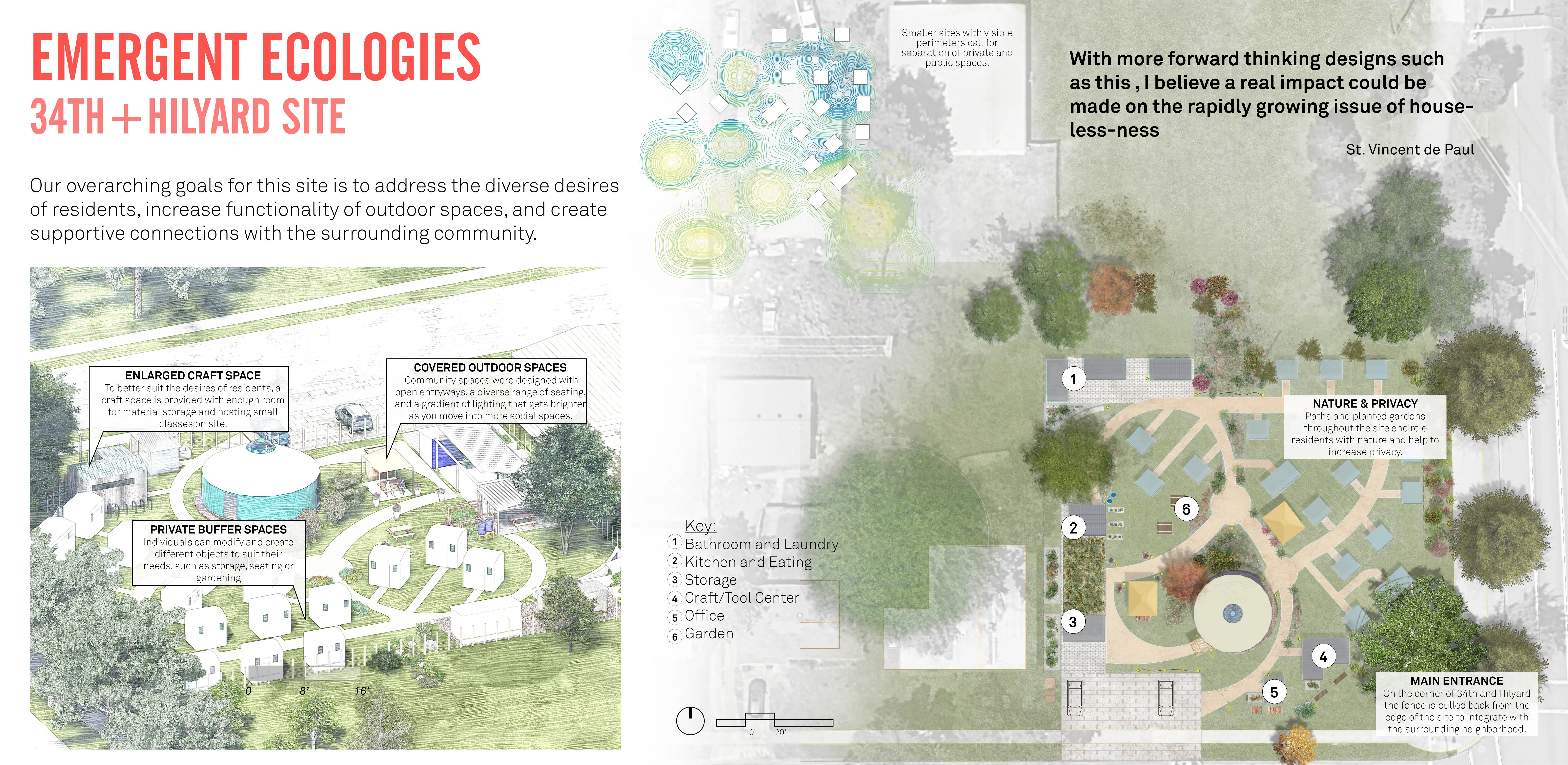 Houselessness is one of the defining crises of our time. The growing houseless crisis has affected 1 in 4 of us directly. As future landscape architects, we must use our unique ecological and cultural viewpoint to address this crisis. A real-world project, “From Shelter to Home” captures our year of work with Opportunity Village (OVE) a tiny home community for the otherwise houseless. With community partnership, we sought to understand how landscape architecture’s methods of inquiry, impact, and methods can help untangle the crisis. Our designs respond to daily routines, neighborhood concerns, and political, economic cultural practicalities. Construction planned for Fall 2023.