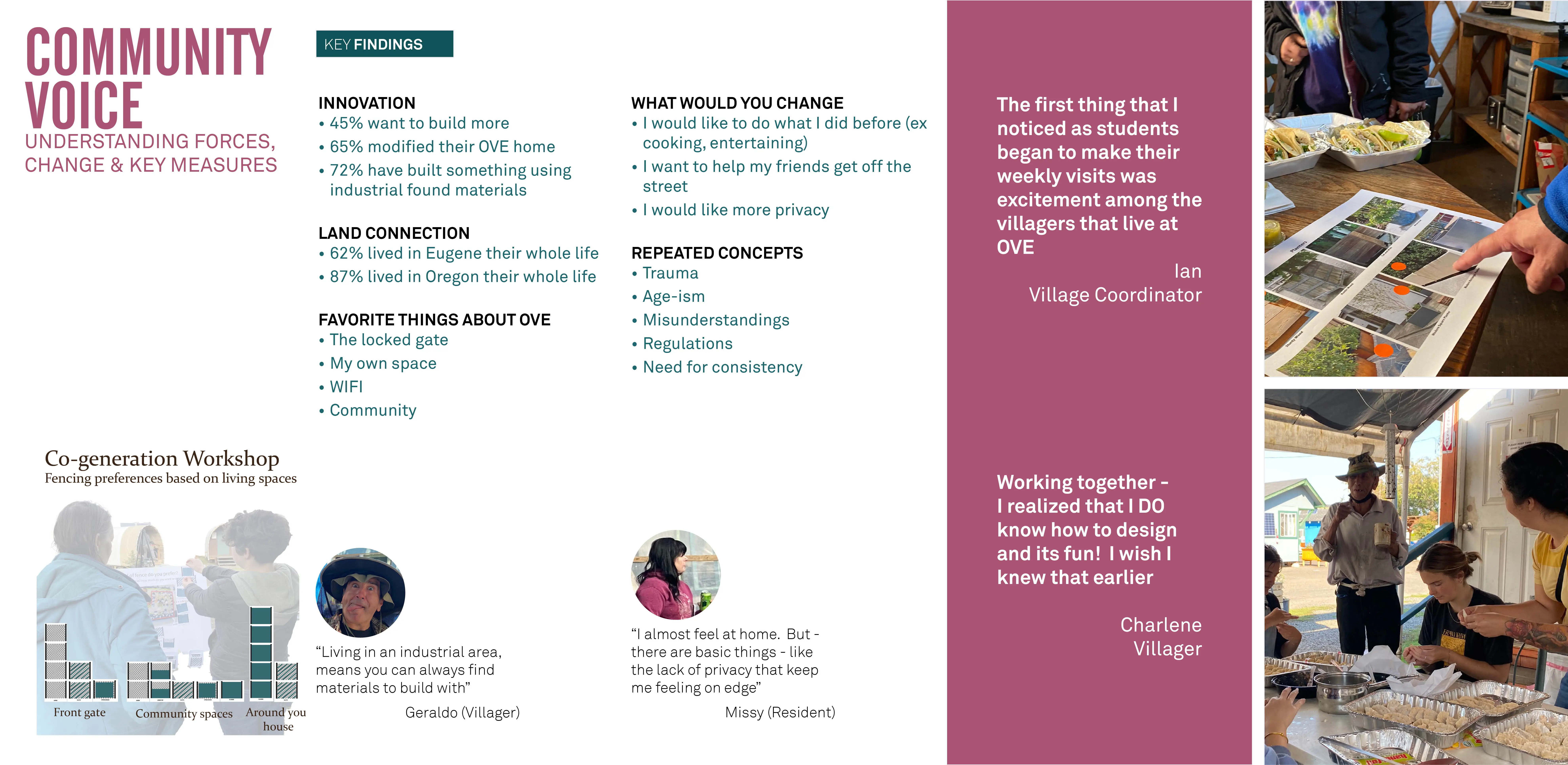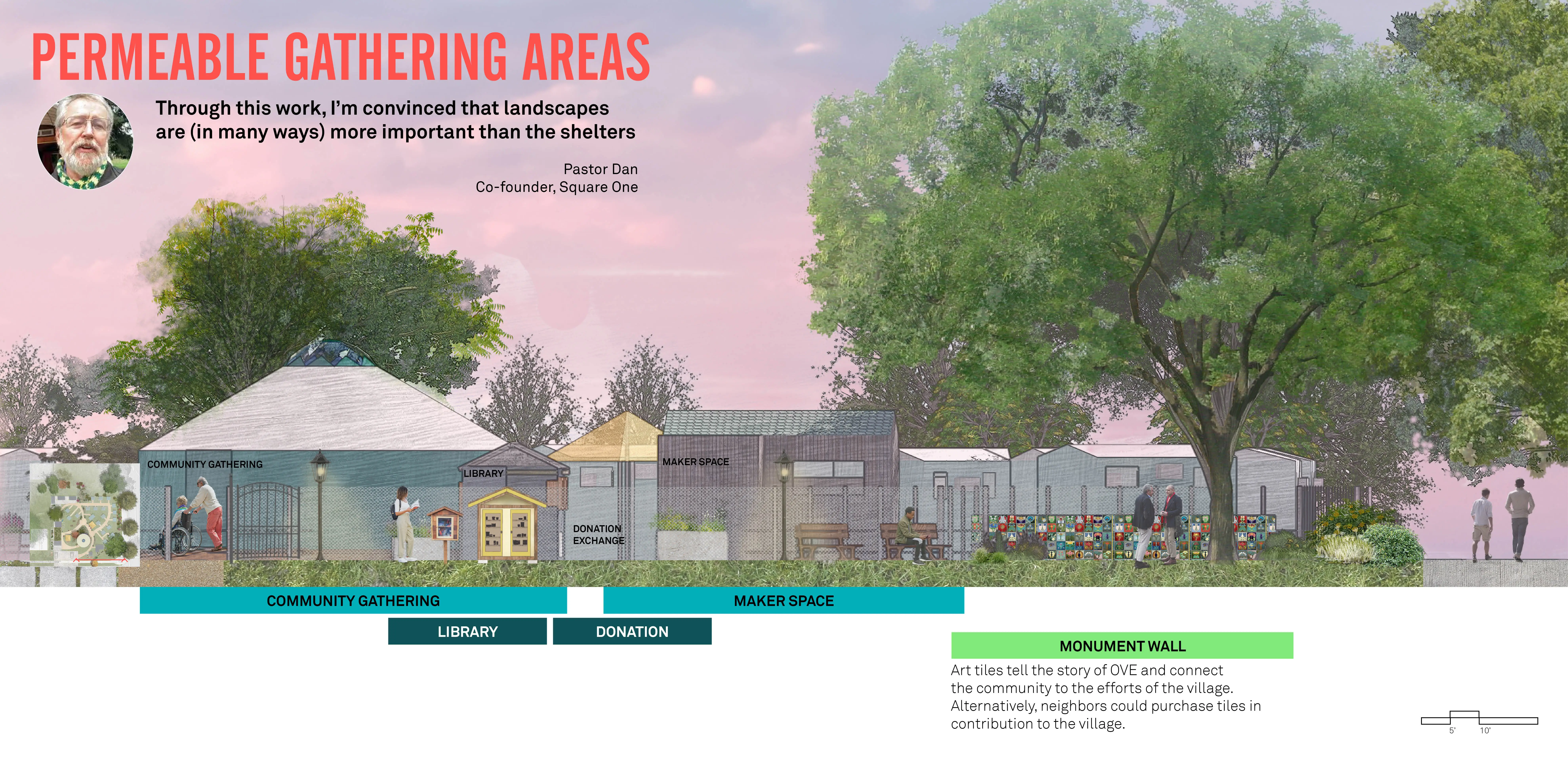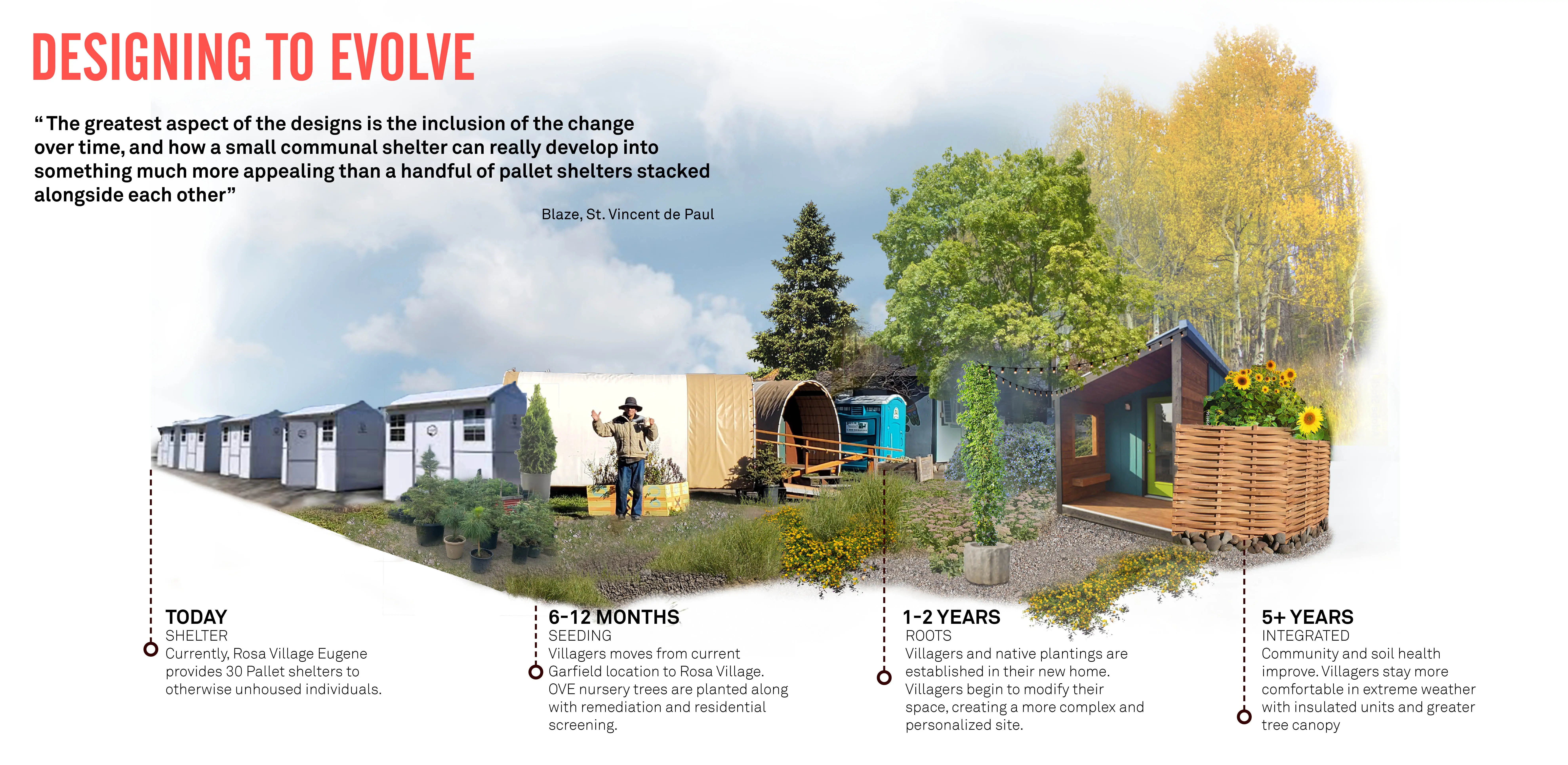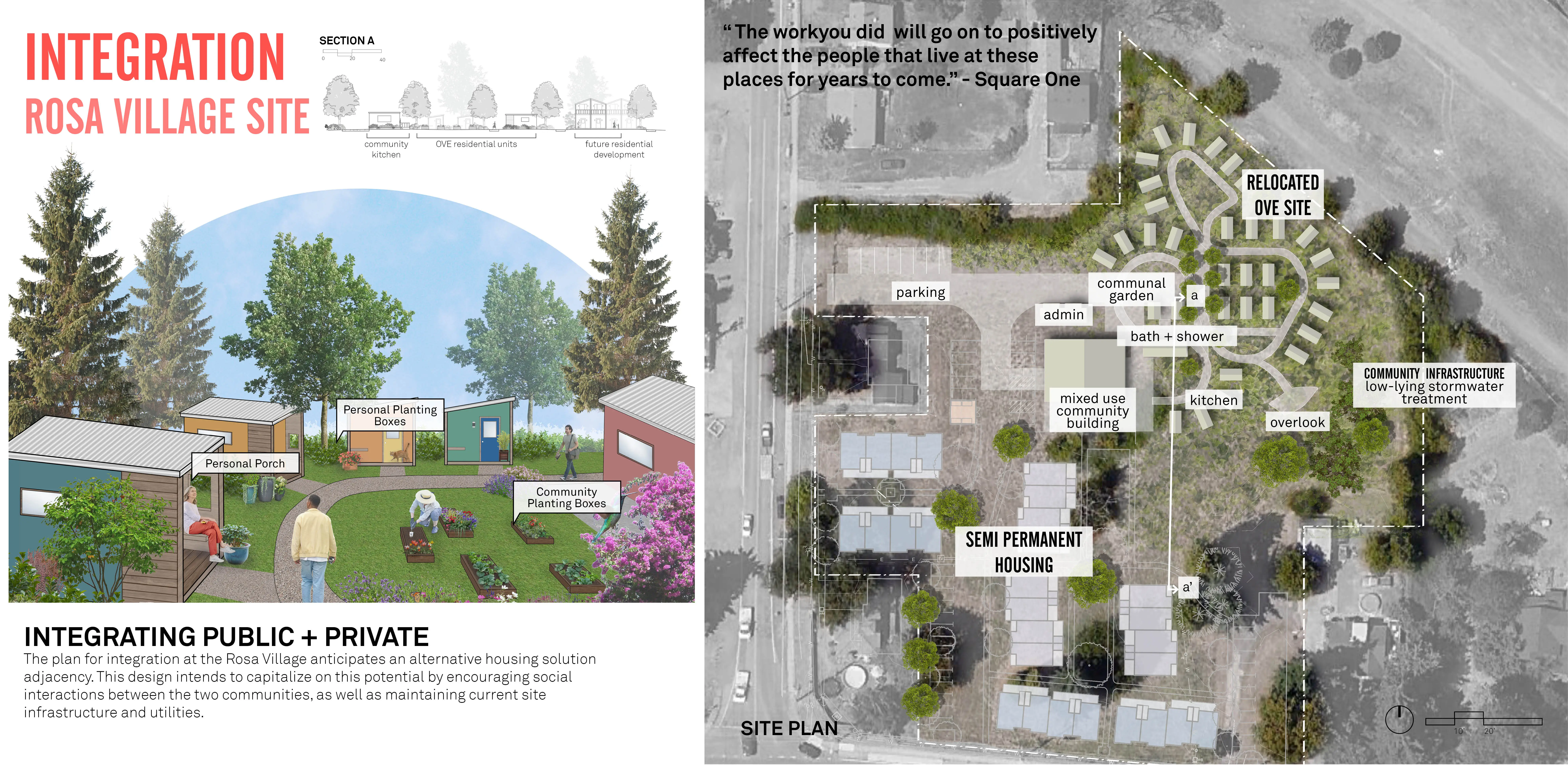 Houselessness is one of the defining crises of our time. The growing houseless crisis has affected 1 in 4 of us directly. As future landscape architects, we must use our unique ecological and cultural viewpoint to address this crisis. A real-world project, “From Shelter to Home” captures our year of work with Opportunity Village (OVE) a tiny home community for the otherwise houseless. With community partnership, we sought to understand how landscape architecture’s methods of inquiry, impact, and methods can help untangle the crisis. Our designs respond to daily routines, neighborhood concerns, and political, economic cultural practicalities. Construction planned for Fall 2023.