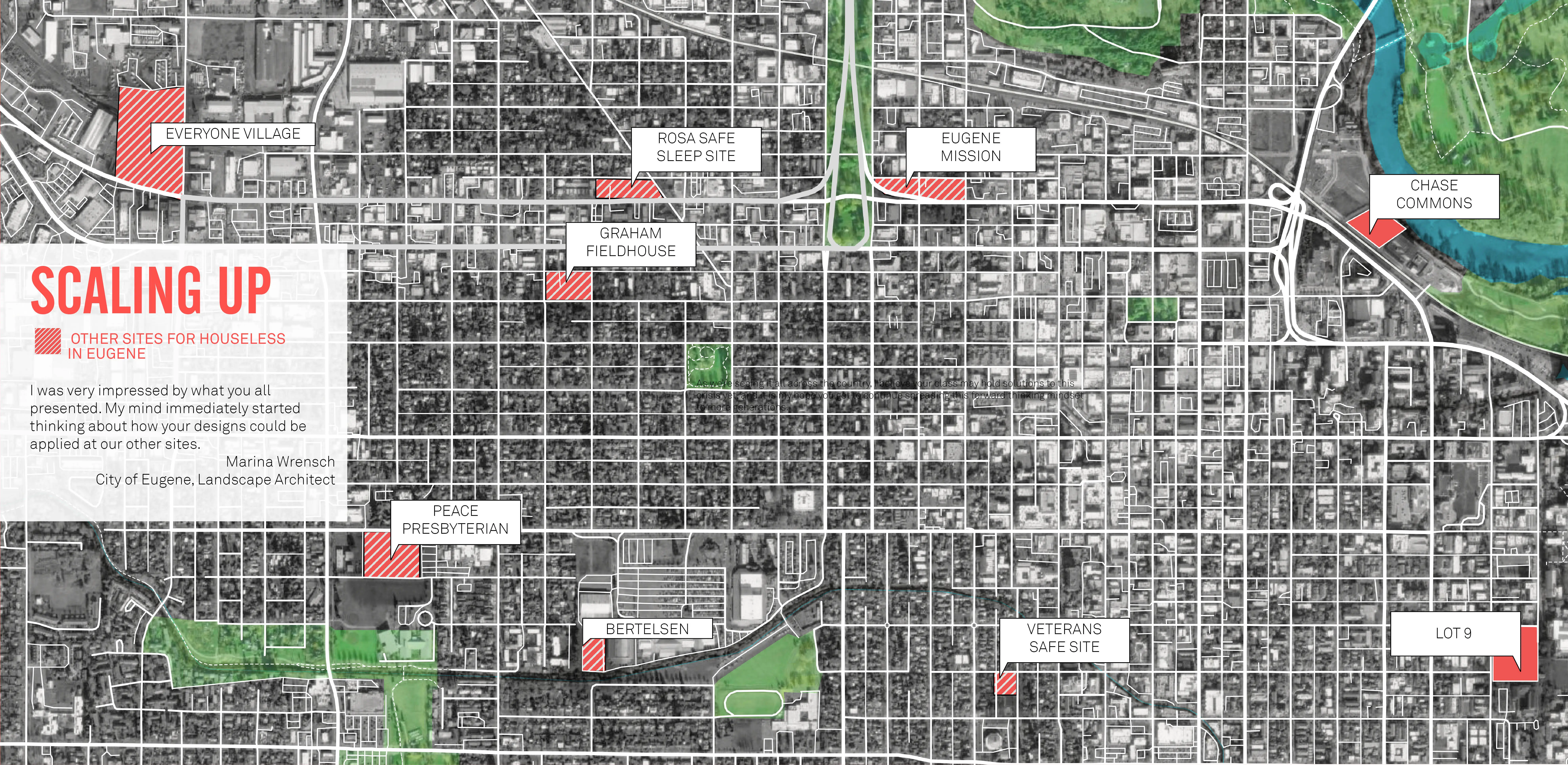 The lease is up. Opportunity Village Eugene (OVE), a tiny home community for otherwise houseless individuals and couples in Eugene must move the year. Located in Eugene’s (OR) industrial zone since 2011, Square One’s Opportunity Village is a unique collaboration between the housed and un-housed. Based on self-governance, partnership, and broad-based support, OVE has a unique approach to the houseless crisis. Our work this year considered how these values can manifest at the new site aesthetically, ecologically, culturally, and economically. We studied how the unique rhythm of a tiny home /gated/ formerly homeless community can inform new frameworks, synergies, cross-fertilization, and implications for landscape architecture.