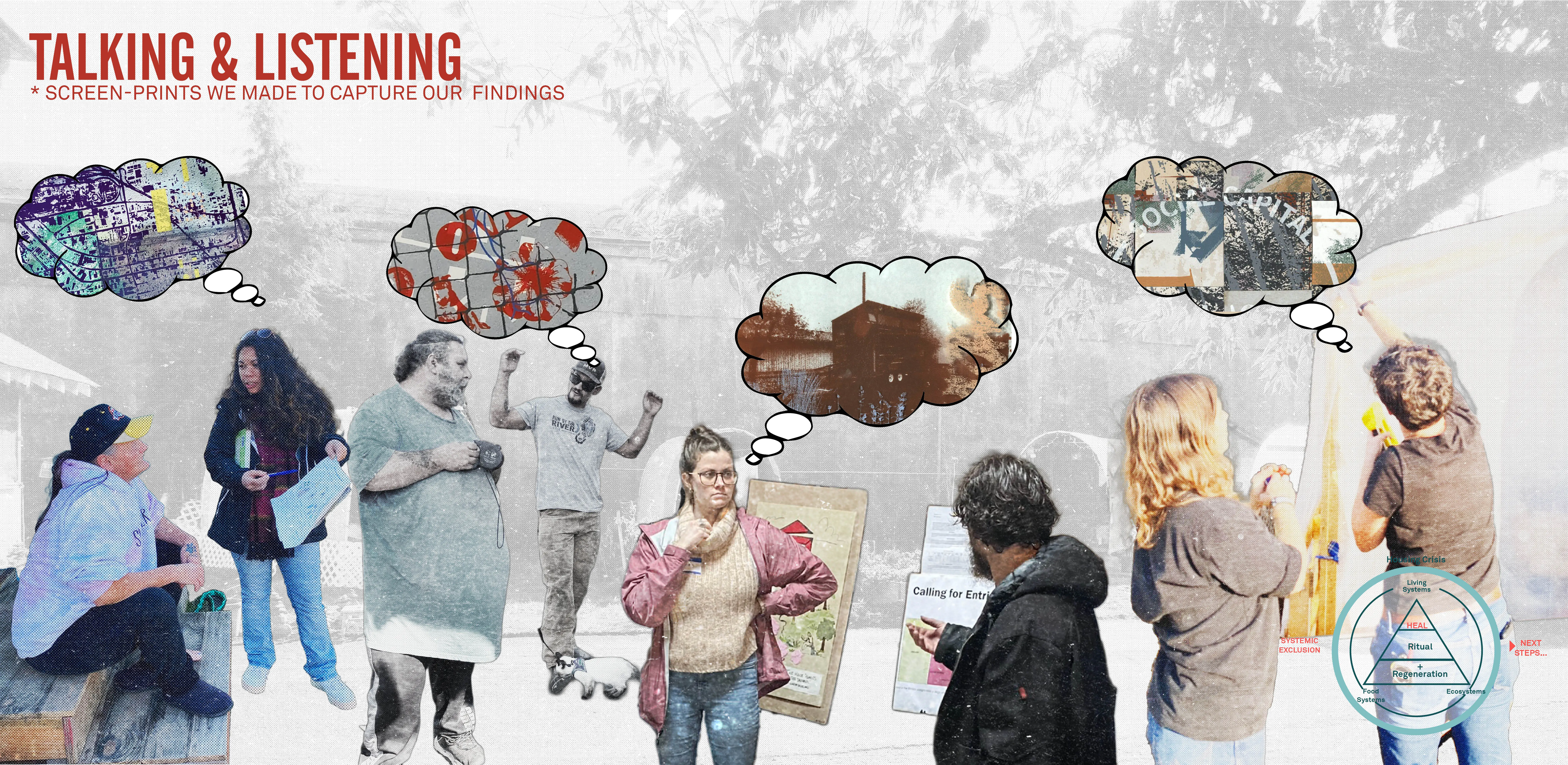 Our work started with engagement. We focused on building trust and understanding. Knowing how challenging and difficult engagement can be, especially in communities other than ours, we set up ground rules. We dedicated as much time as we could to being the village. We would “show up” the way one shows up to a friend’s houses – on time and remembering we were guests. We would put dignity and kindness first. We would be good friends, listen to their problems, and help them think of solutions. At a tactical level, we studied ideas in Design for Democracy (de la Pena et al, 2017) and revised them for the unique community characteristics. To allow for non-linear thinking and connections, we used screen prints instead of research papers to present our findings.