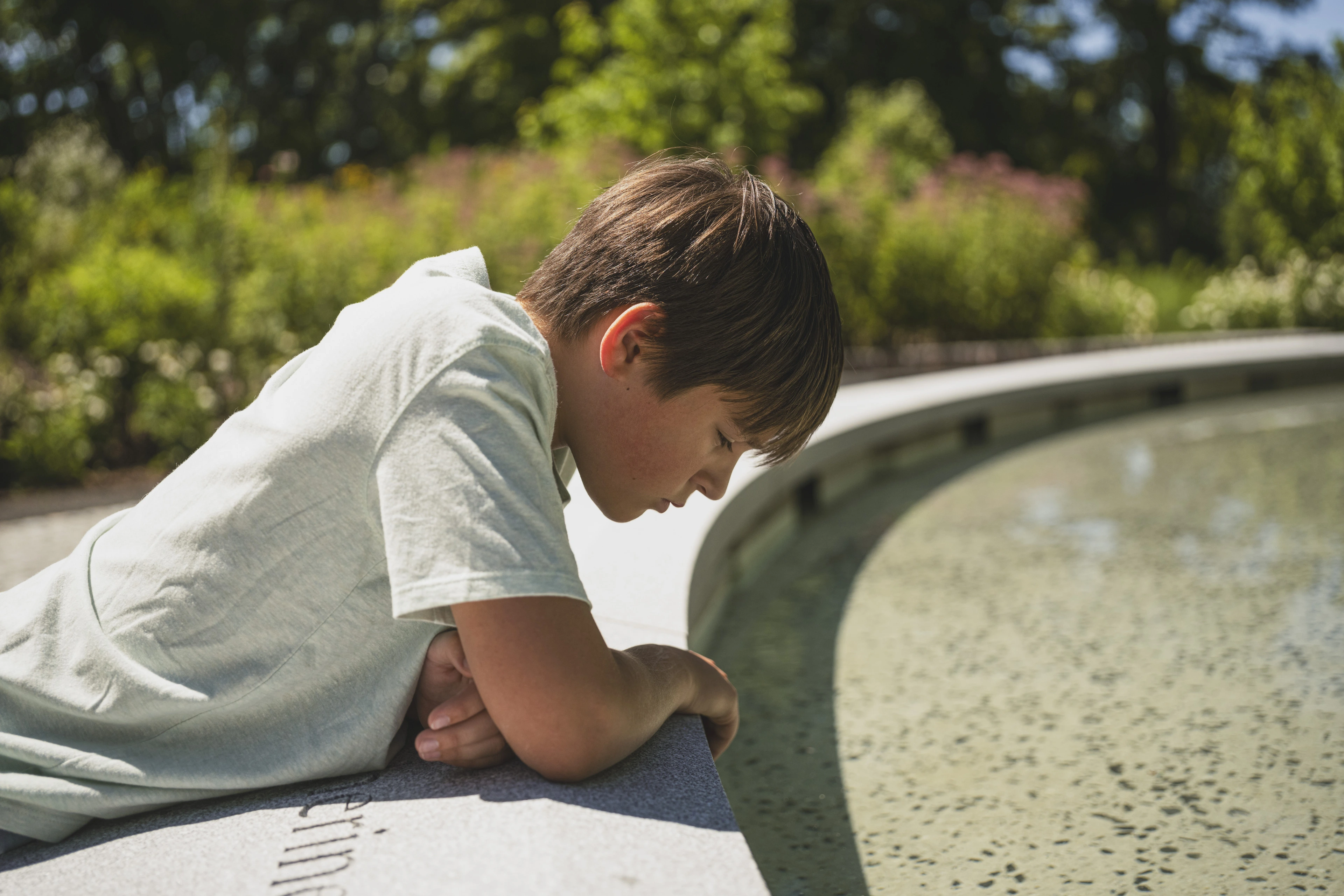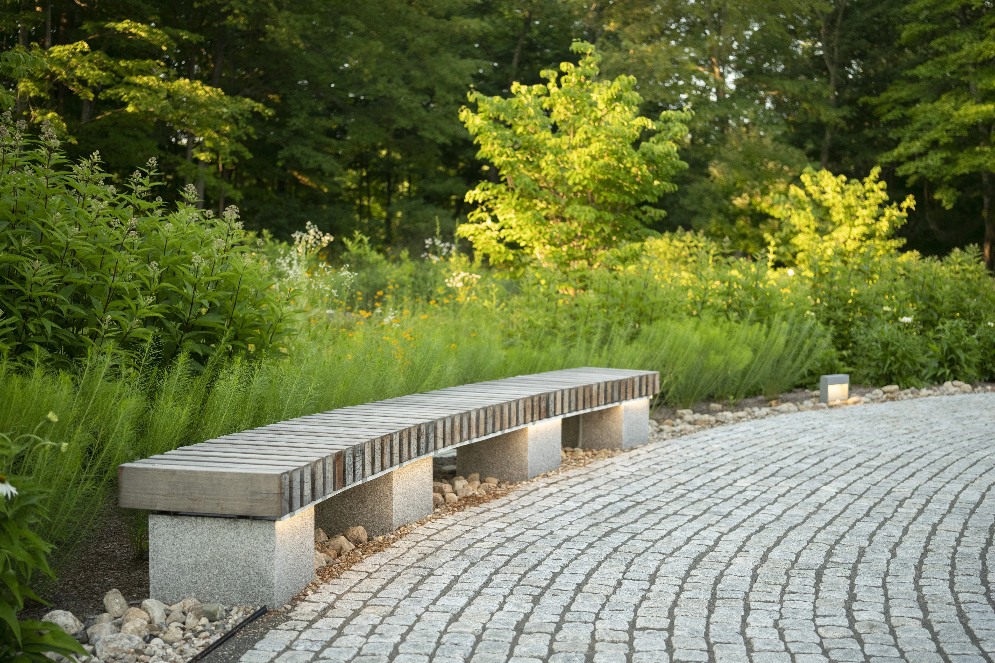 Signage is minimal, keeping visitors’ attention on the changing state of plantings, the water’s slow motion, the chirp and flutter of birds and insects, and a state of deep contemplation. In years to come, the sycamore will grow, its leaves broadening, shading the surrounding cobblestones. Walking along paths drawn in oblong, irregular lines, visitors move at their own pace and arrive at a collective center, honoring the roles of individuality and community in the process of grieving and remembrance.