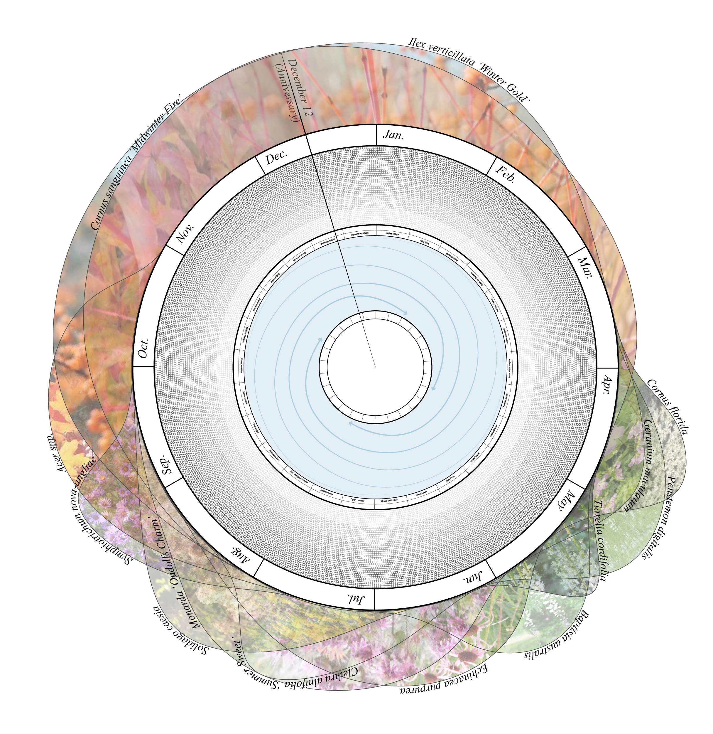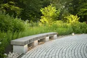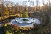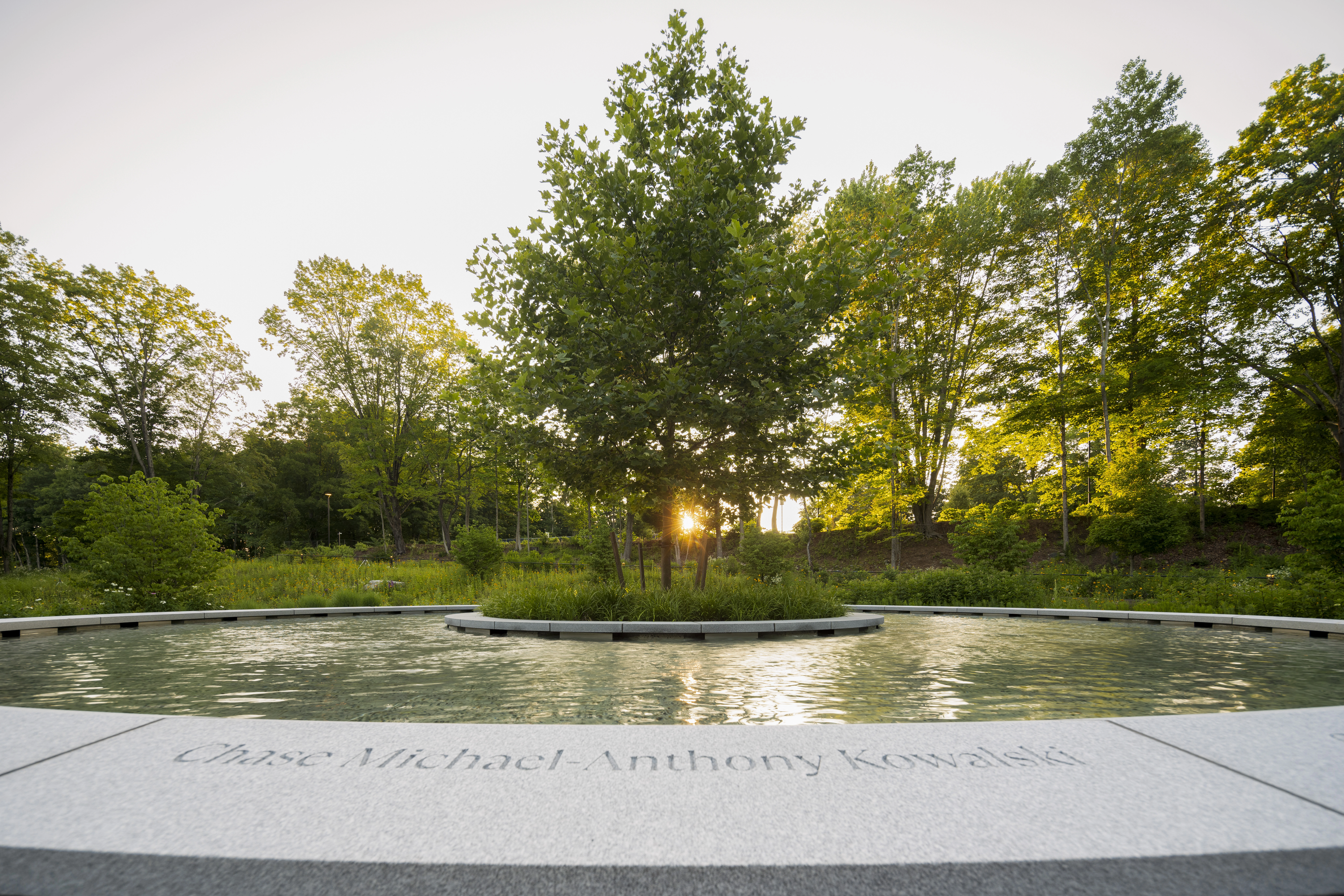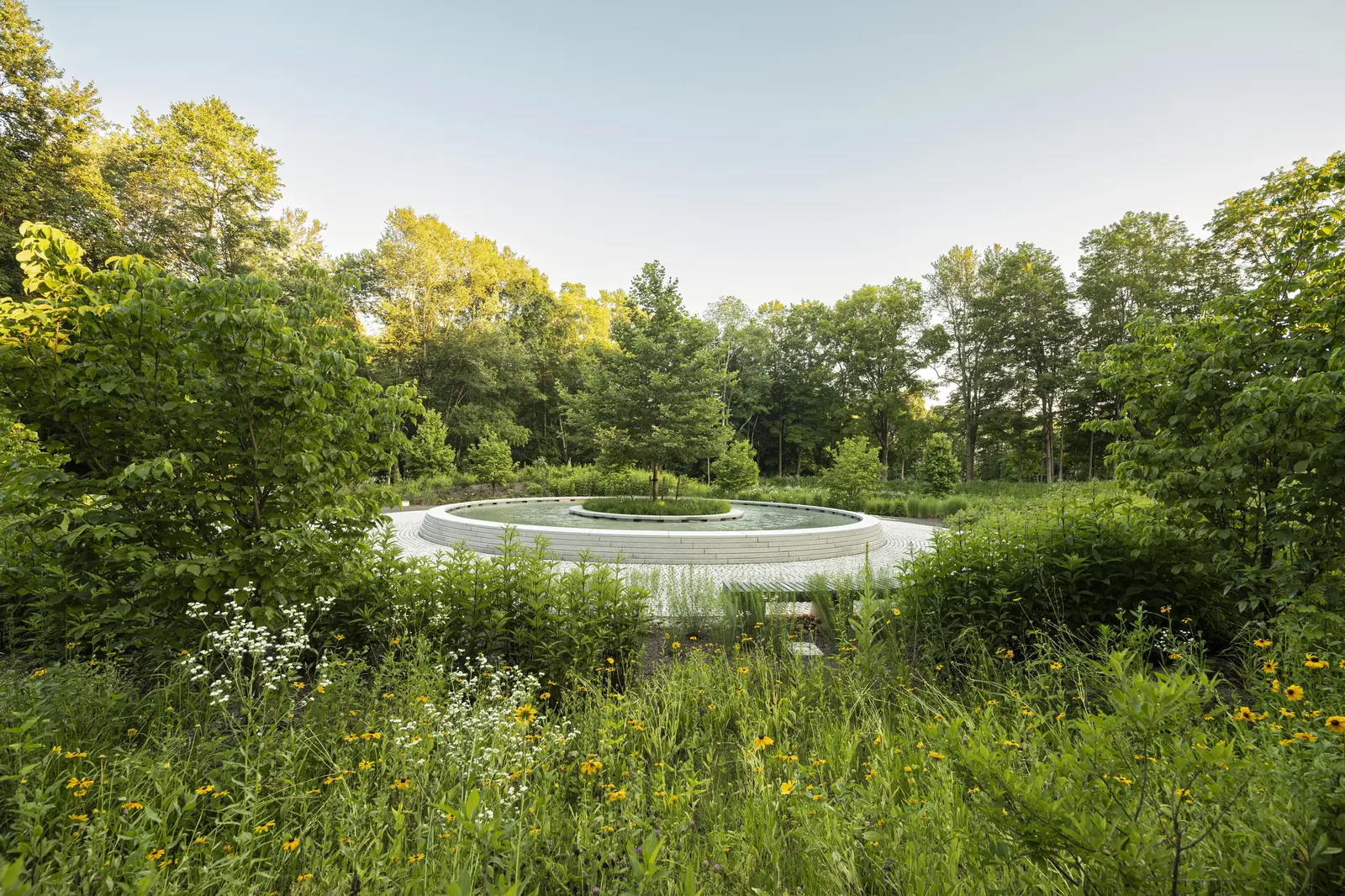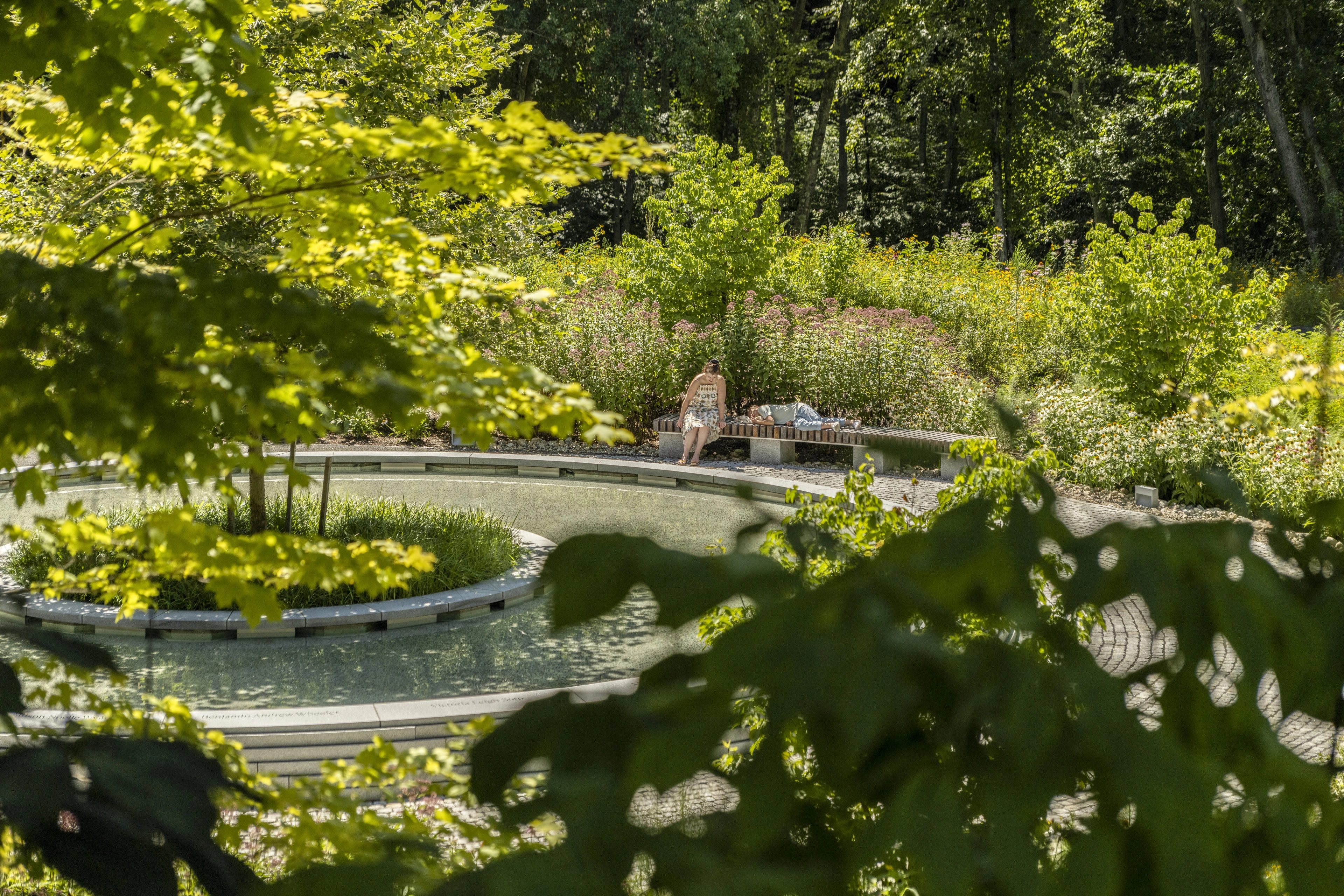 Known as The Clearing, the design takes a distinctly different approach from most contemporary memorials, focusing on nature rather than a static object. At its center, a young sycamore tree is situated within a low granite basin, its beveled edge engraved with the names of the deceased—a direct reference to life cycles as a parallel to grief, seasonally shedding and regrowing foliage. Barely perceptible until visitors approach, water flows counterclockwise toward the center of the fountain, moving in the opposite direction of the surrounding series of concentric paths, a gesture toward the nonlinear process of healing. In summer, the landscape bursts forth from sculpted mounds delineating the paths, selected for pollinator value and year-round texture and color: butterfly bushes, joe-pye weed, winterberries, rudbeckias, and more.