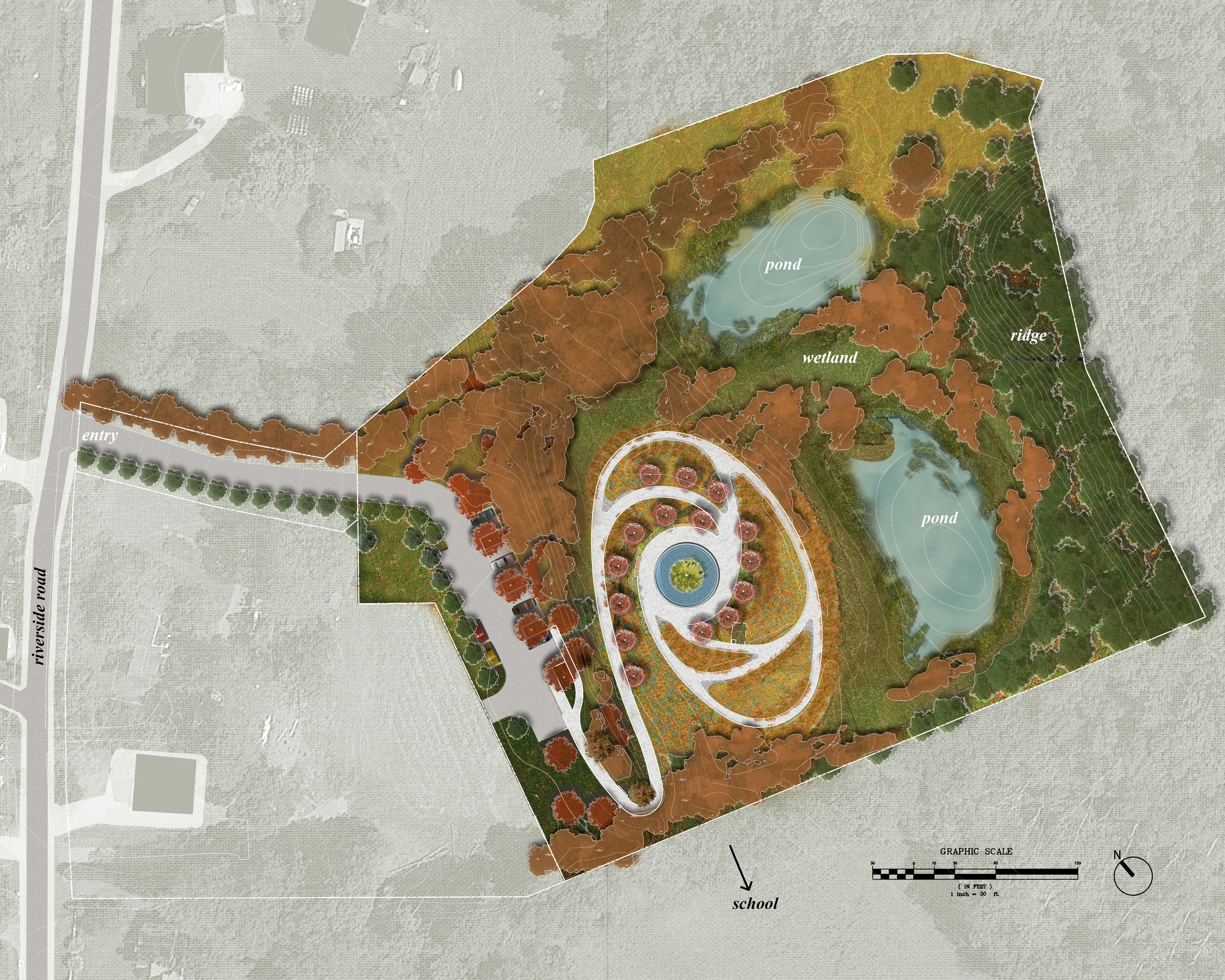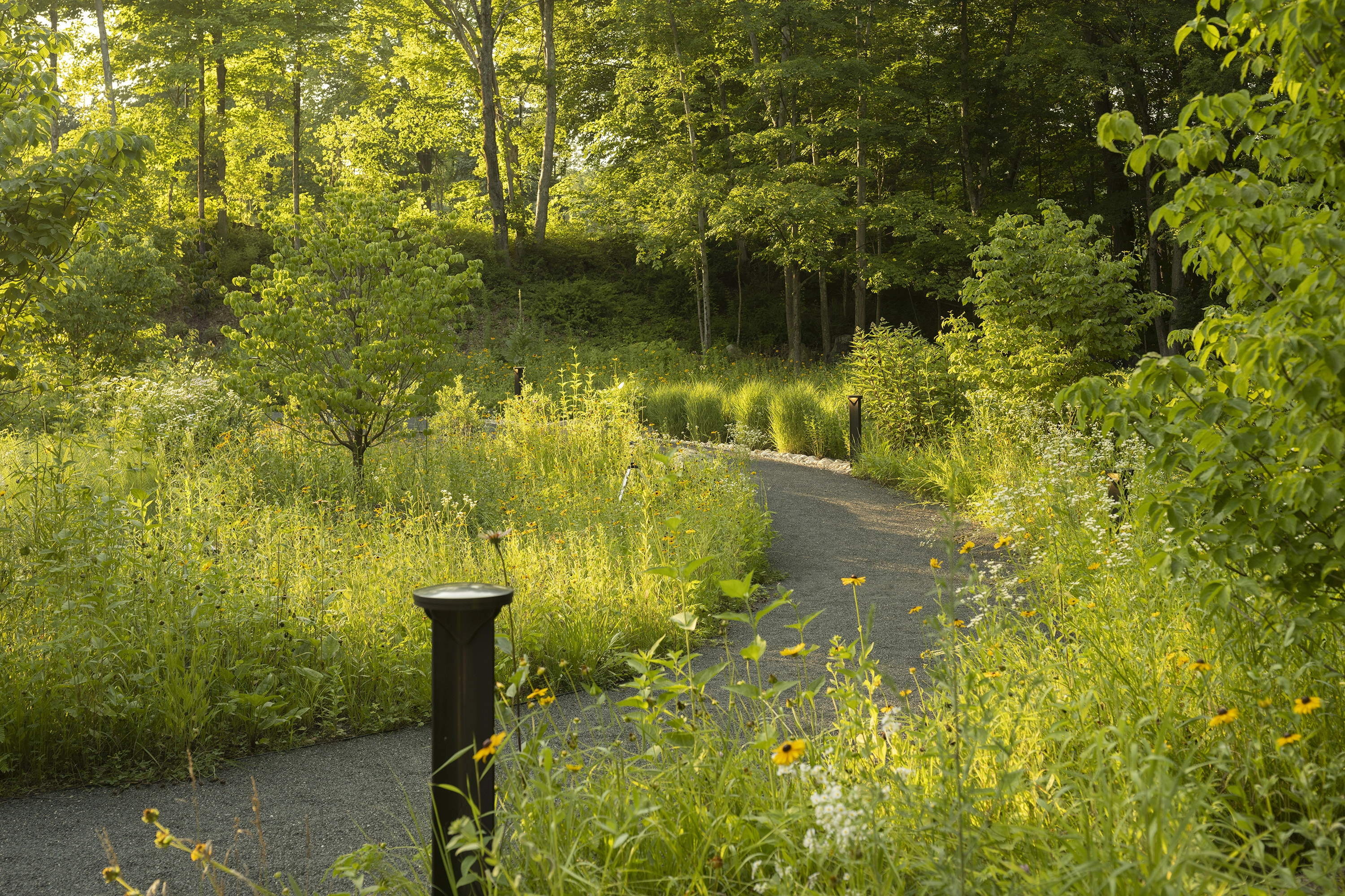 Closely developed alongside the commission and the childrens’ parents, the memorial is carefully woven into an existing clearing without damaging intact forest, planted almost entirely with native perennials sourced from rural Connecticut, built from local materials, and repurposing existing field stones throughout. Set at a topographic low point and enveloped in eastern hardwood forest, the site—a decommissioned Little League baseball field—was donated by a local athletic club and selected over more traditional civic settings for its privacy and meditative quality. Visible from the paths, two ponds located on the site were restored from a eutrophic state to attract wildlife and improve water quality.